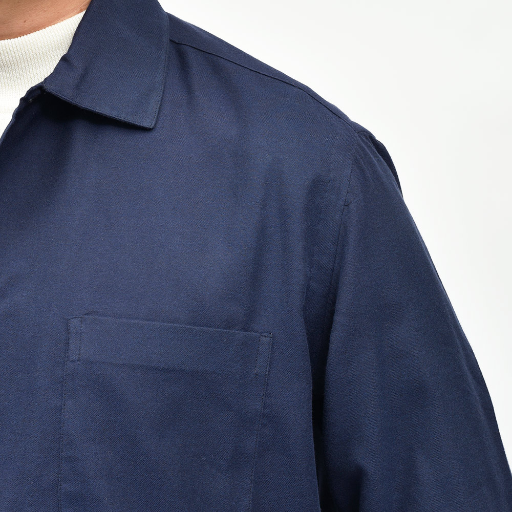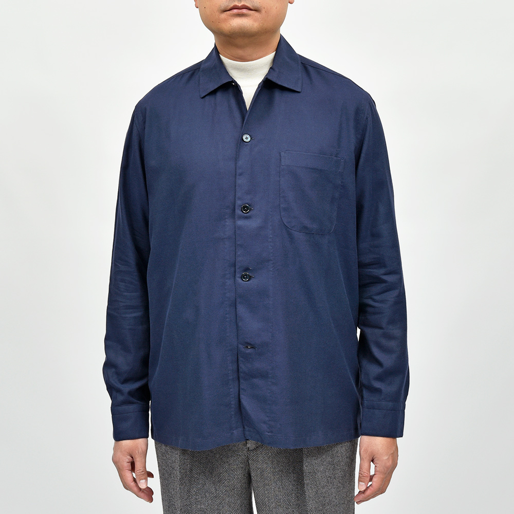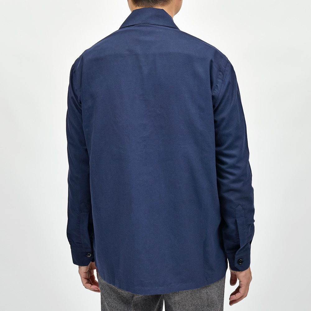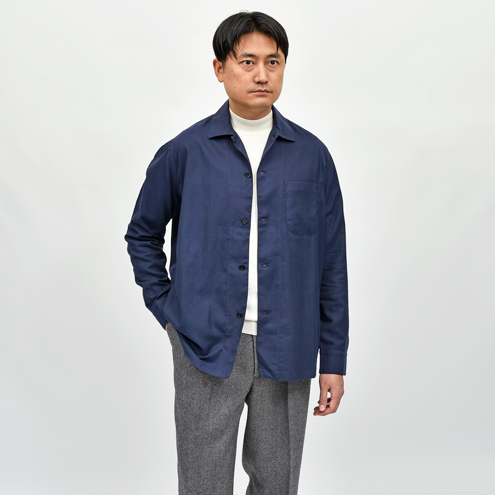 目付けの軽いコットンライトフランネルを使用したこちらは、シャツの着心地でありながらもジャケットライクに見えるデザイン。全体的にゆとりを持たせたフィッティングに、フロント部分の仕立てやボタンの数や大きさで羽織物としての佇まいを作り上げています。また、裏前立てや、袖付けの縫い代はハンドで仕立てられており、ナポリブランドの拘りが感じられる一着となっています。