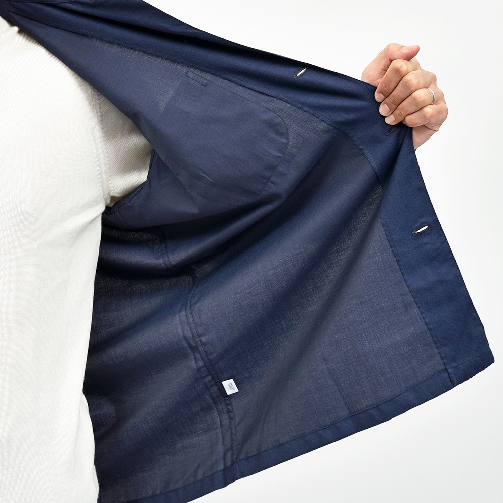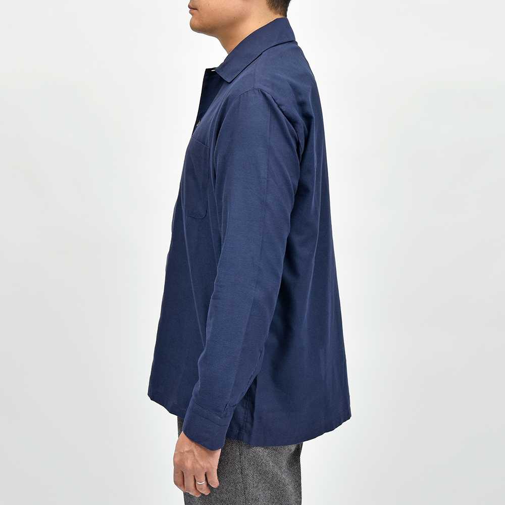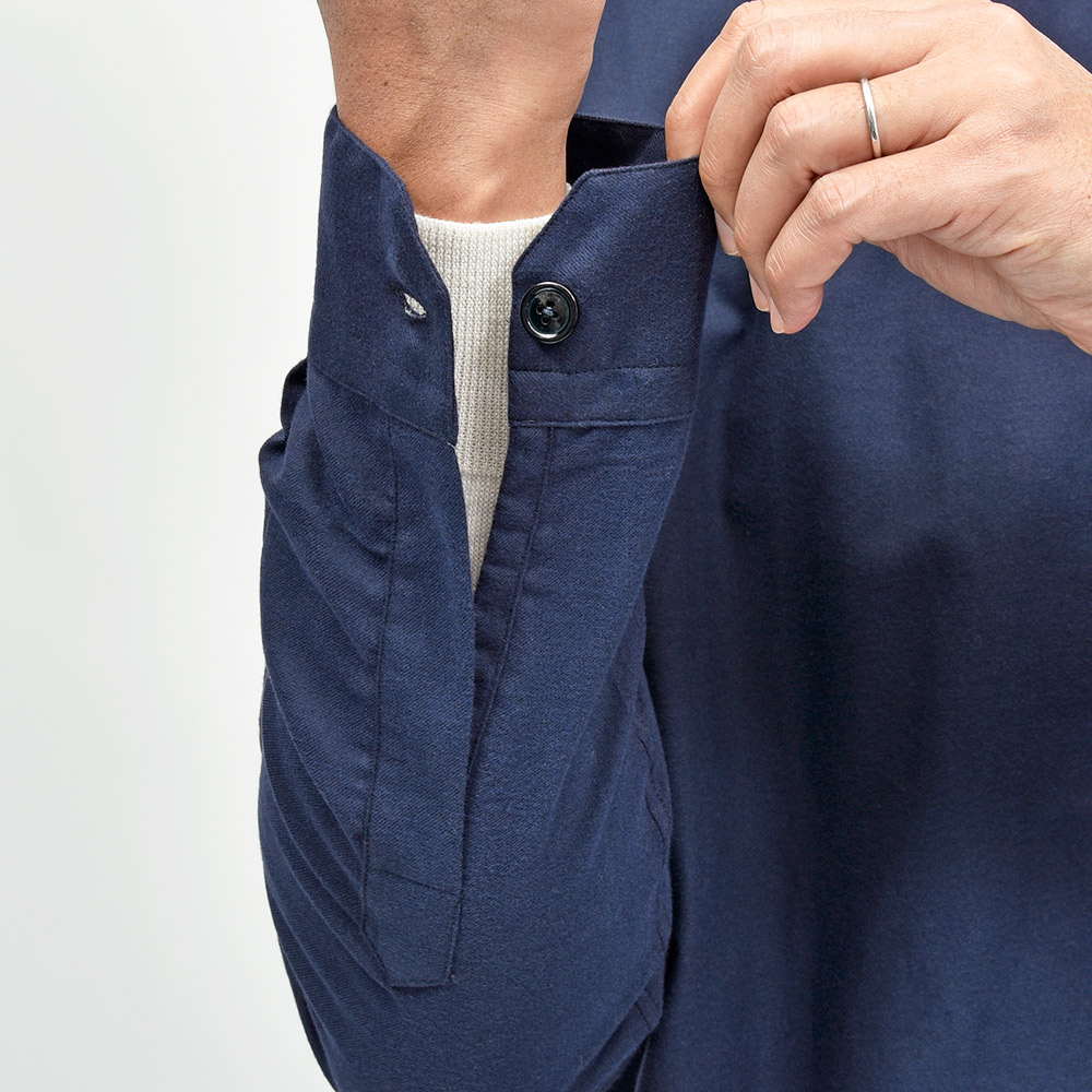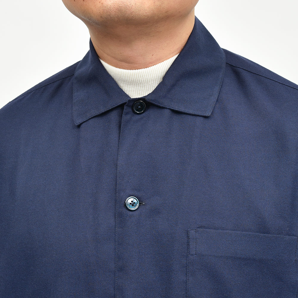 目付けの軽いコットンライトフランネルを使用したこちらは、シャツの着心地でありながらもジャケットライクに見えるデザイン。全体的にゆとりを持たせたフィッティングに、フロント部分の仕立てやボタンの数や大きさで羽織物としての佇まいを作り上げています。また、裏前立てや、袖付けの縫い代はハンドで仕立てられており、ナポリブランドの拘りが感じられる一着となっています。