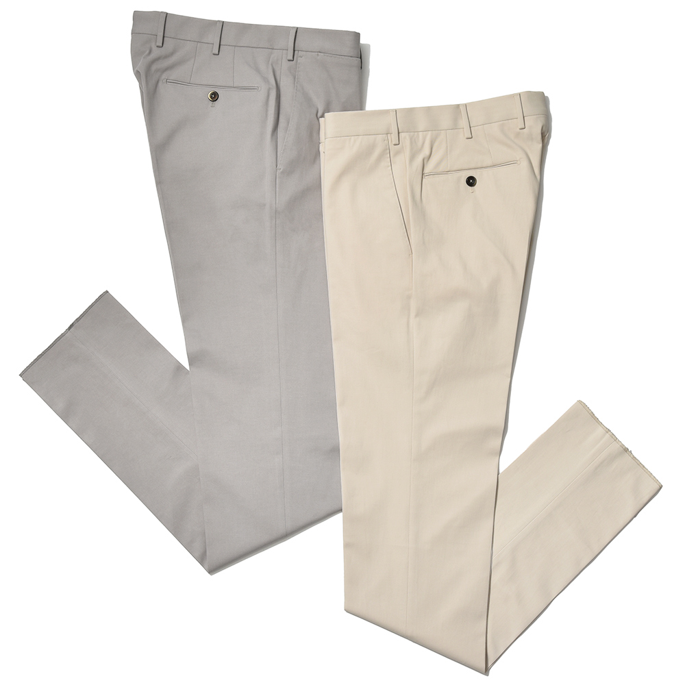 目付け270gと軽いウエイトのウールサキソニーは、滑らかで美しい艶感がリッチな表情。ウエイトも軽く、起毛感もほどほどなので、秋口から春先まで活躍してくれる一着です。また、しなやかな生地感による美しいドレープも見逃せません。