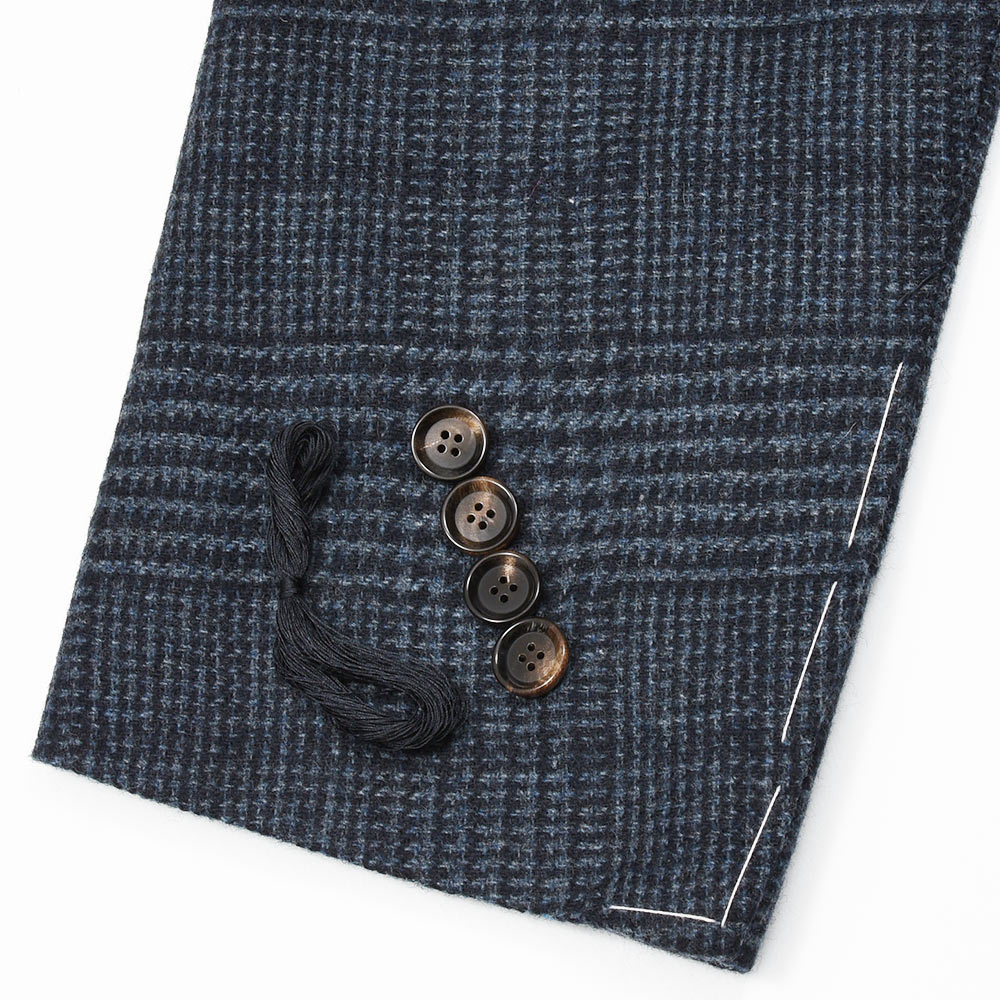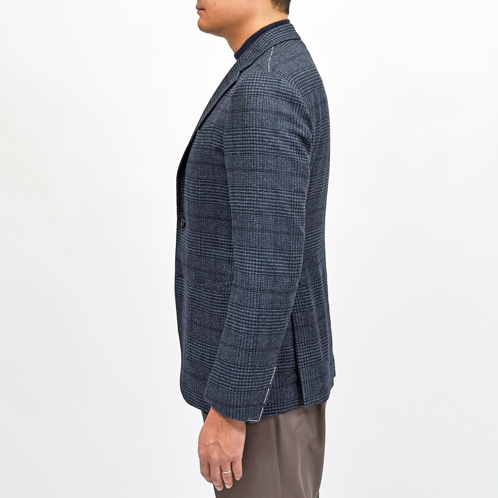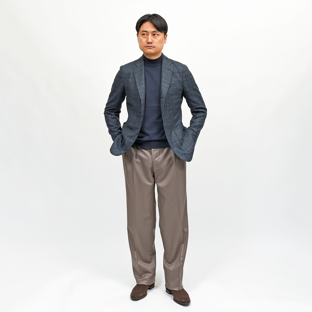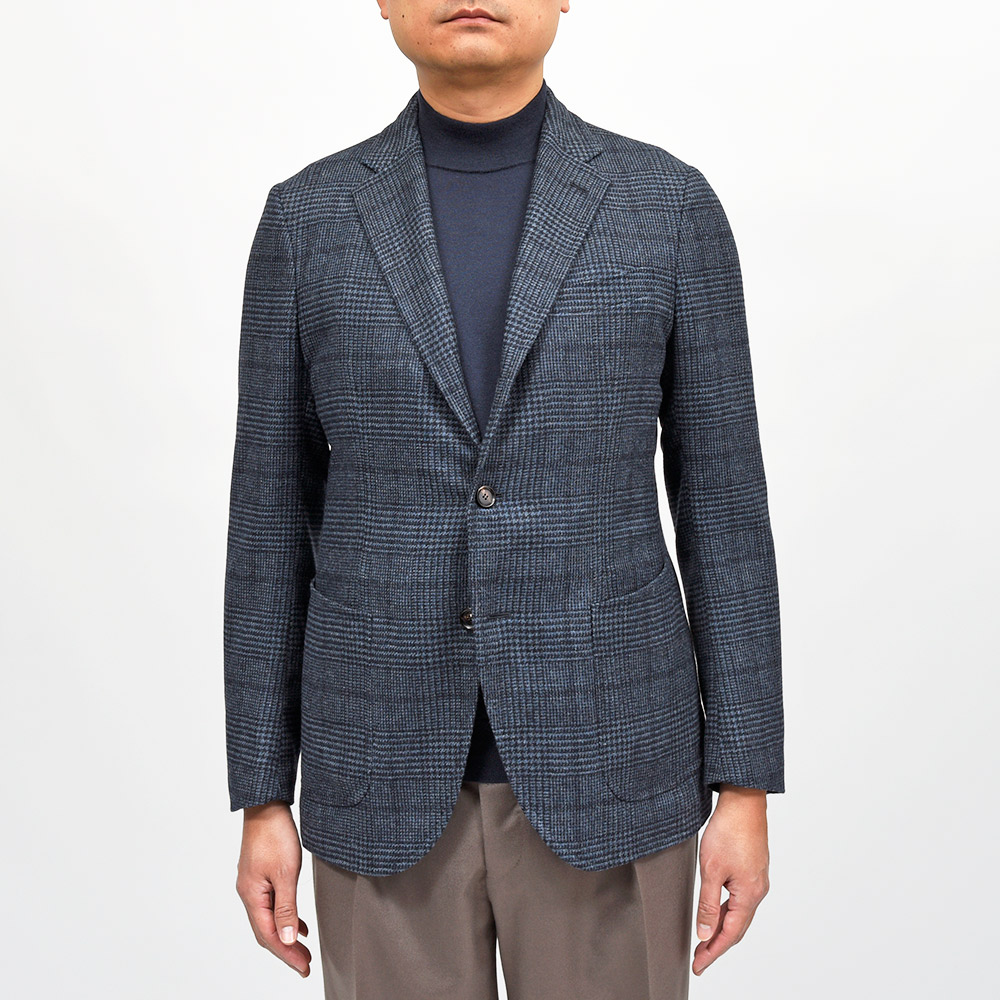 秋冬ではやや軽い目付け290gのグレンチェックジャケットは、ヴァージンウール×カシミヤの贅沢な素材使い。ヴァージンウールの滑らかな光沢感に、カシミヤのふんわりと柔らかなタッチがクラス感のある佇まいです。また、副資材をほとんど省いた段返り3つボタンシングルジャケットのニューモデル“GINZA”を採用。裏地も袖裏のみと非常に軽やかでありながらも、アンコンジャケットとは思えないエレガントな姿を作り上げてくれます。