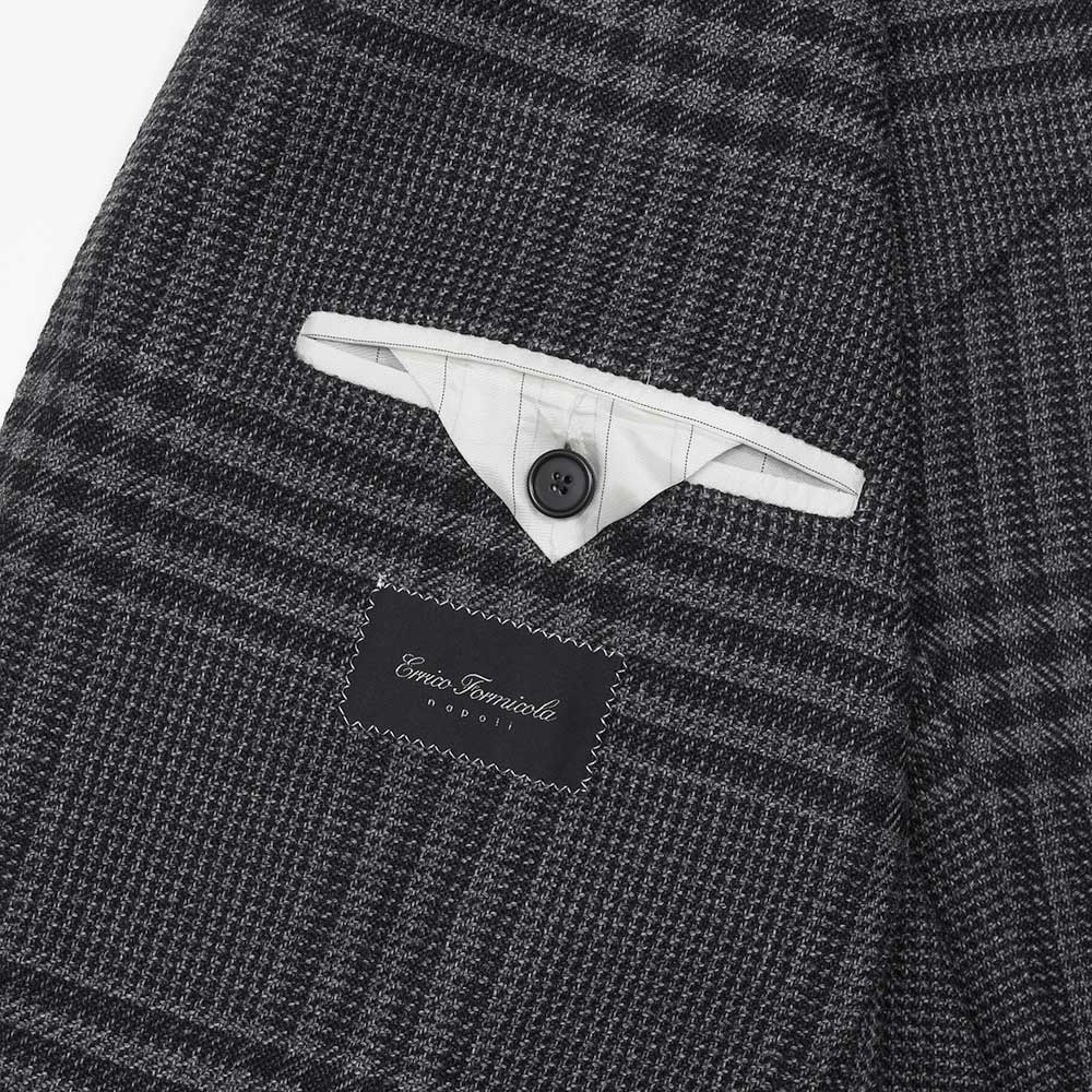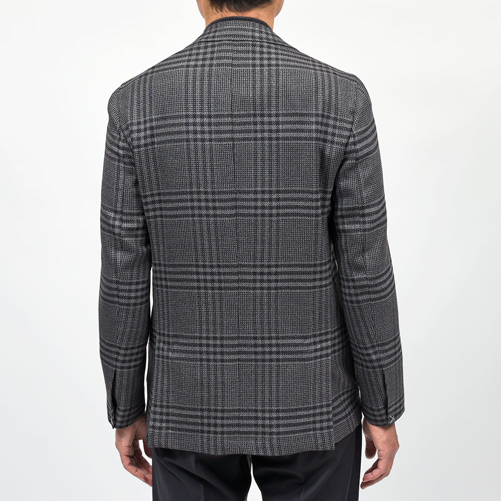 目付け395gのウール素材を使用したグレンチェックジャケット。少しドライなタッチのファブリックを使用しており、真夏以外の3シーズンで着用することができます。また、ほのかなストレッチ性に、グレー×ブラックのグレンチェックはシックな印象でモダンな佇まいを生んでいます。