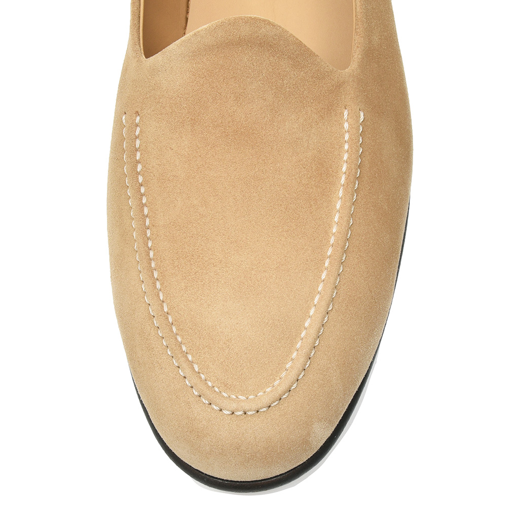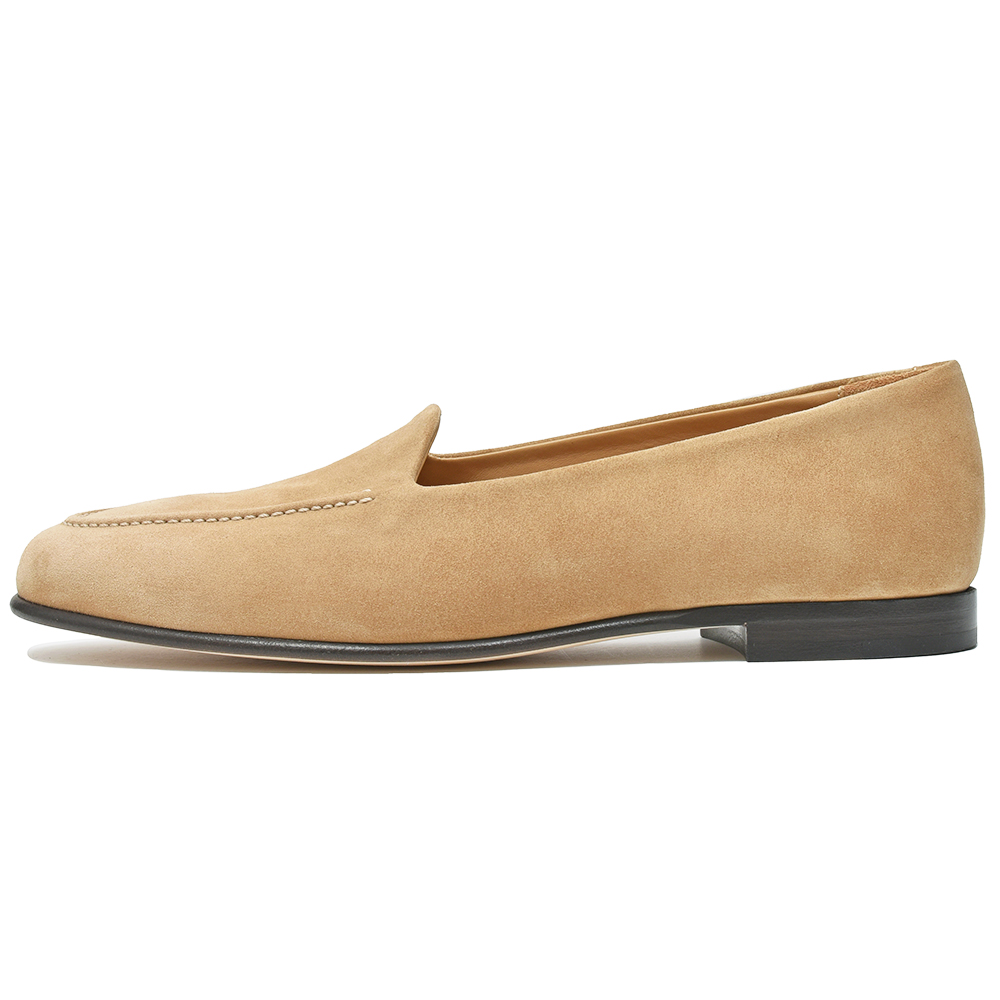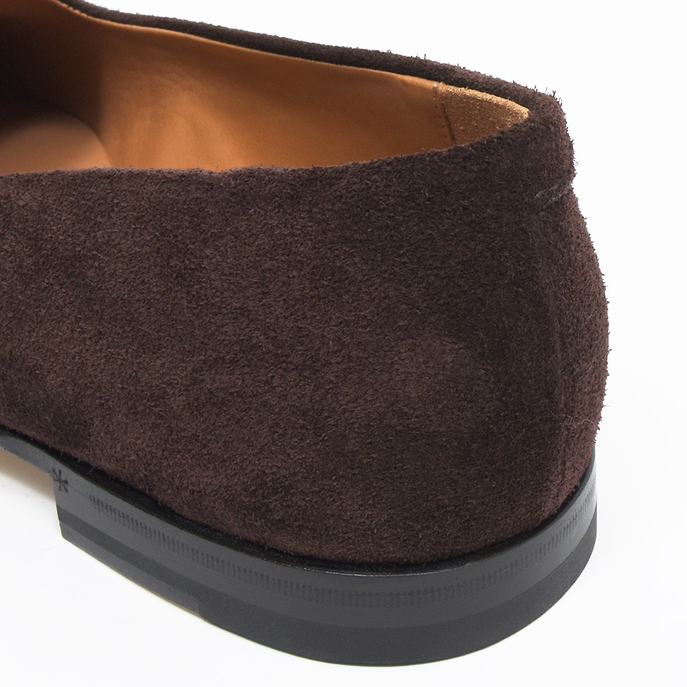 80年代のクラシックなローファーにインスピレーションを得たモデル“MOCASSO LOAFER”。セメント製法を用いることで丸みを帯び、足の甲の部分を露出させたスッキリとしたデザインが特徴です。独特な湾曲した履き口は足入れを滑らかにし、歩行中に踵をホールドする硬いヒールカウンターと、ヒールグリップにスエード素材を使用することで踵が抜けにくく非常に歩きやすい作り。また、アッパーの隠れた補強剤や、つま先に入れた柔らかいパフ、インソールレザーにはパッド入りのフットベッドといった、日常的に履きやすい快適性が確保されています。