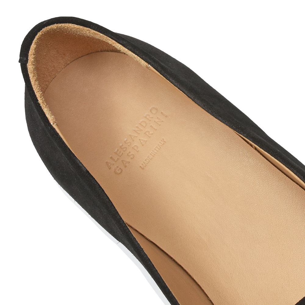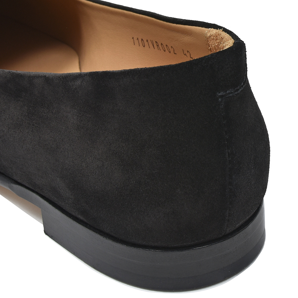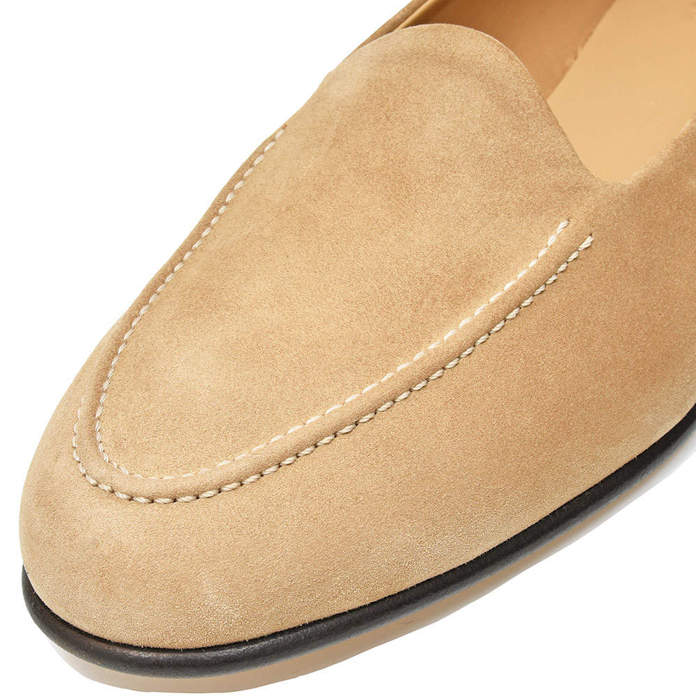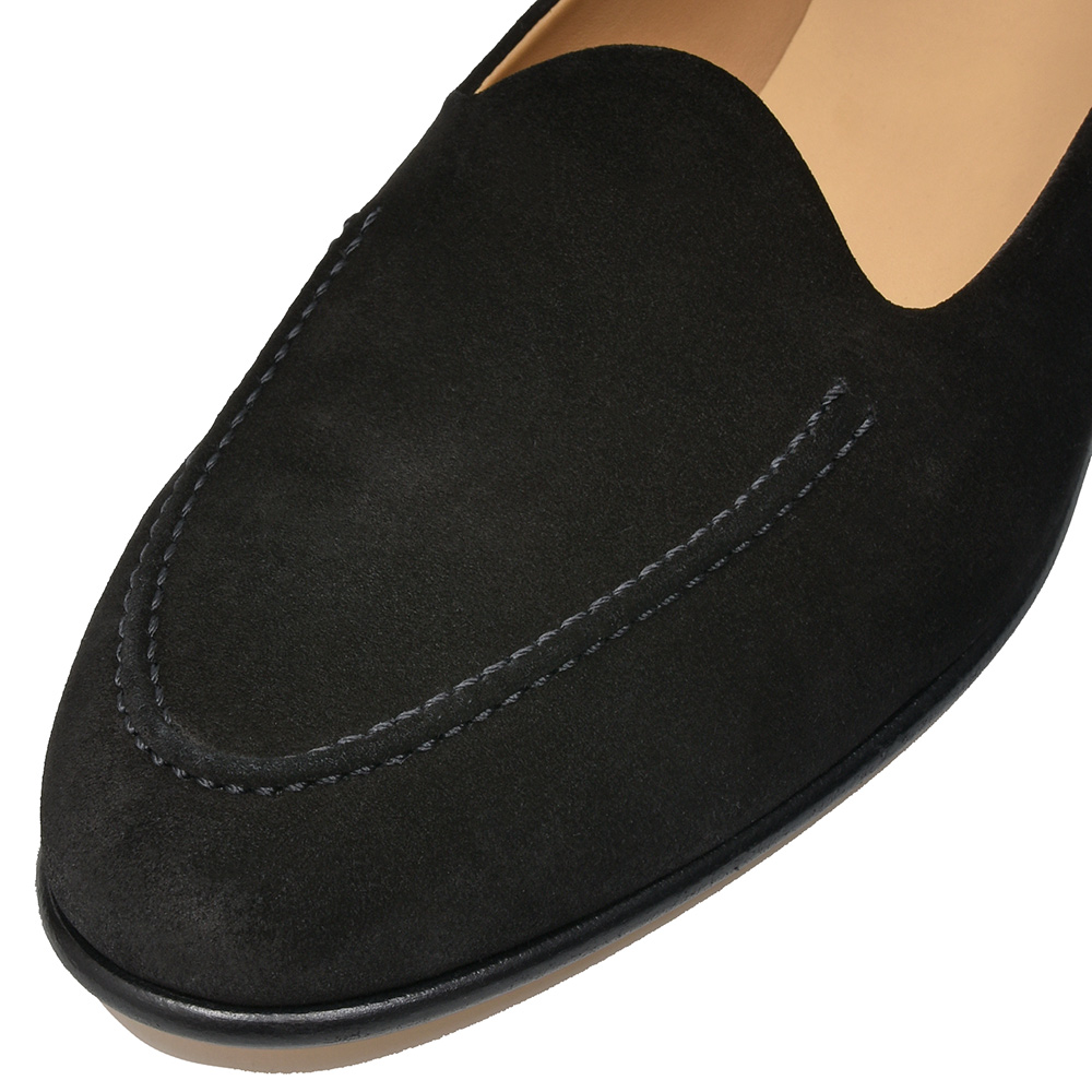 80年代のクラシックなローファーにインスピレーションを得たモデル“MOCASSO LOAFER”。セメント製法を用いることで丸みを帯び、足の甲の部分を露出させたスッキリとしたデザインが特徴です。独特な湾曲した履き口は足入れを滑らかにし、歩行中に踵をホールドする硬いヒールカウンターと、ヒールグリップにスエード素材を使用することで踵が抜けにくく非常に歩きやすい作り。また、アッパーの隠れた補強剤や、つま先に入れた柔らかいパフ、インソールレザーにはパッド入りのフットベッドといった、日常的に履きやすい快適性が確保されています。