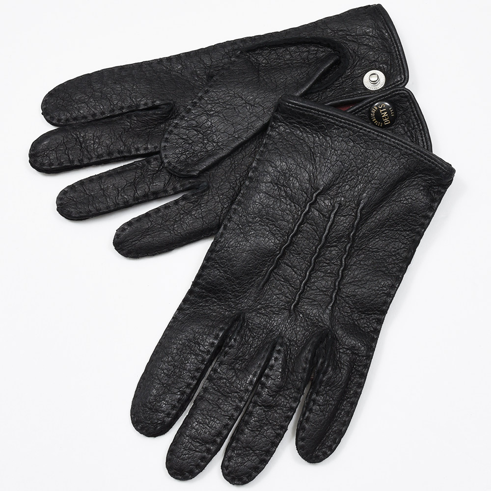 高級とされるペッカリーレザーを使用。ペッカリーレザーといえば”DENTSのグローブ”と言われるほどの代名詞となっています。ペッカリーレザーは軽くて丈夫、摩擦にも強く通気性も良い革と言われ、着用してみると伸縮性に優れ独特の柔らかさと風合いがあります。これは他の革では決して真似する事が出来ず、感覚の鋭い人間の手で使用するグローブに最も適した素材はペッカリーとゆう結論に至ります。 DENTSにのみ許されたフィット感は、マスターカッターと言われる熟練の職人による技術と経験によるところが大きく、DENTSのグローブが『第二の皮膚』と云われる所以がそこにあります。