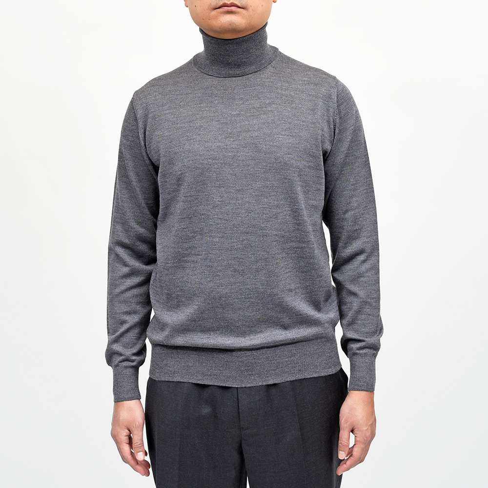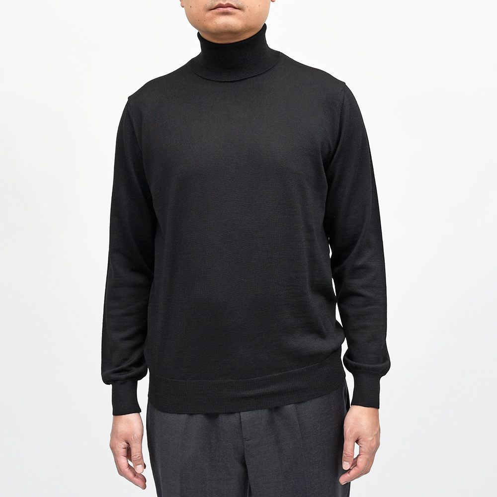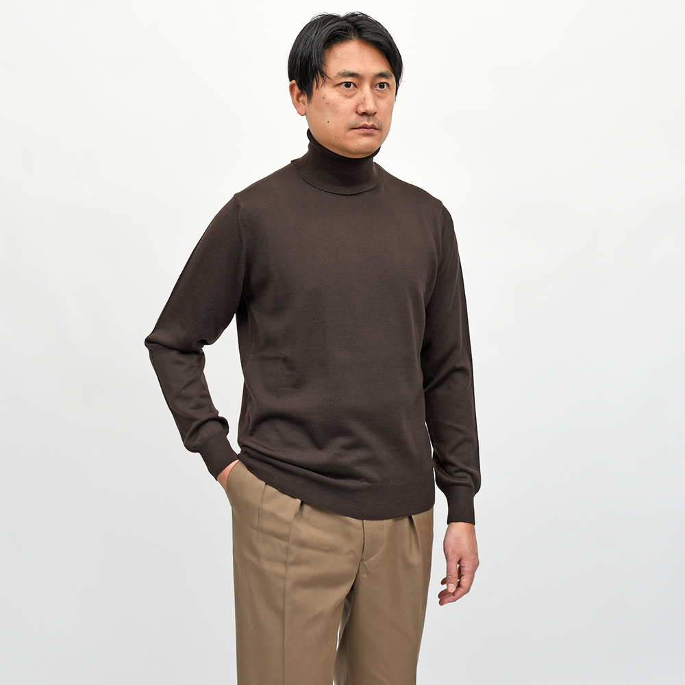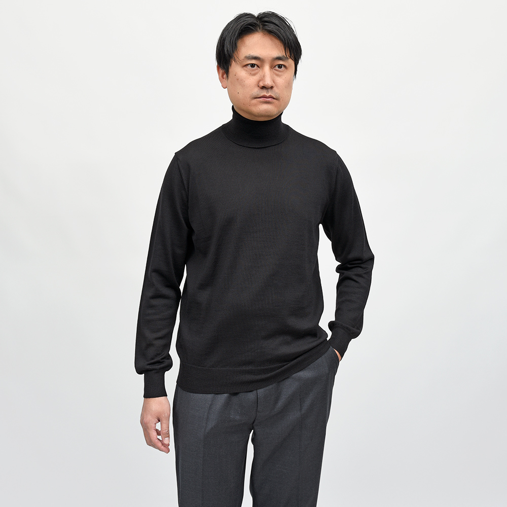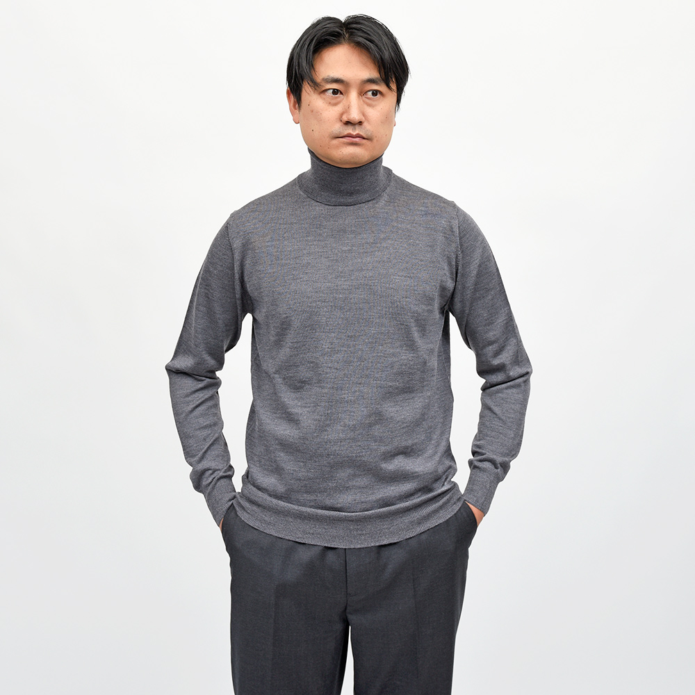 美しい艶感と非常に滑らかなタッチが特徴のエクストラファインメリノウールを使用した12ゲージニット。morganoでは定番の一つで、ロロピアーナ社が母体となる生地メーカー“Tollengo 1900(トレーニョ)”の糸を使い、ドイツ製の編み機で仕立てられています。やや肉感のあるハイゲージは、インナーは勿論、サイズアップして少しゆとりを持って一枚で着ても映える一着となっています。