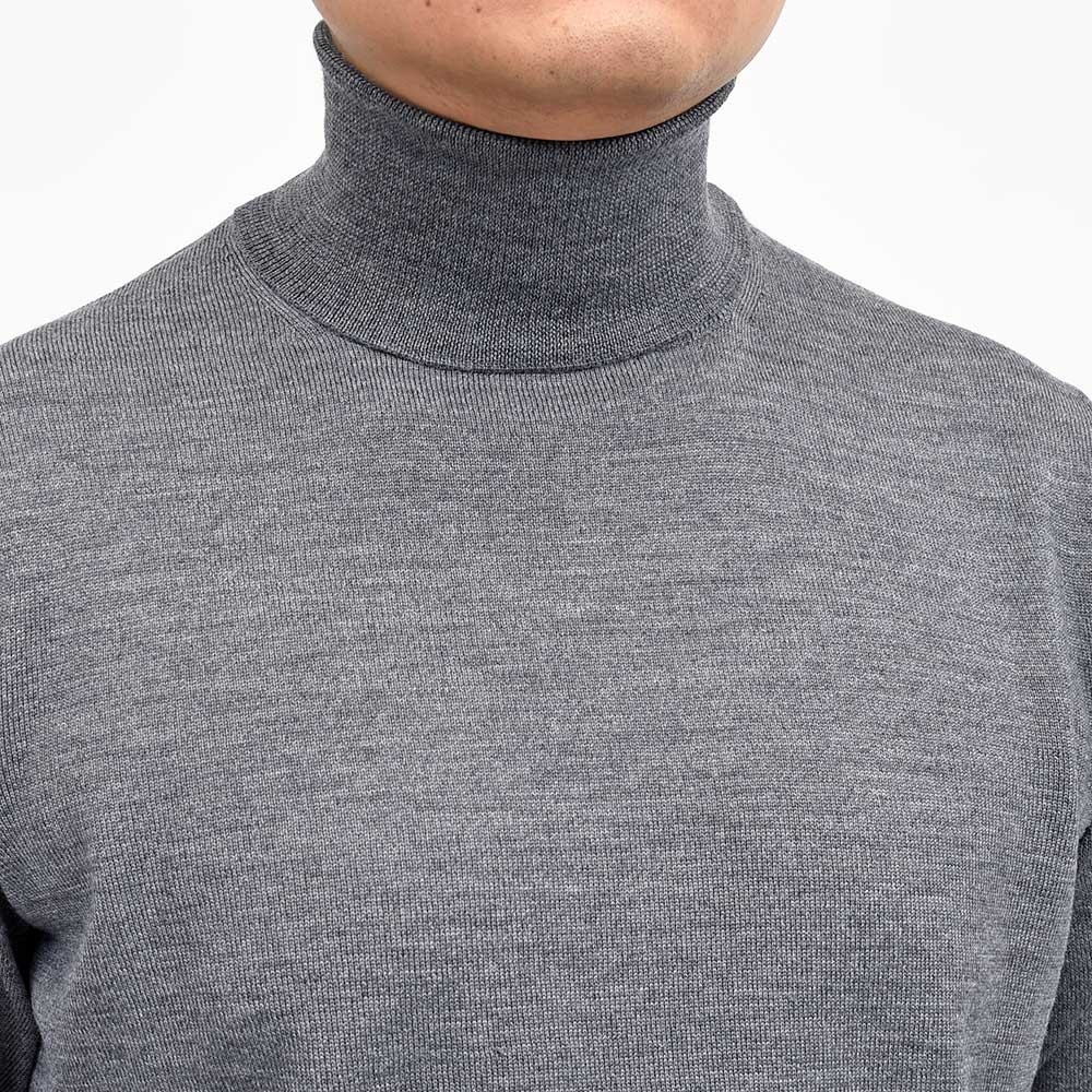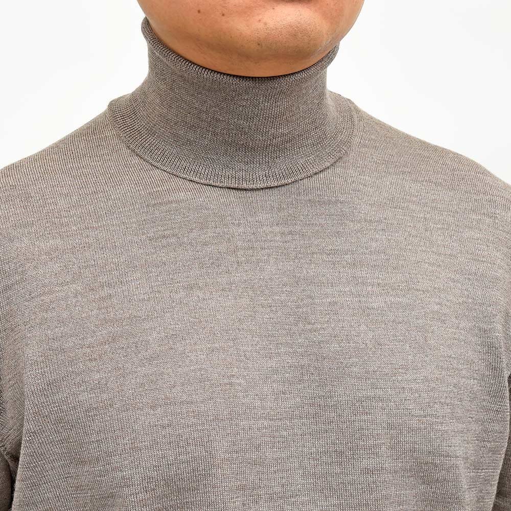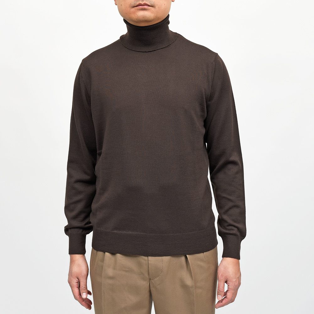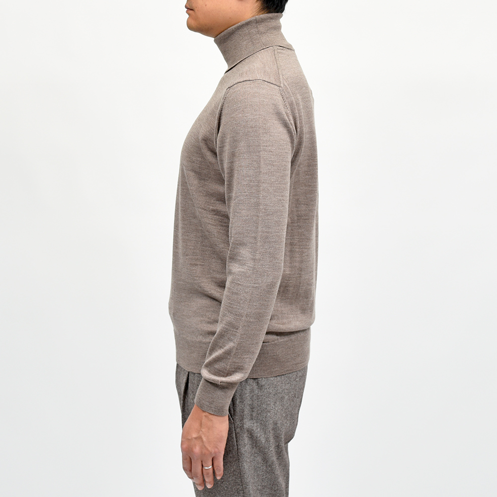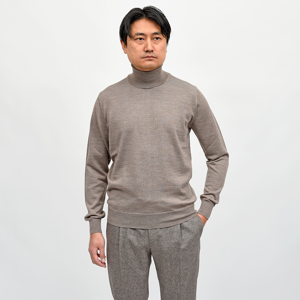 美しい艶感と非常に滑らかなタッチが特徴のエクストラファインメリノウールを使用した12ゲージニット。morganoでは定番の一つで、ロロピアーナ社が母体となる生地メーカー“Tollengo 1900(トレーニョ)”の糸を使い、ドイツ製の編み機で仕立てられています。やや肉感のあるハイゲージは、インナーは勿論、サイズアップして少しゆとりを持って一枚で着ても映える一着となっています。