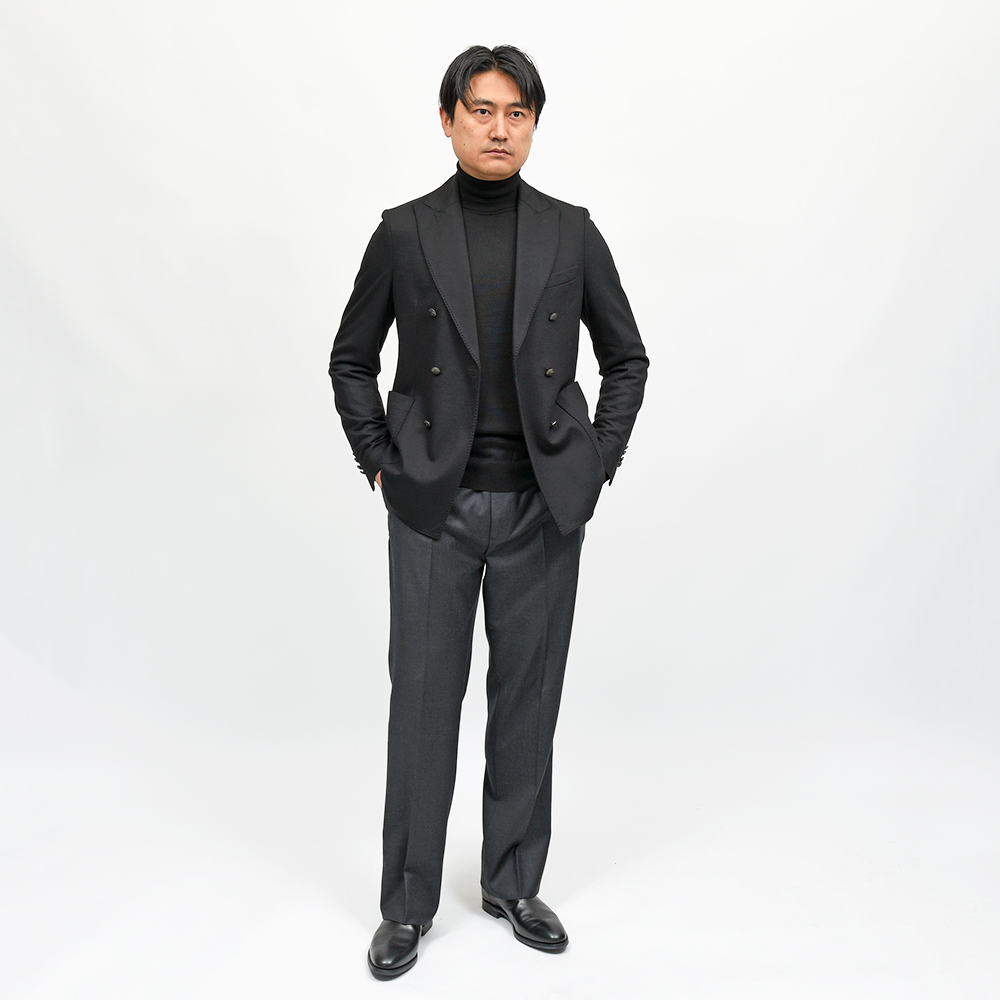 (画像のスタッフは182cm、76kgでチャコールグレーはサイズ50を、ブラックはサイズ48を着用しています。)