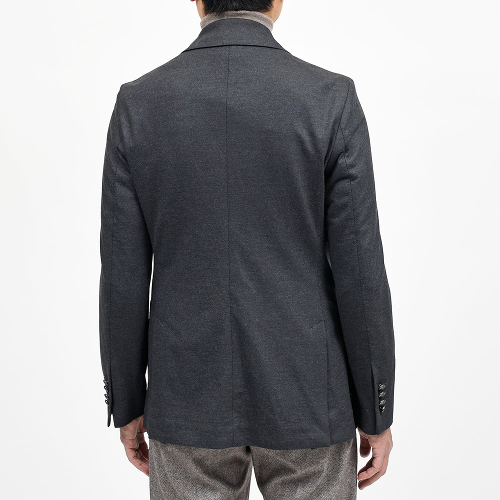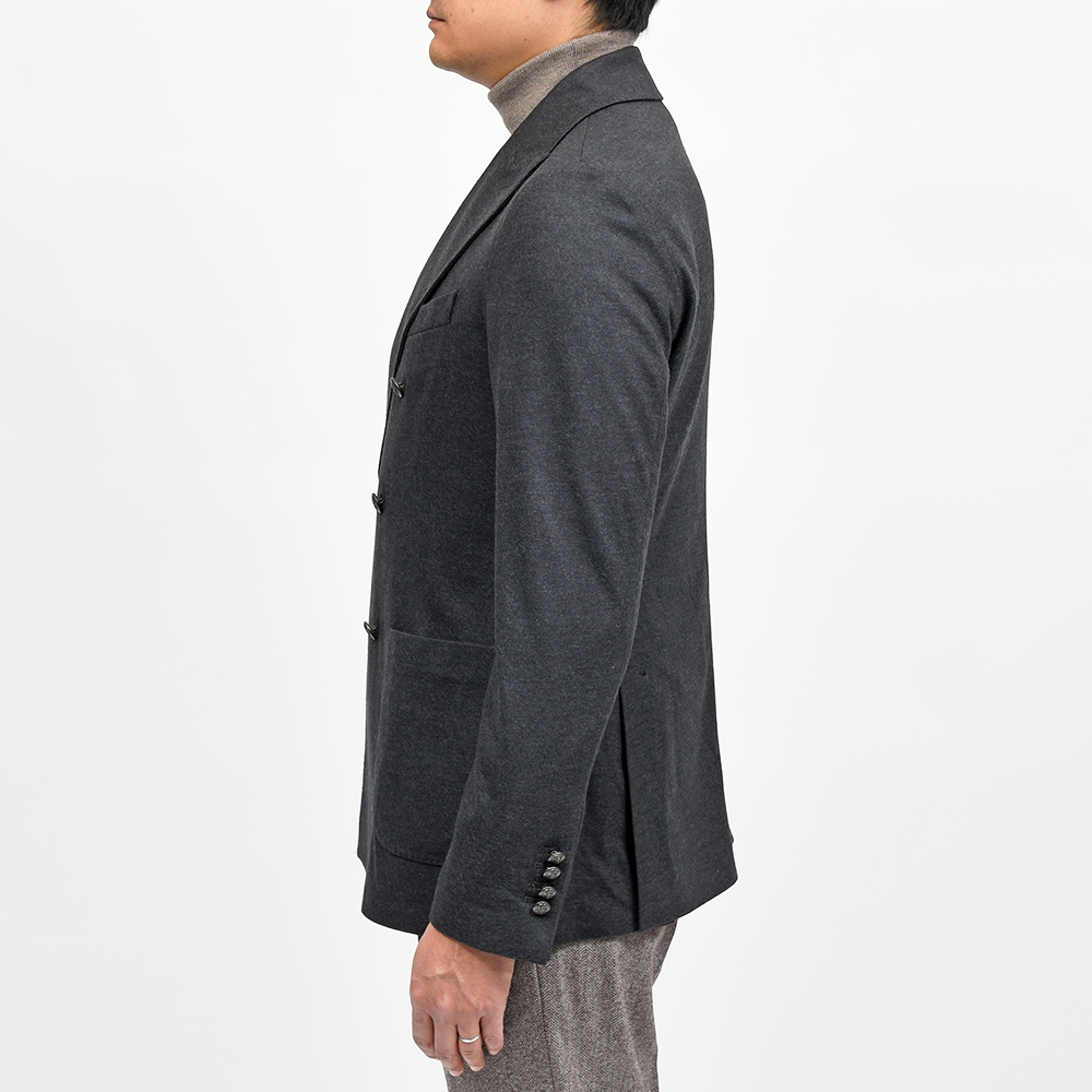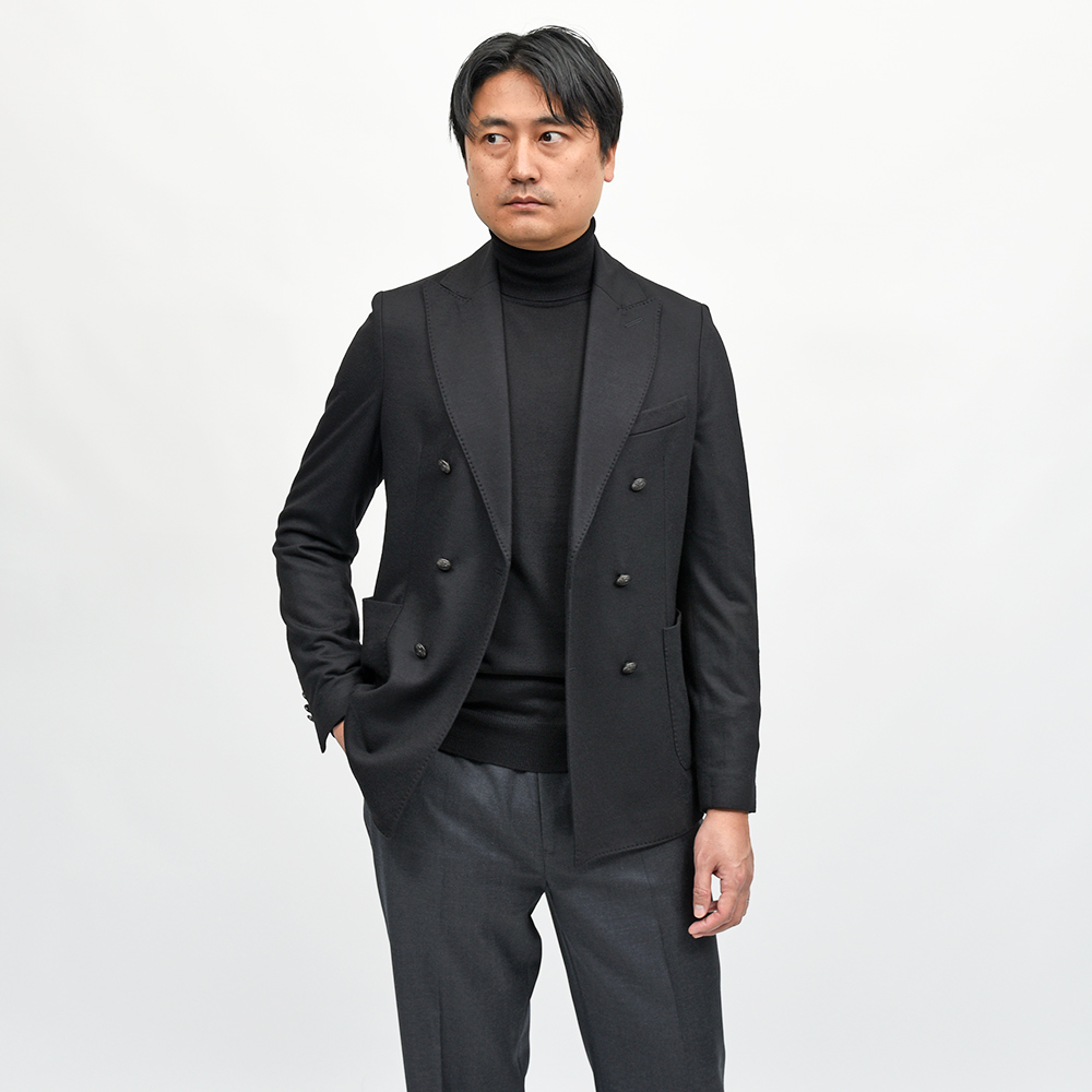 少し起毛感を持たせたヴァージンウール×カシミヤ素材は、非常にライトな生地感にヴァージンウールの滑らかと、カシミヤの柔らかさが合わさった高級感ある風合い。化学繊維を用いることなく、この風合いで伸縮性を持ったジャージー生地というのは、テキスタイルメーカーであるCIRCOLO 1901ならでは。