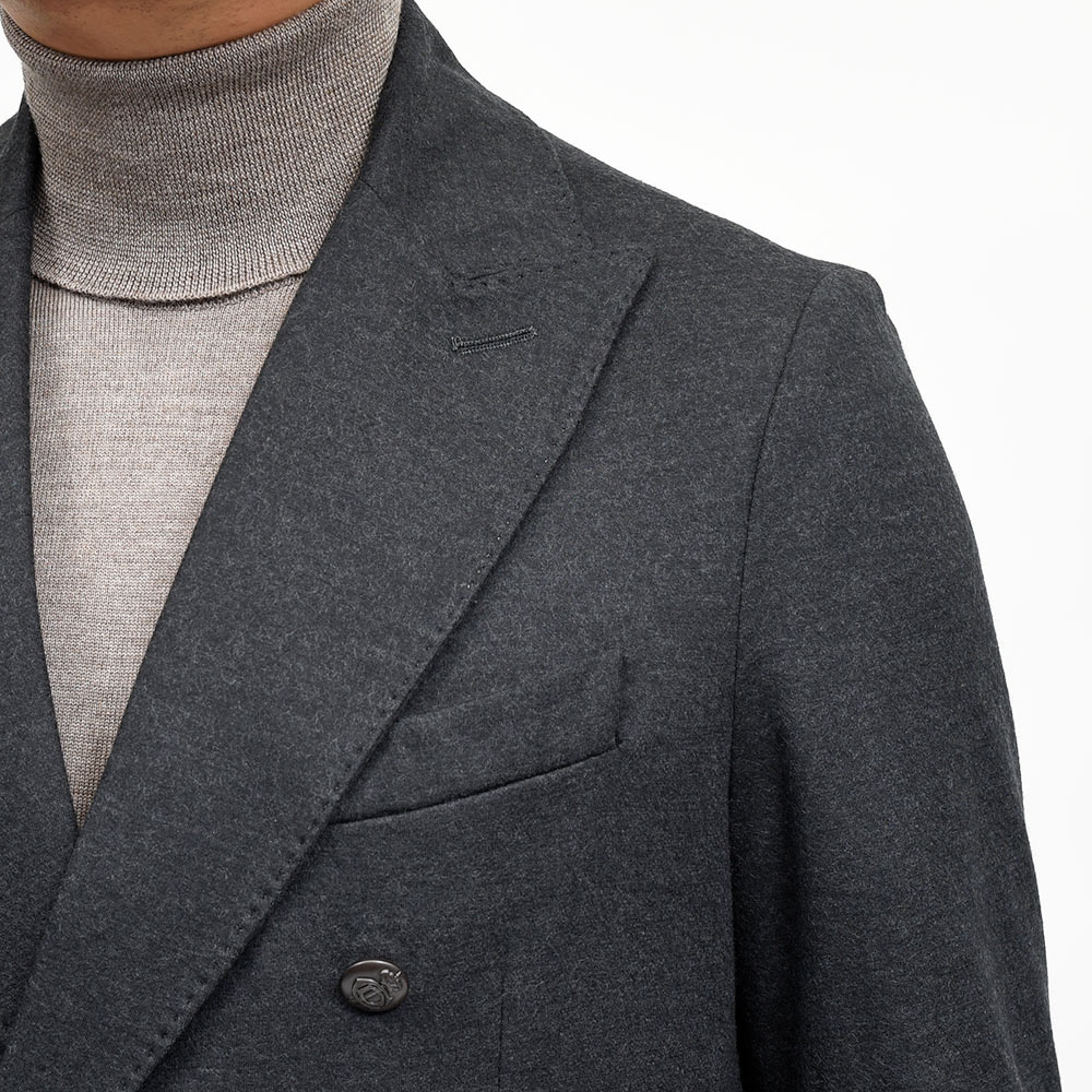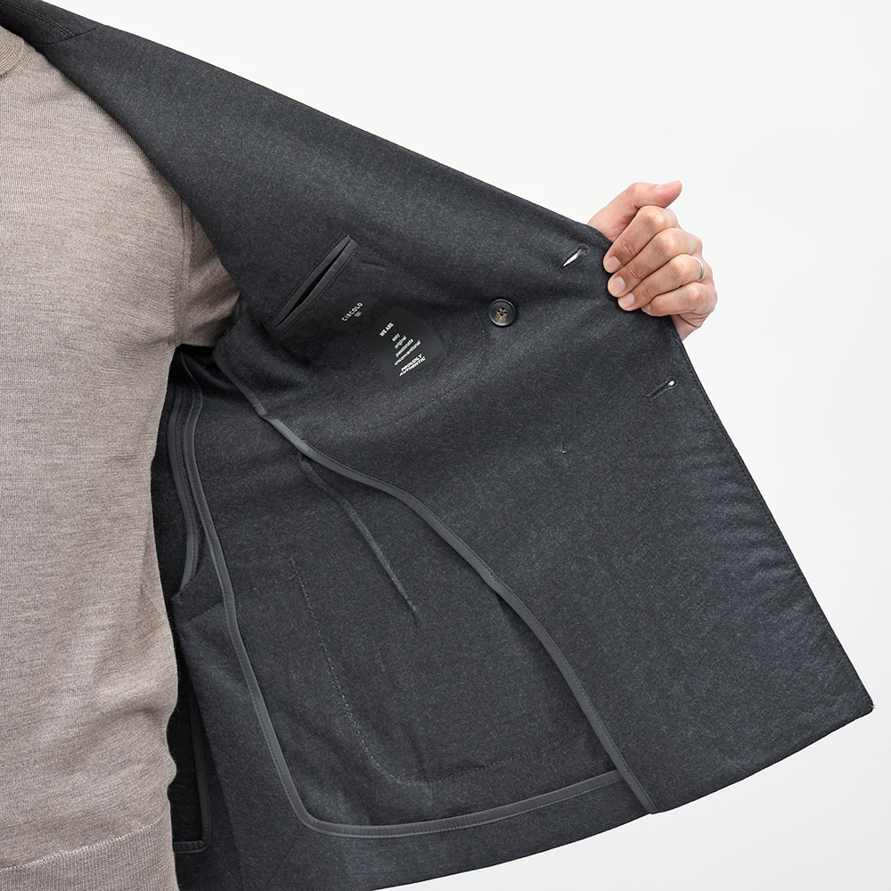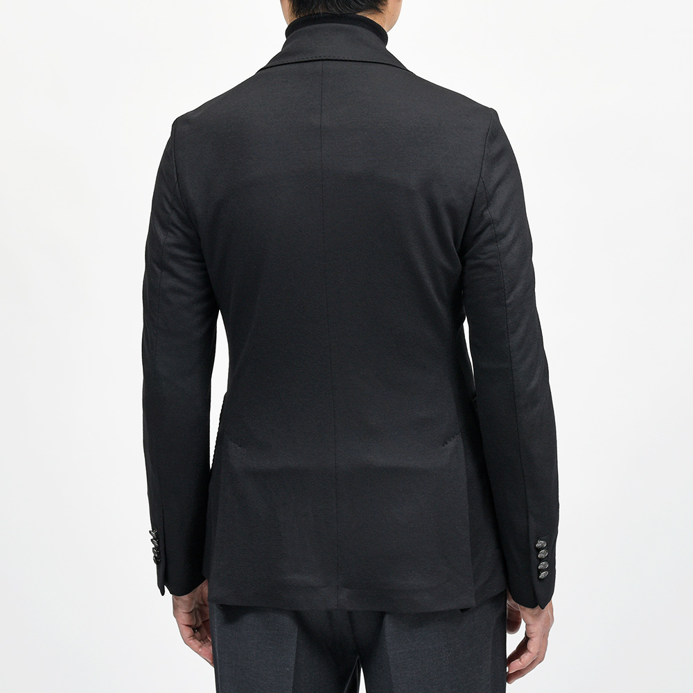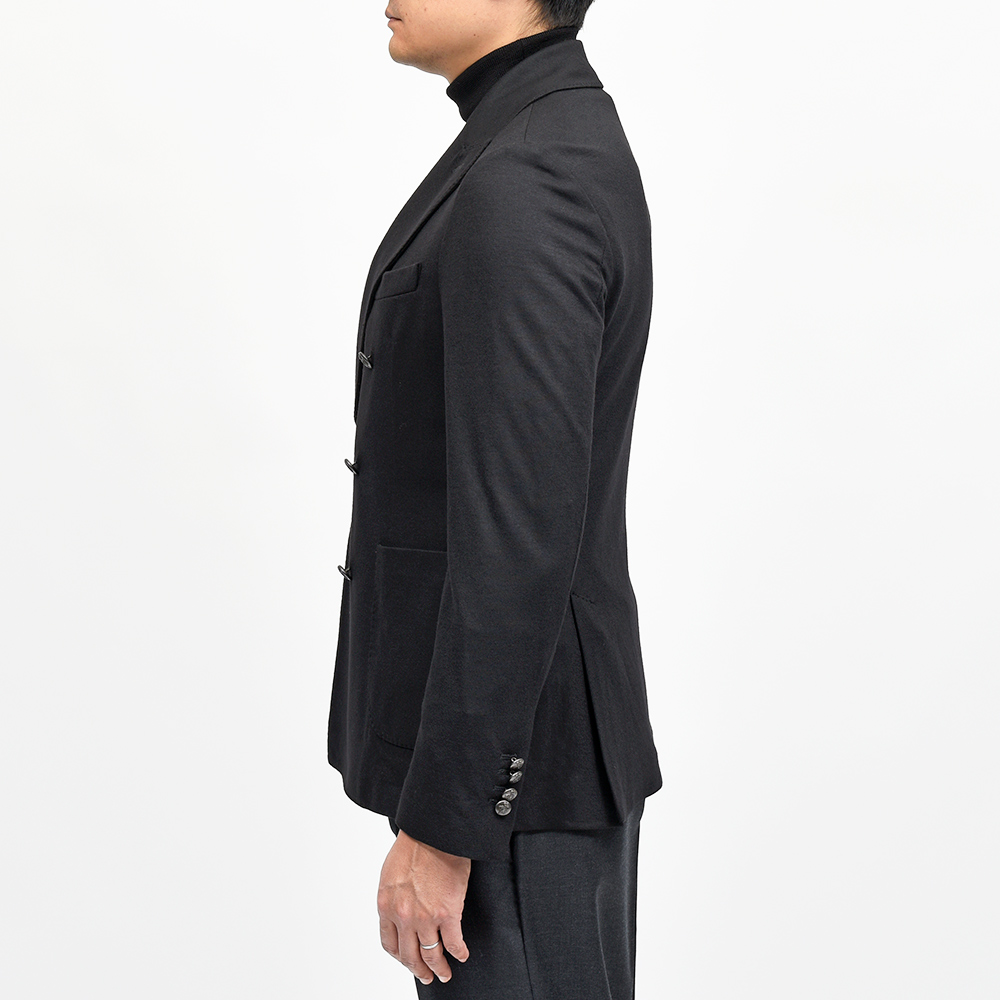 少し起毛感を持たせたヴァージンウール×カシミヤ素材は、非常にライトな生地感にヴァージンウールの滑らかと、カシミヤの柔らかさが合わさった高級感ある風合い。化学繊維を用いることなく、この風合いで伸縮性を持ったジャージー生地というのは、テキスタイルメーカーであるCIRCOLO 1901ならでは。