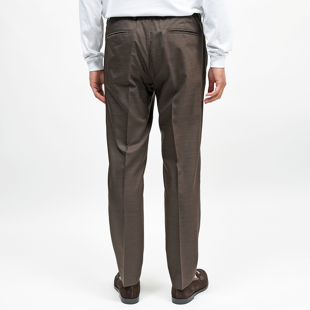 シャカウールといえば、ほんのりとした上品な光沢感に、シャリっとしたドライな質感。ナイロンを混紡することでシワがつきにくく、またシワも取れやすい生地。さらに、冬以外で着用できる生地感というメリットだらけの伝説的なファブリックになります。