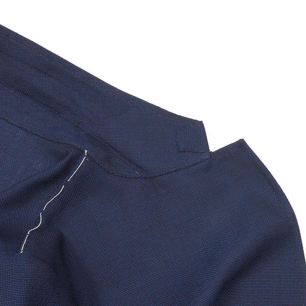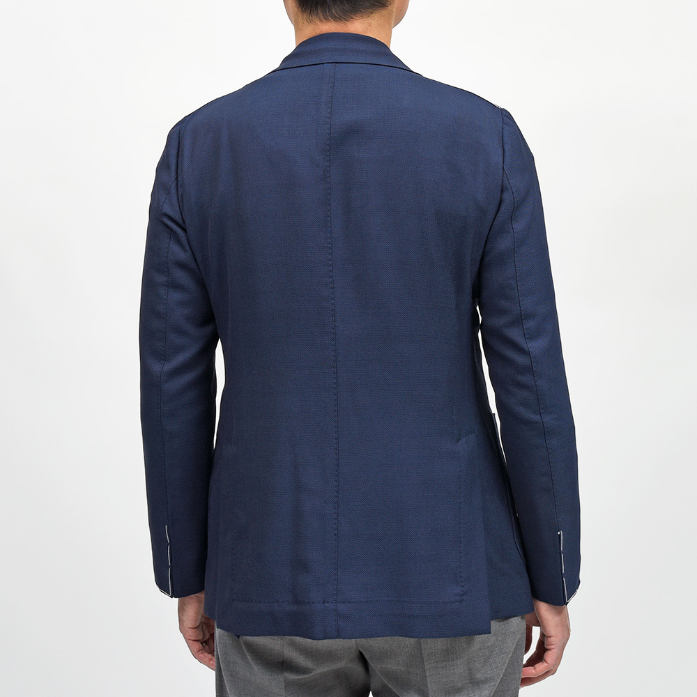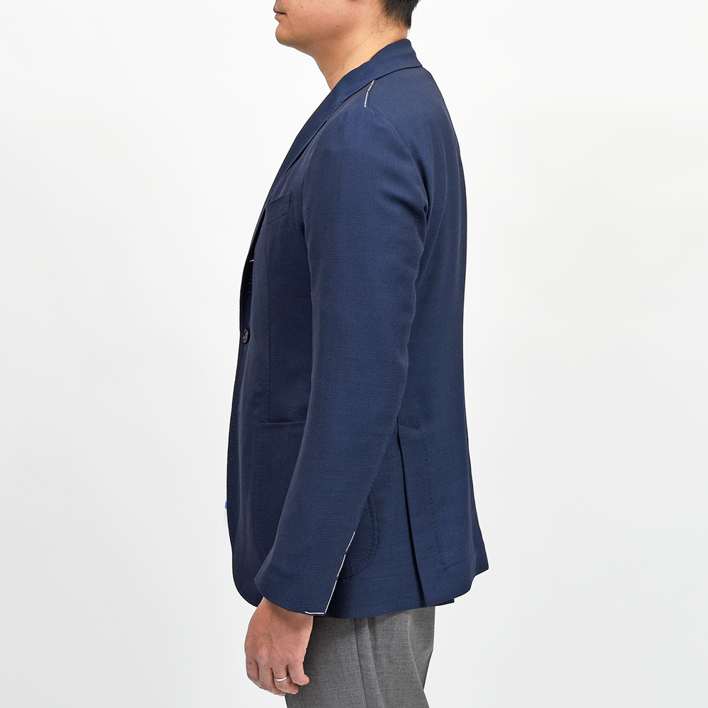 非常に軽い目付けのホップサックジャケットは、強捻のウールを使用したドライなタッチが特徴です。少し透けるほどの軽い目付けですので、ジャケットらしい佇まいでありながらもカーディガンのような感覚で着用することができます。また、副資材をほとんど省いた段返り3つボタンシングルジャケットのニューモデル“GINZA”を採用。裏地も袖裏のみと非常に軽やかでありながらも、アンコンジャケットとは思えないエレガントな姿を作り上げてくれます。