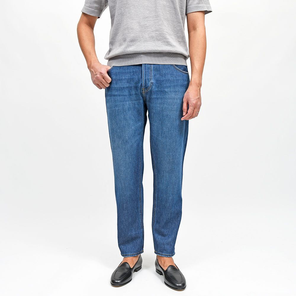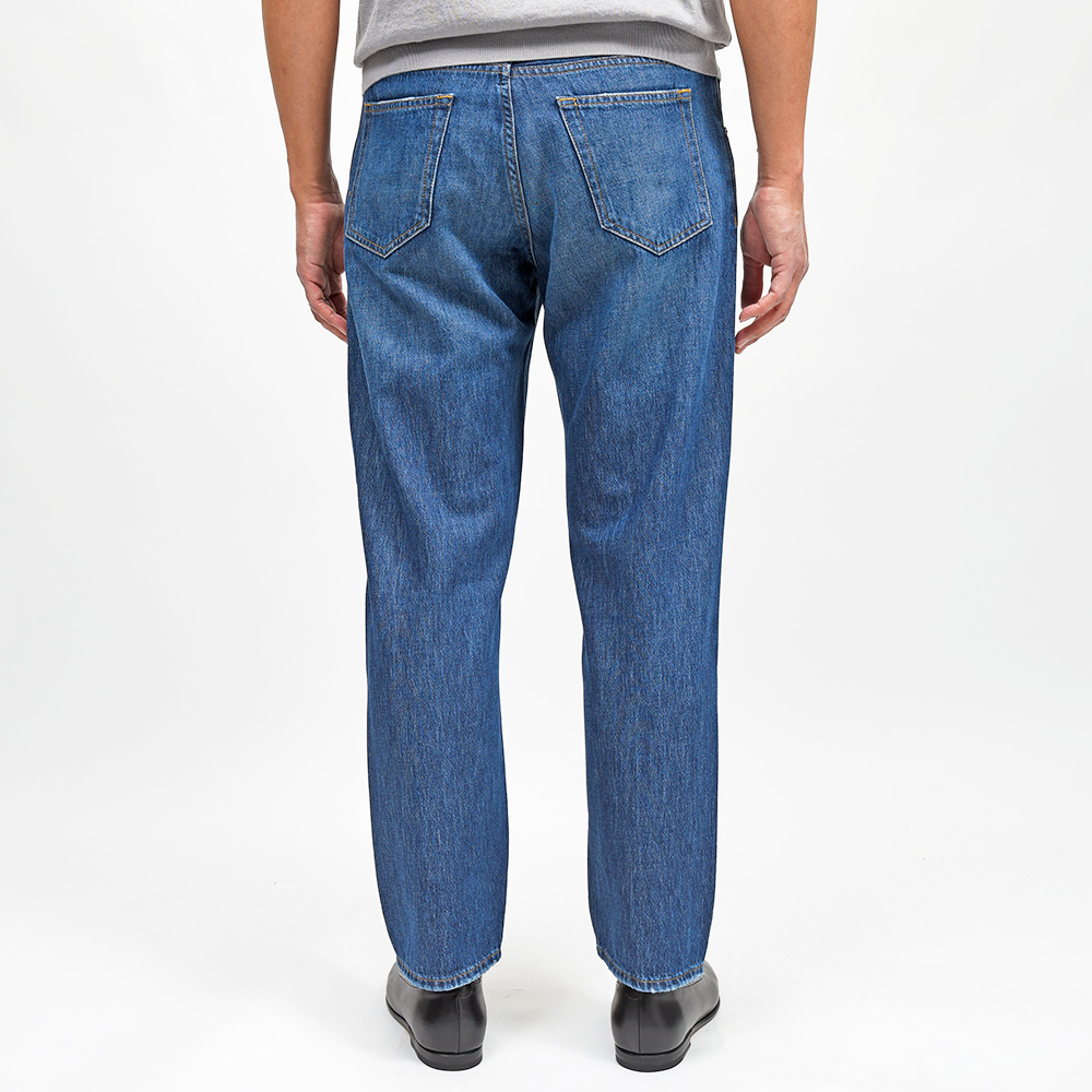 PT TORINO DENIMでは非常に稀なストレッチなしのコットン100%ファブリックを使用したこちらは、緩めのシルエットの入門編として人気を誇る定番モデルの“REBEL”。美しいトーンのインディゴブルーに、程よくウォッシュド加工を施した使い勝手の良い一本です。ガンメタリックのボタン&リベットに、ライトブラウンのステッチ使いは上品な佇まい。さらに高級感のあるスエードの革パッチが大人の色気を演出してくれます。