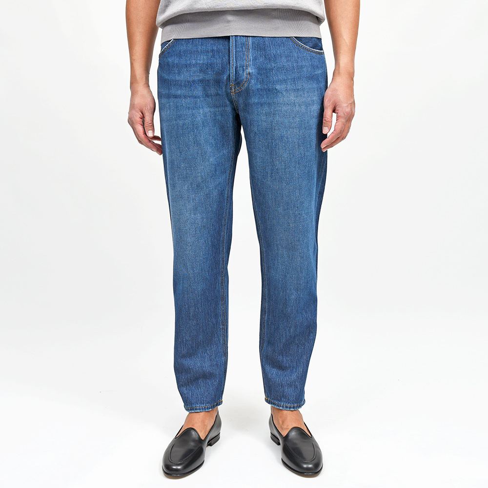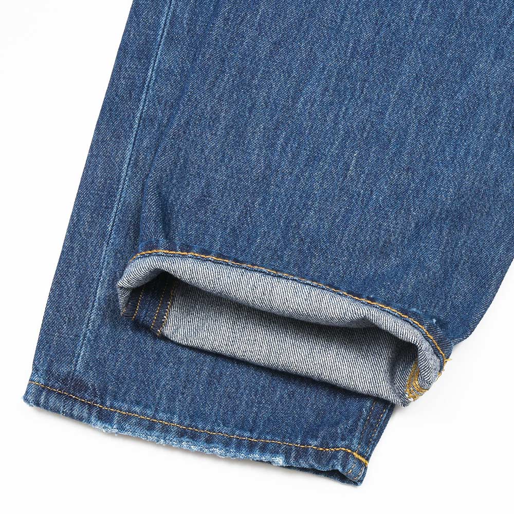 サイズ32がジャストサイズです。股上が深く、腰からヒップ上にかけてはスッキリと、ヒップ下からワタリはゆとりがありテーパードしたシルエットになります。使いやすいミディアムな色落ちのインディゴです!