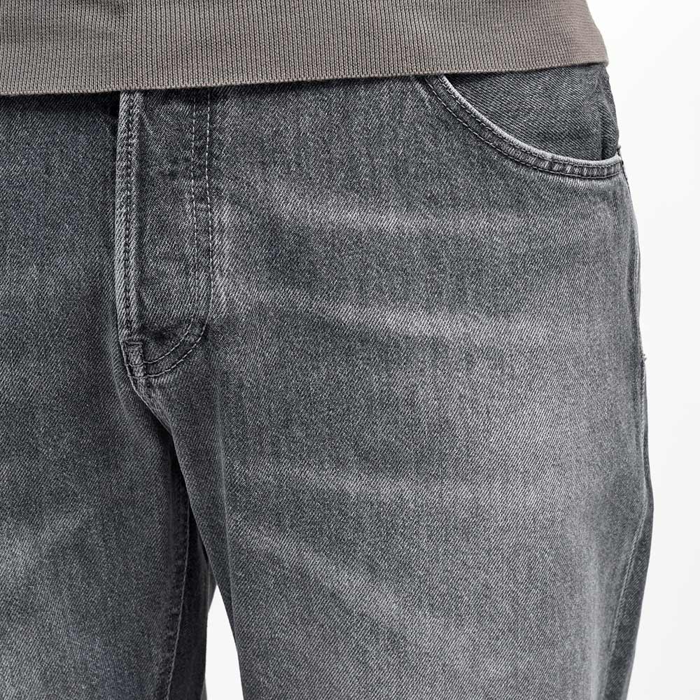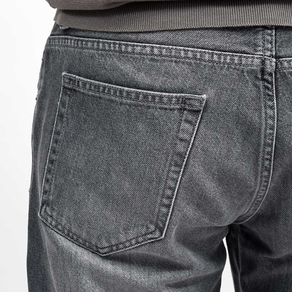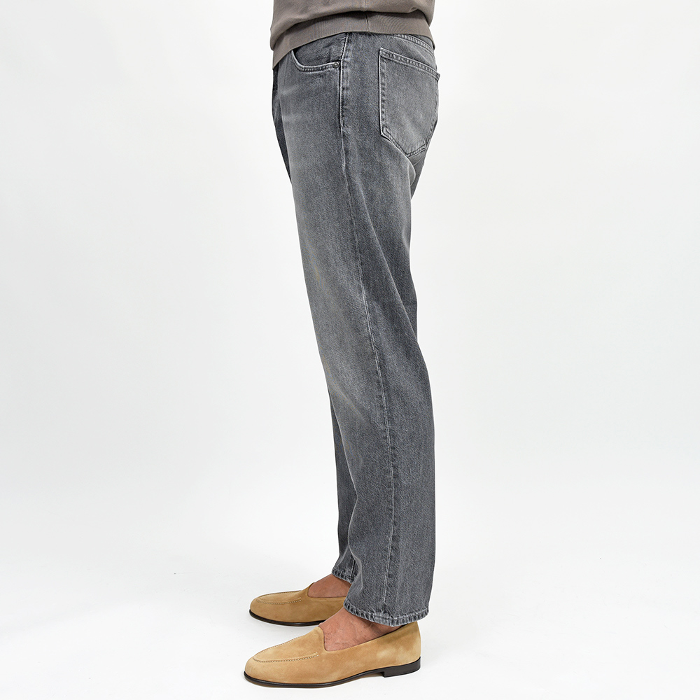 PT TORINO DENIMでは非常に稀なストレッチなしのコットン100%ファブリックを使用したこちらは、緩めのシルエットの入門編として人気を誇る定番モデルの“REBEL”。程よいライトなトーンのブラックデニムは、激しくない落ち着いた加工感が使い勝手バツグンな一本。ガンメタリックのボタン&リベットに、同色のグレーのステッチ使いは上品な佇まい。さらに高級感のあるスエードの革パッチが大人の色気を演出してくれます。