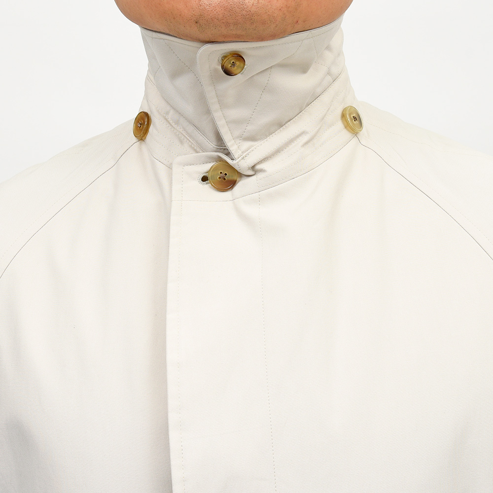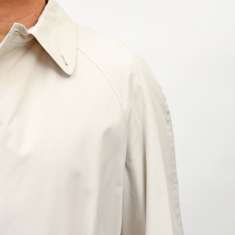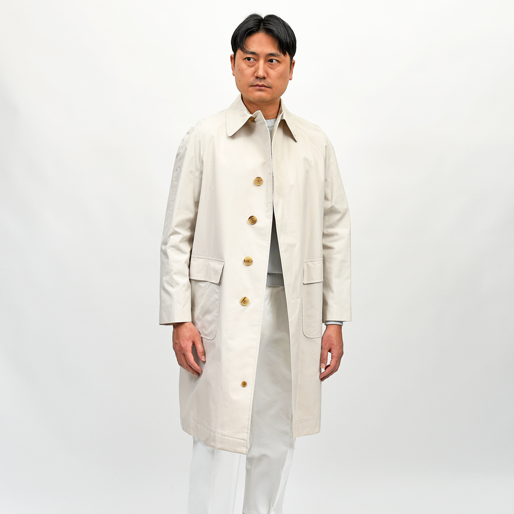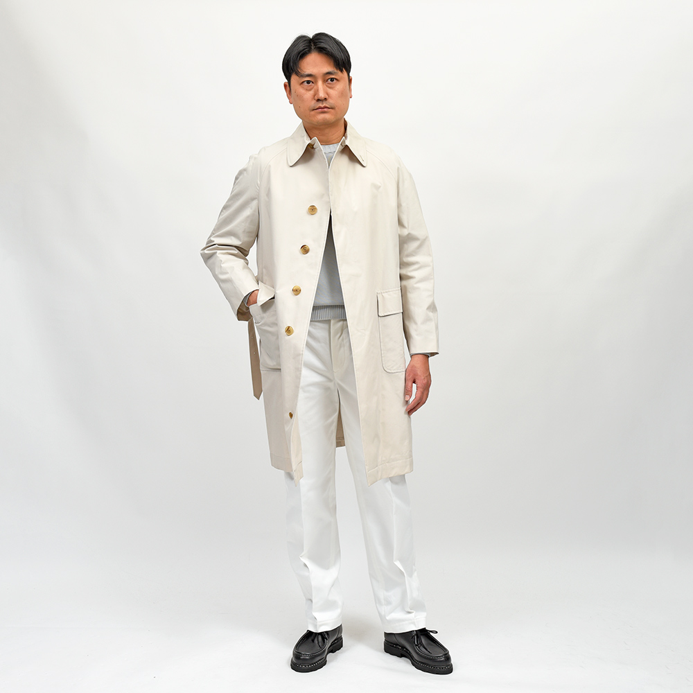 1920ー40年代のパリに集まっていたアーティストのポートレートからインスピレーションを受けデザインに表現したCOHRENCE。“SID”はイギリスジャズ界において黎明期のジャズサキソフォニスト、クラリネットプレイヤー、作曲家であるシド・フィリップス氏のモデル。1960年頃に彼がパリで着用していたシングルブレストのベルテッドコートにインスパイアされています。台襟付きのバルマカーンカラーと、ローデンコート等に見られる背中の深いボックスプリーツを備えています。