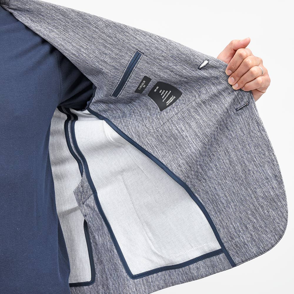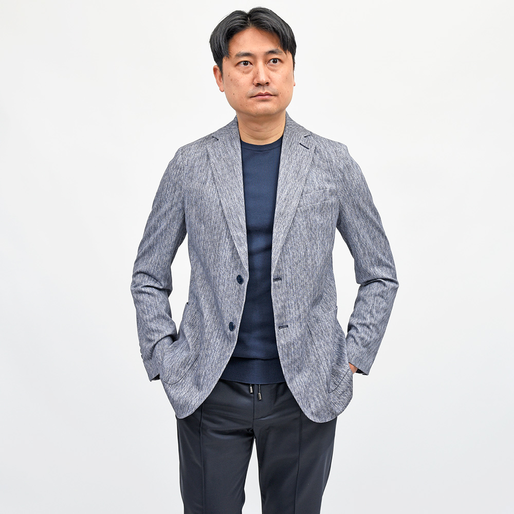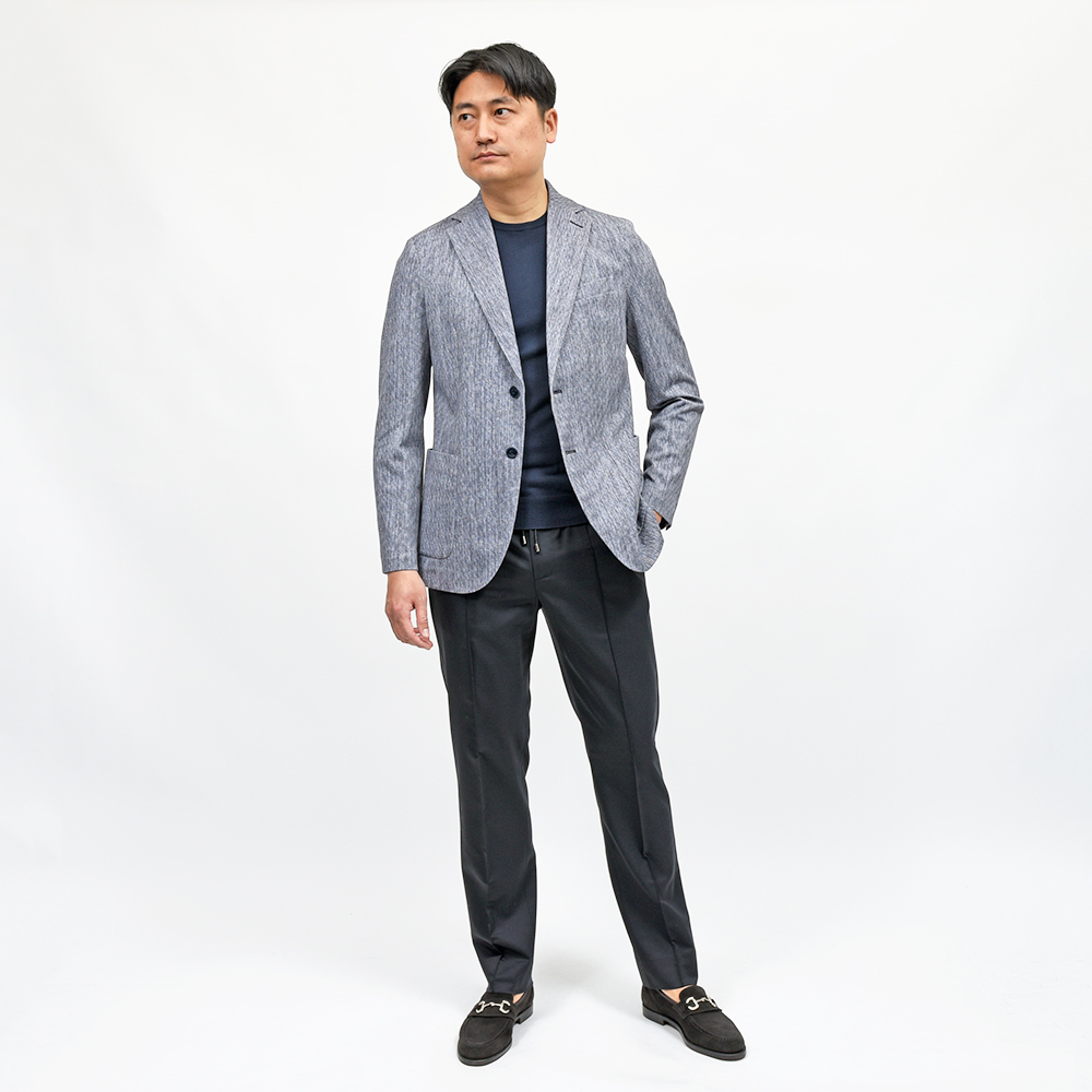 ココンチが得意とするプリントを施したジャージーシリーズ。メランジを効かせたツイル織の雰囲気は、プリントとは思えない完成度です。