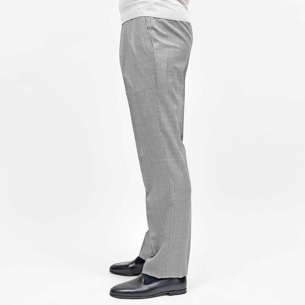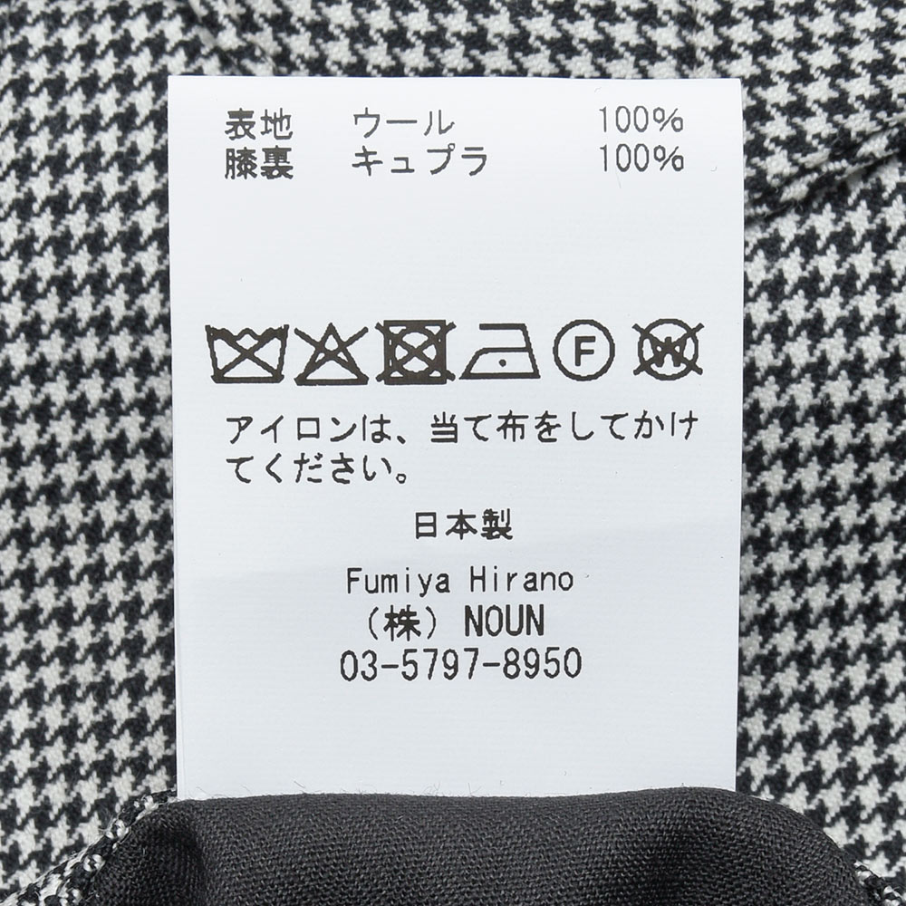 ファブリックは日本国内で生産された、Fumiya Hiranoオリジナルのウールハウンドトゥース。軽めのウエイトが清涼感を持ちながらも、小柄のハウンドトゥースがモダンで程よくブリティッシュな印象になります。
