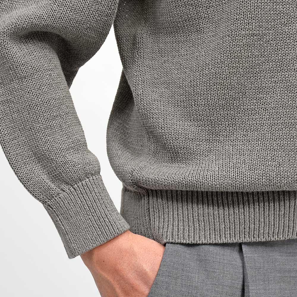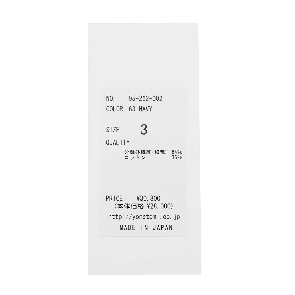 和紙と超長綿をミックスしたテープヤーンを使用したこちらは、特殊な機台を使うことで和紙を上質な超長綿で包み込むようにして作られています。この特殊なテープヤーンを用いることで、ローゲージのザックリとした編み地に対して、驚くほどの軽さを実現。また、ドライなタッチによる清涼感も持ち合わせています。