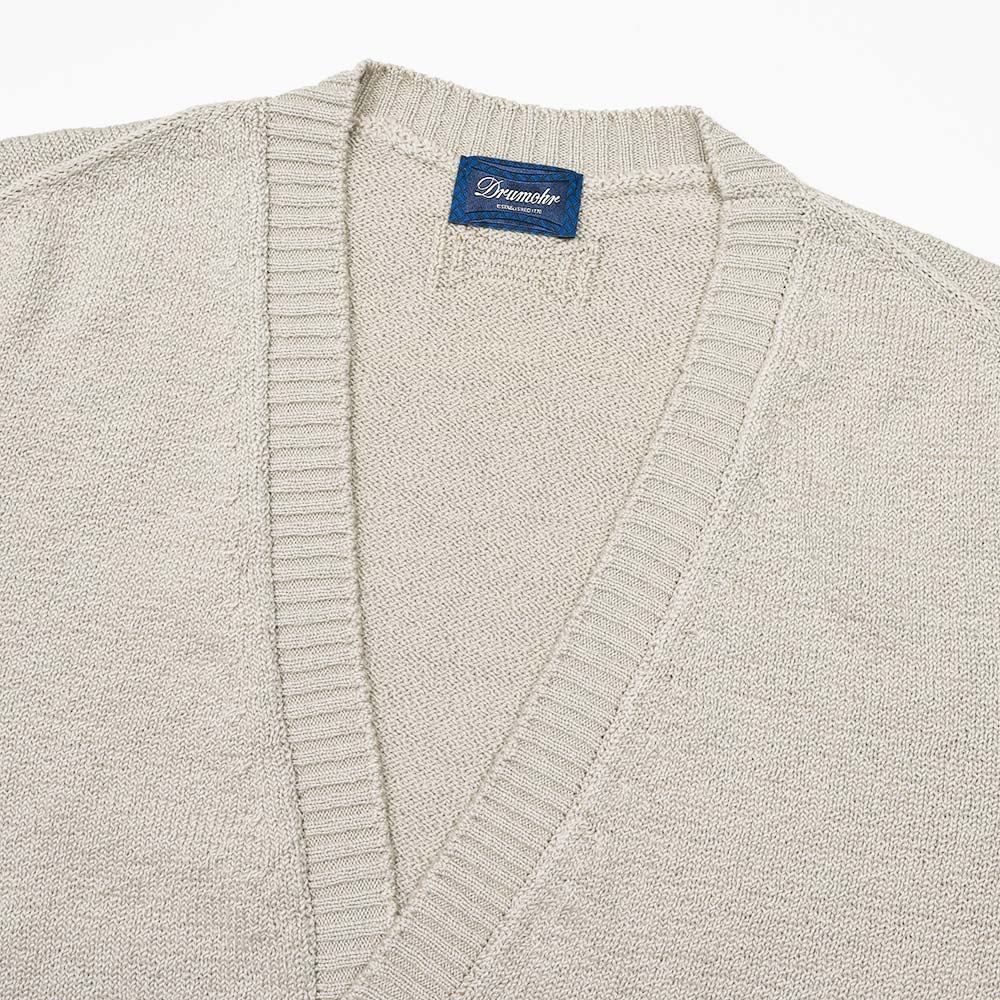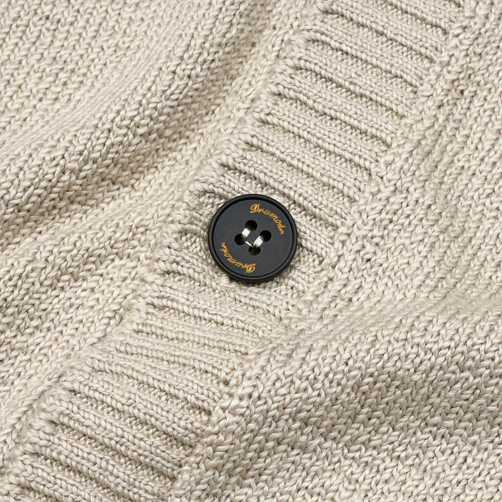 最高級の綿糸を使用したミドルゲージニット。独自の縮れを持ったブークレ調の綿糸は編み上げることで凹凸感が生まれ、それによってふっくらとした表情と、サマーニットとしては秀逸なサラリとした肌触りを両立しています。Drumohrが得意とするホールガーメントによる極上の着心地と合わさることで、この上ない着用感を味わうことができます。