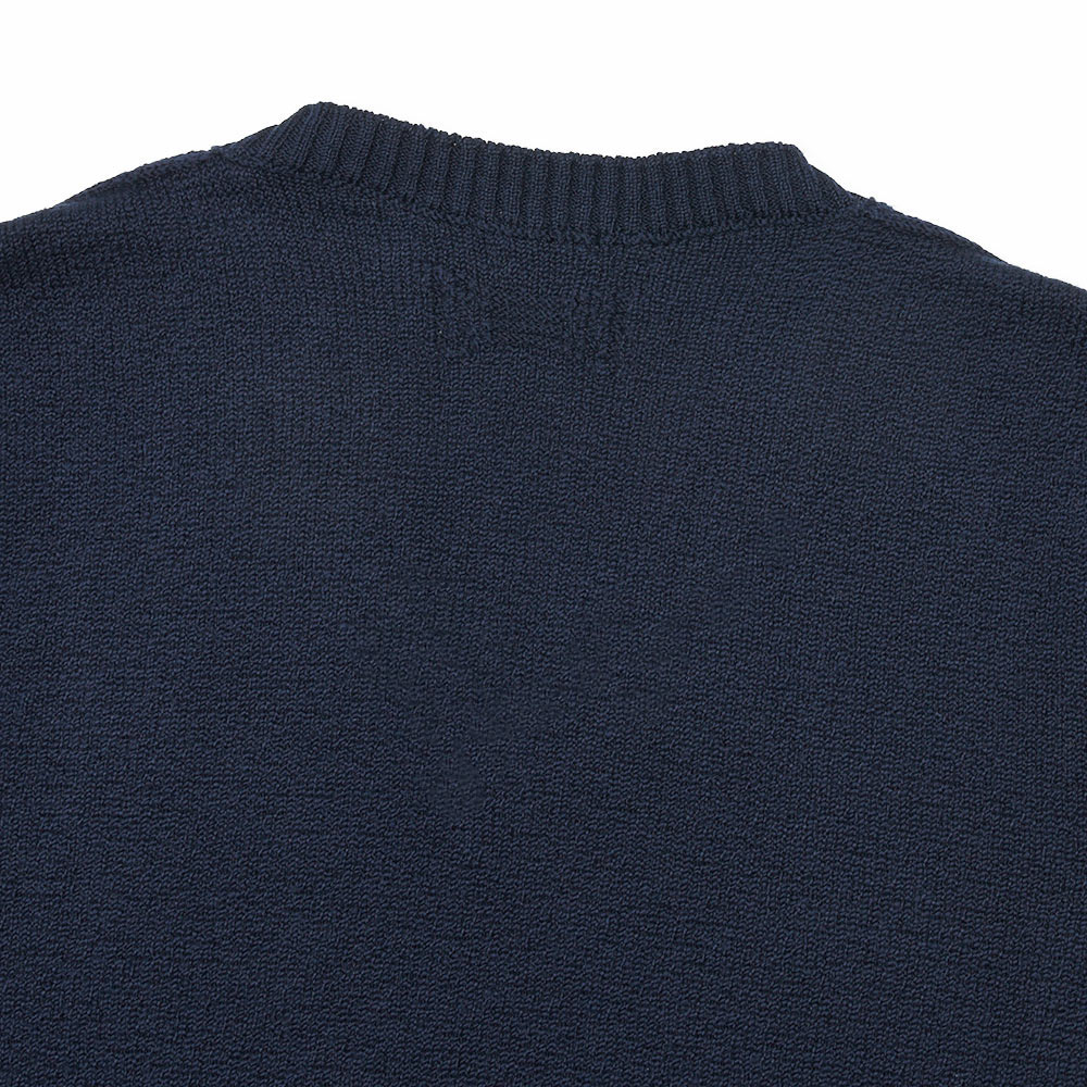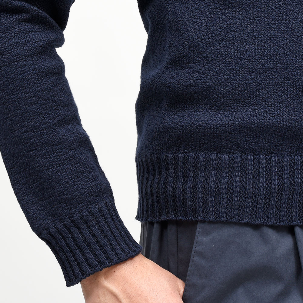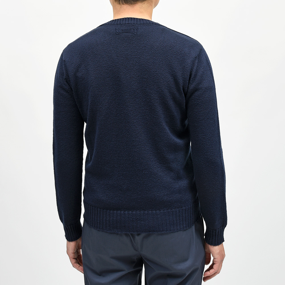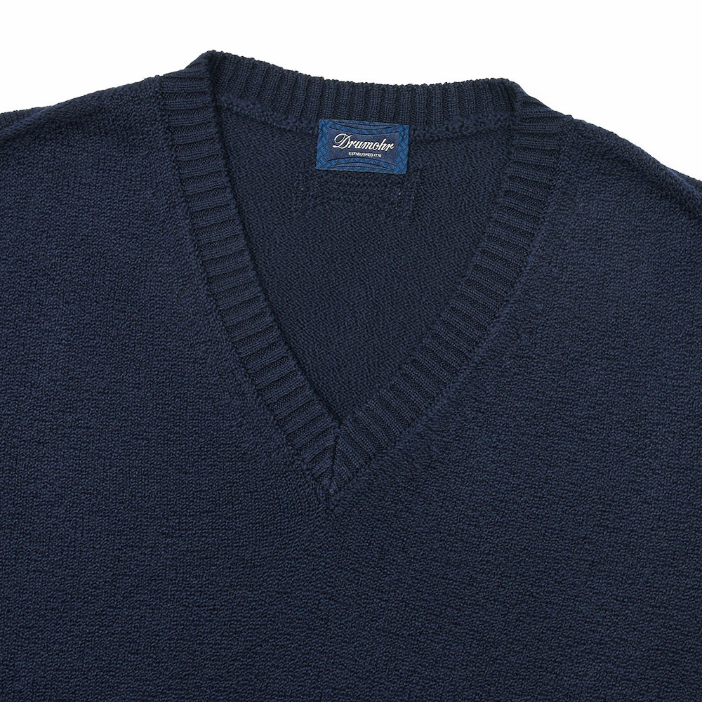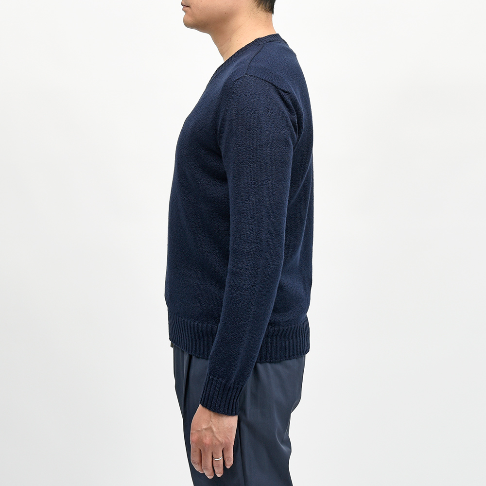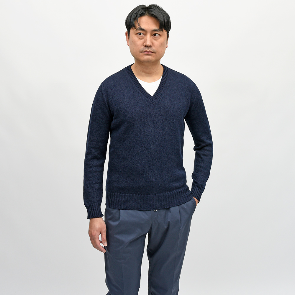 最高級の綿糸を使用したミドルゲージニット。独自の縮れを持ったブークレ調の綿糸は編み上げることで凹凸感が生まれ、それによってふっくらとした表情と、サマーニットとしては秀逸なサラリとした肌触りを両立しています。Drumohrが得意とするホールガーメントによる極上の着心地と合わさることで、この上ない着用感を味わうことができます。