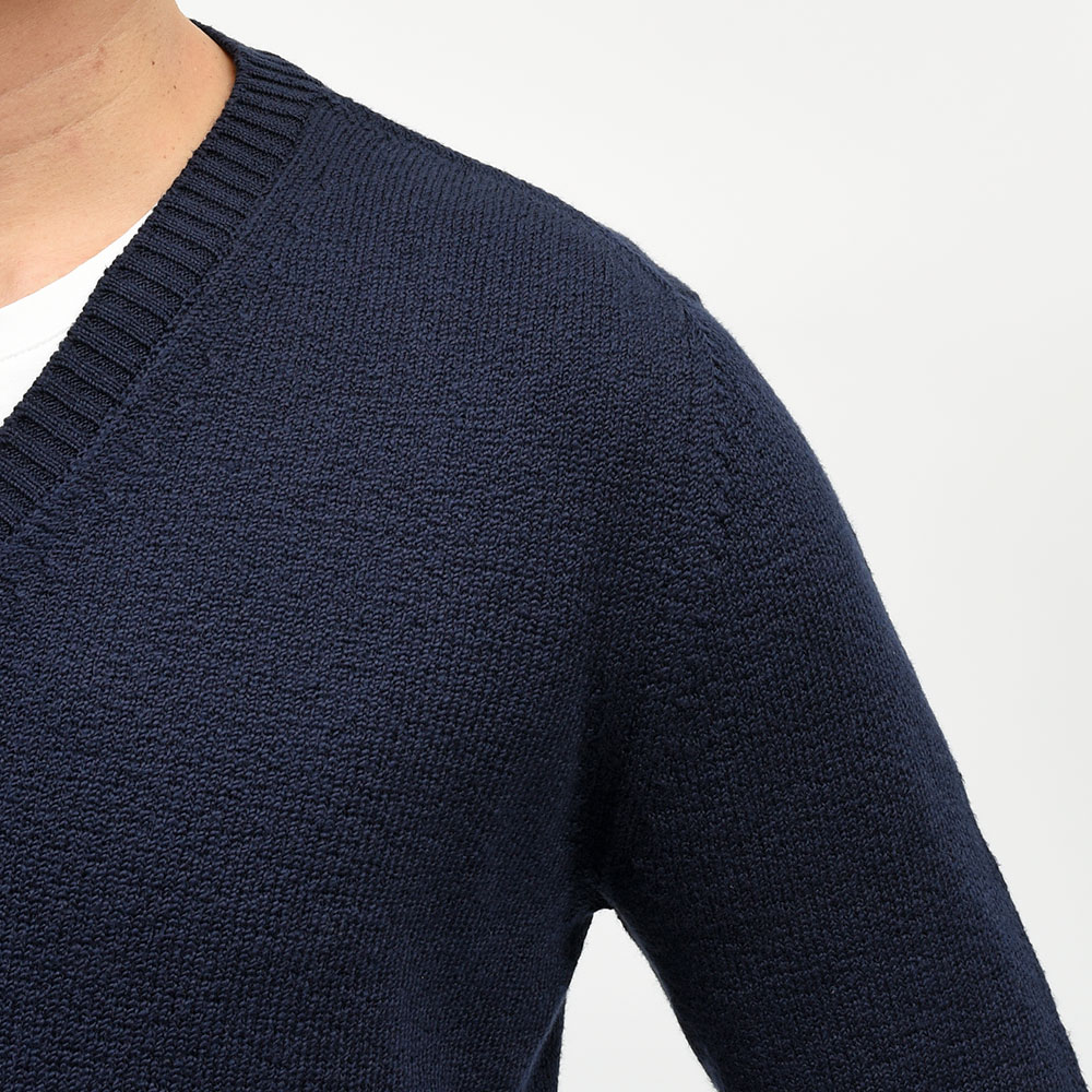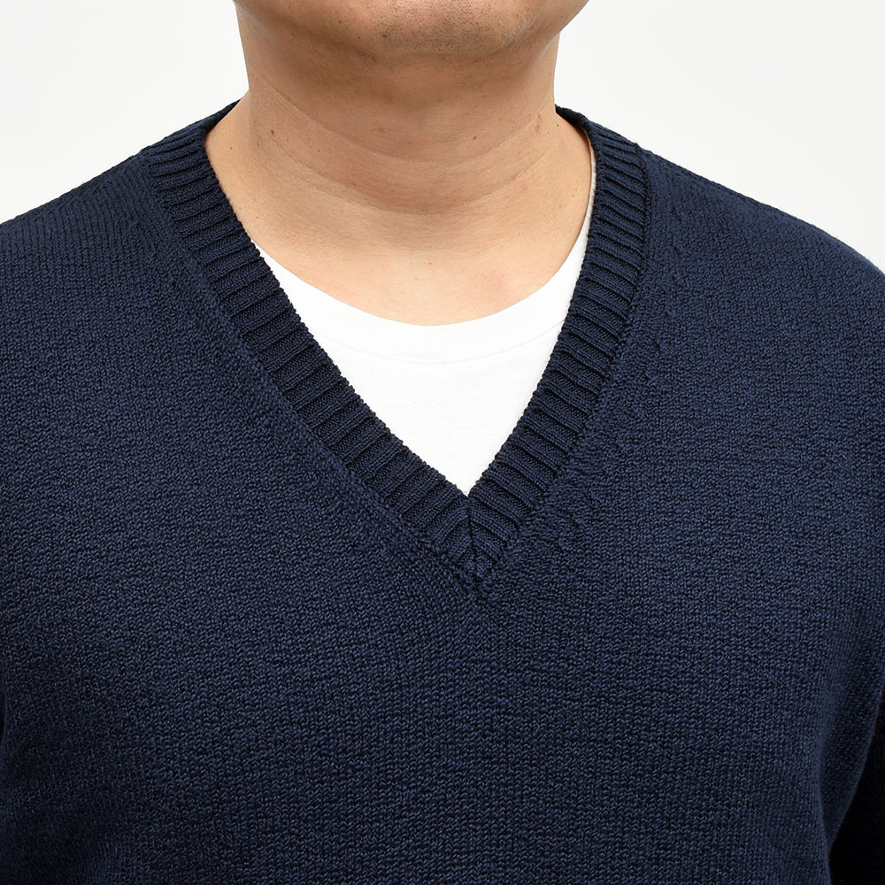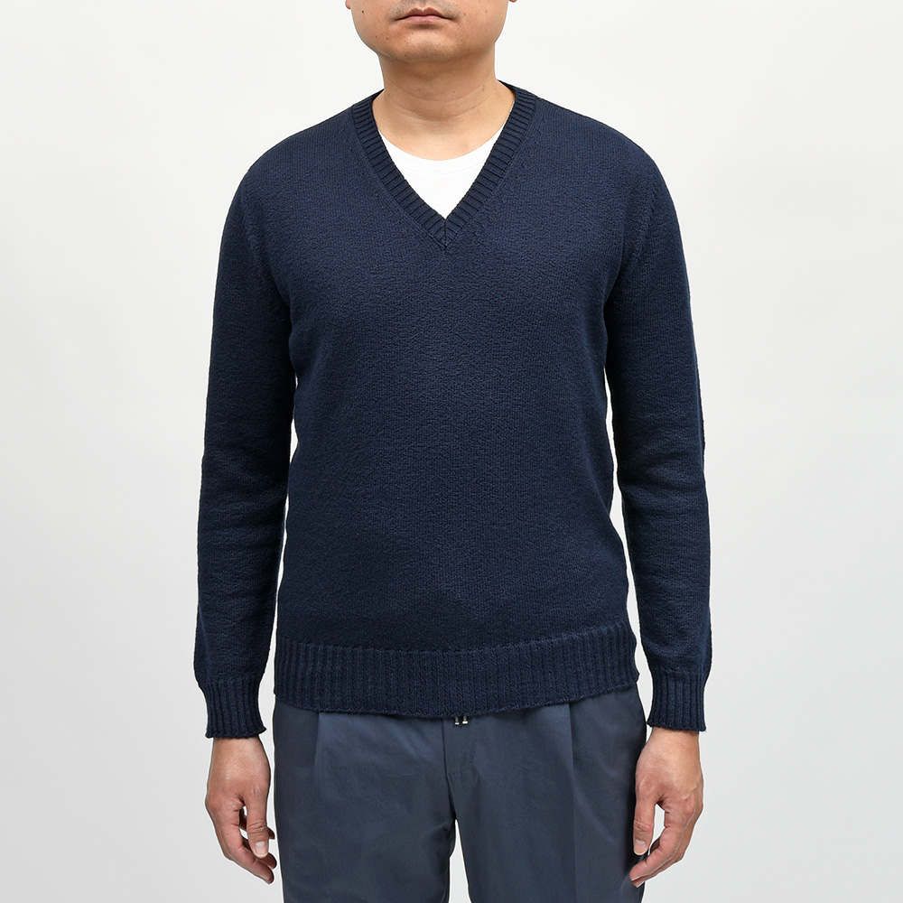カットソーやシャツと重ね着しやすいVネックニットは、ミドルゲージの肉感が今っぽいスタイルを作り上げてくれます。