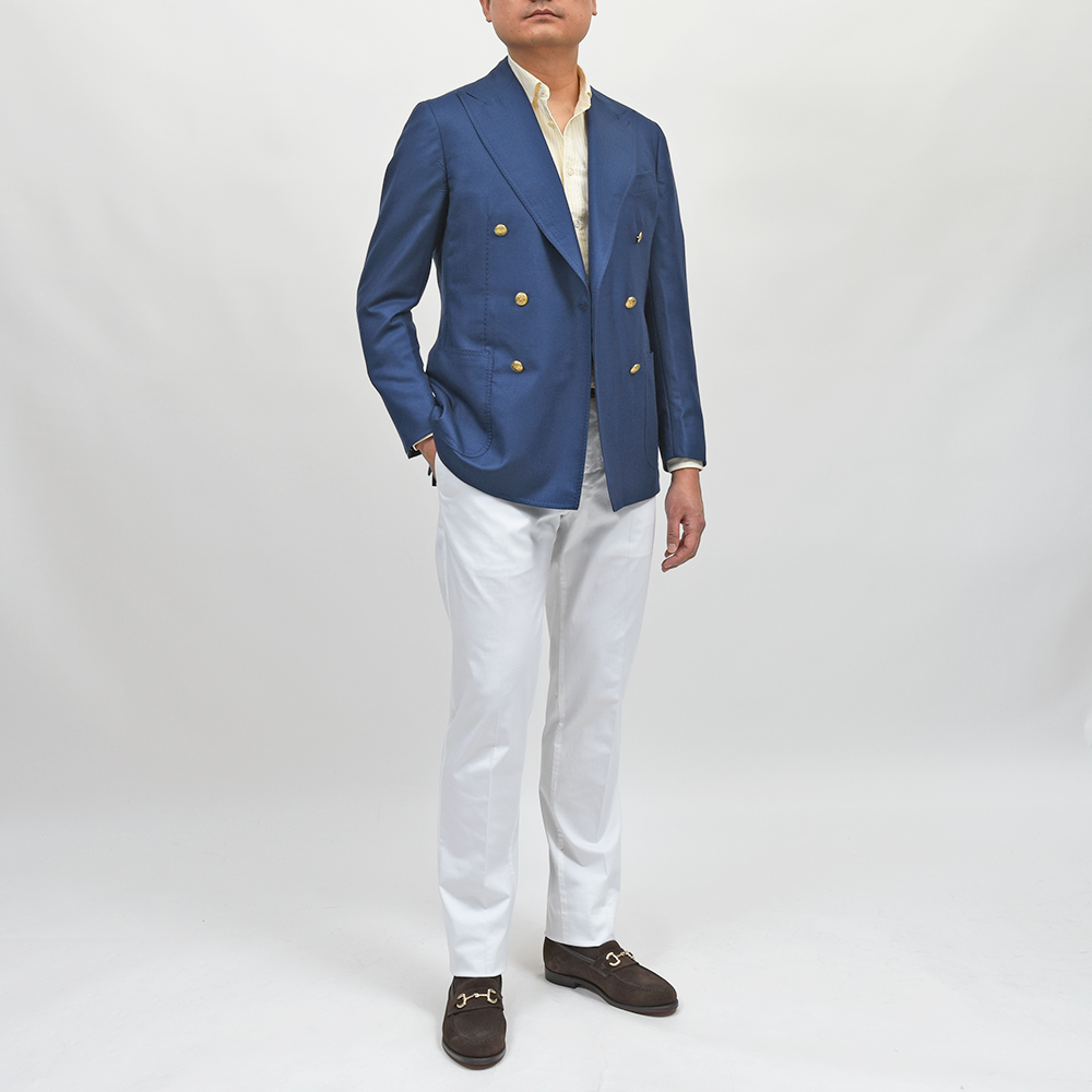 目付け180gのカシミヤ素材を使用したダブルジャケット。非常に軽やかなウエイトで仄かな起毛感があるため通年で着用いただけます。また、ボタンはゴールドのメタルボタンでブレザーの仕上がりとなっていますが、ホーンボタンが付属で付いているため、その時々の気分やシーズンによって付け変えることが可能です。長い期間愛せるパートナーのような存在になる一着と言えます。