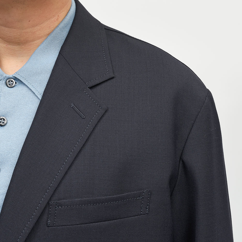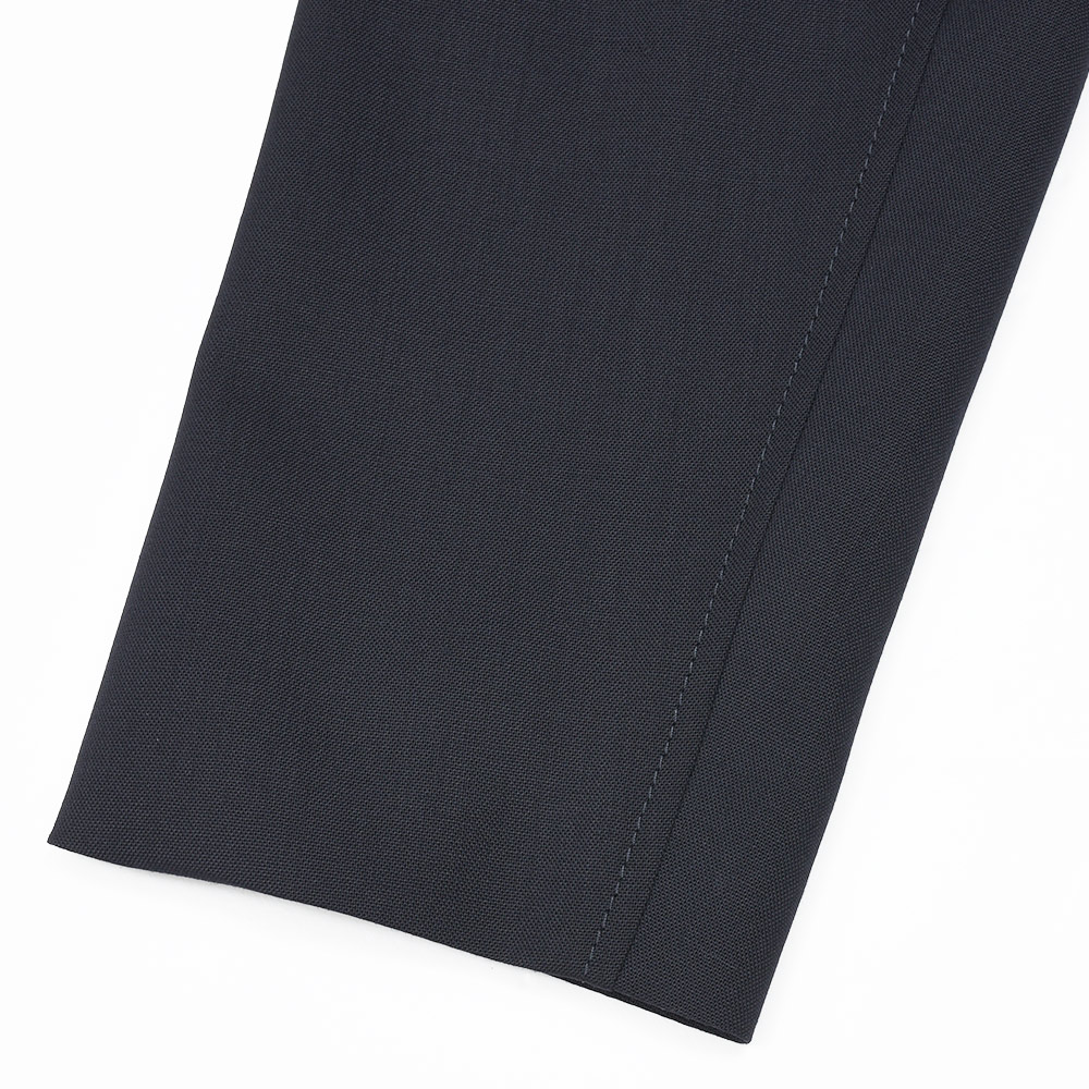 60番手のウールの強撚糸を使用したこちは、ドライなタッチを持ちながら、しなやかさも兼ね備えた快適な肌触り。強撚糸が使用されているため、生地自体にハリがありシワになりにくい特徴を持ちます。