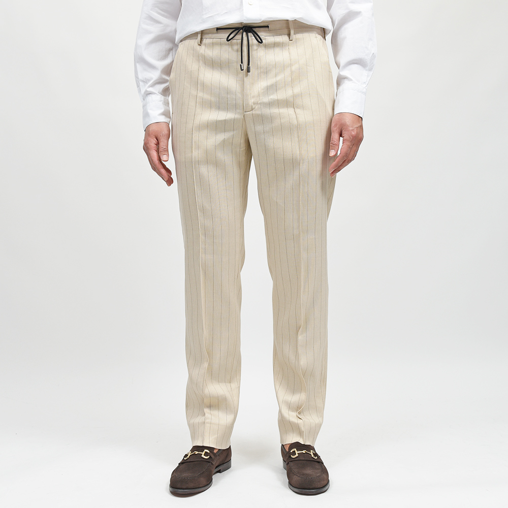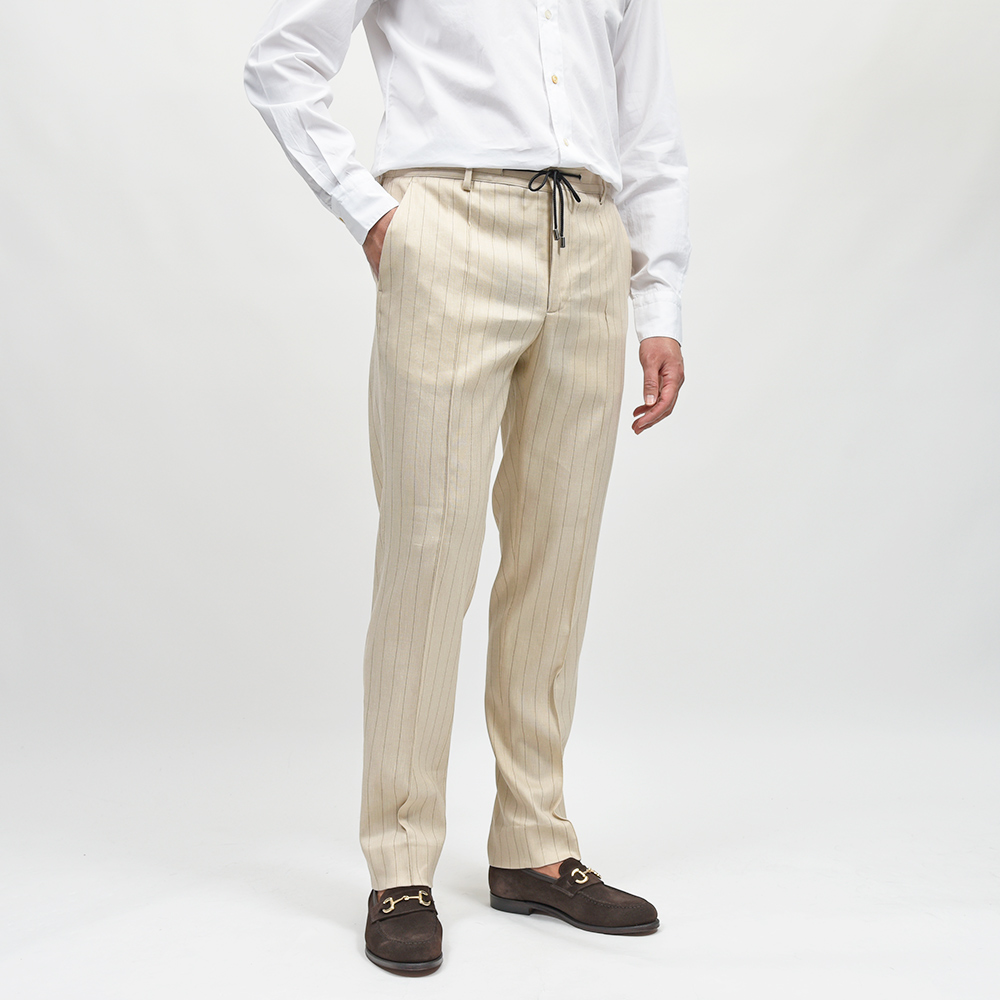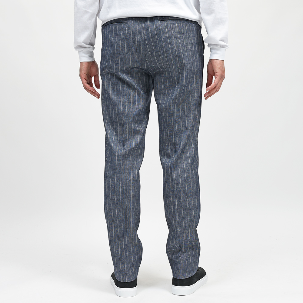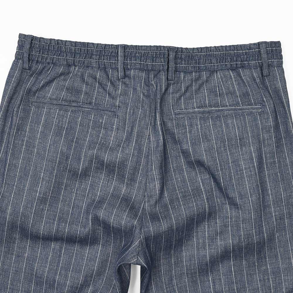 今シーズンに新登場したファブリック“HAIR LINE LINEN”。リネンらしいドライなタッチの質感を持たせながらも、ジャージーのような柔らかさとストレッチ性を持たせた実用的なリネンパンツになります。目付けは270gと軽く、また細いピッチのストライプが清涼感を生んでいる、暑い季節にピッタリな一本となっています。