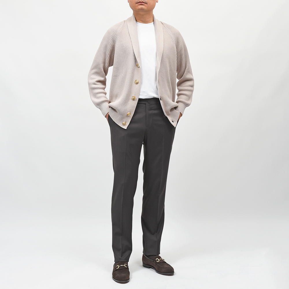 少し薄手のミドルゲージですので、春先や秋口はコートのインナーとして、夏前にはアウターとしても着回せる汎用性を持ちます。