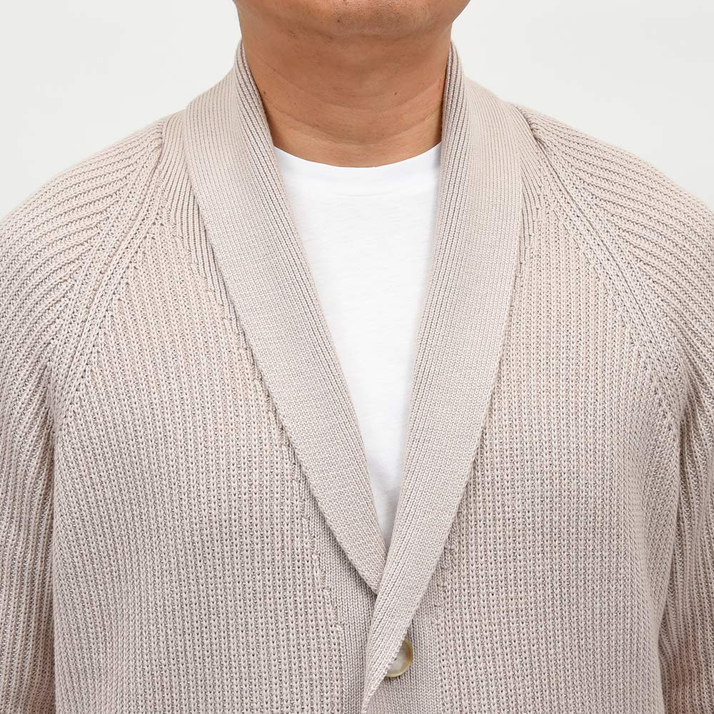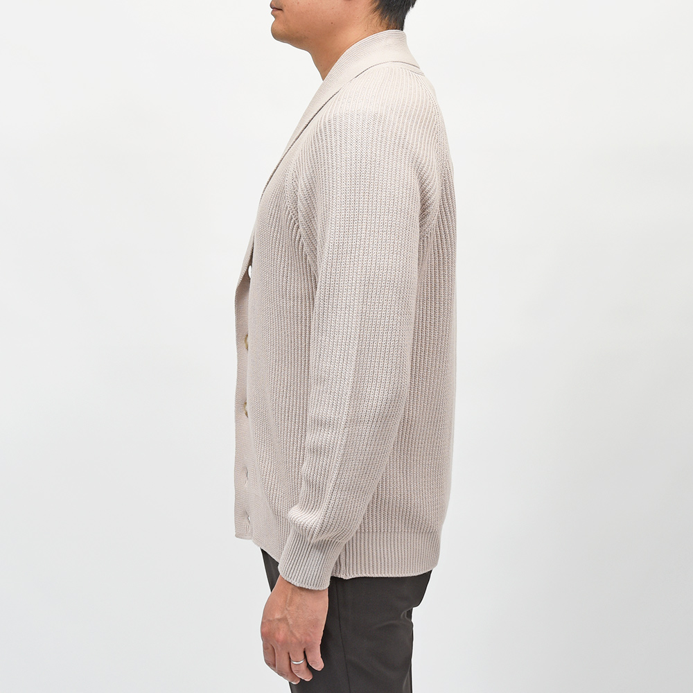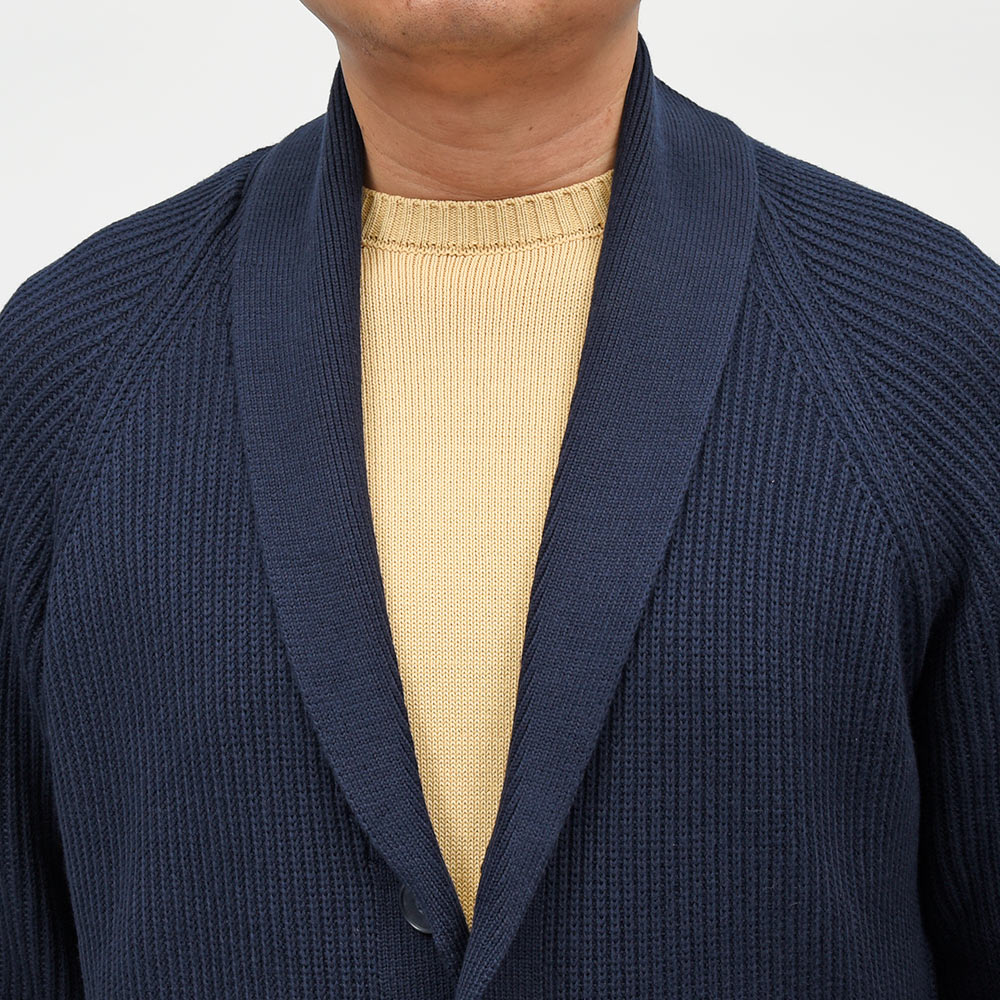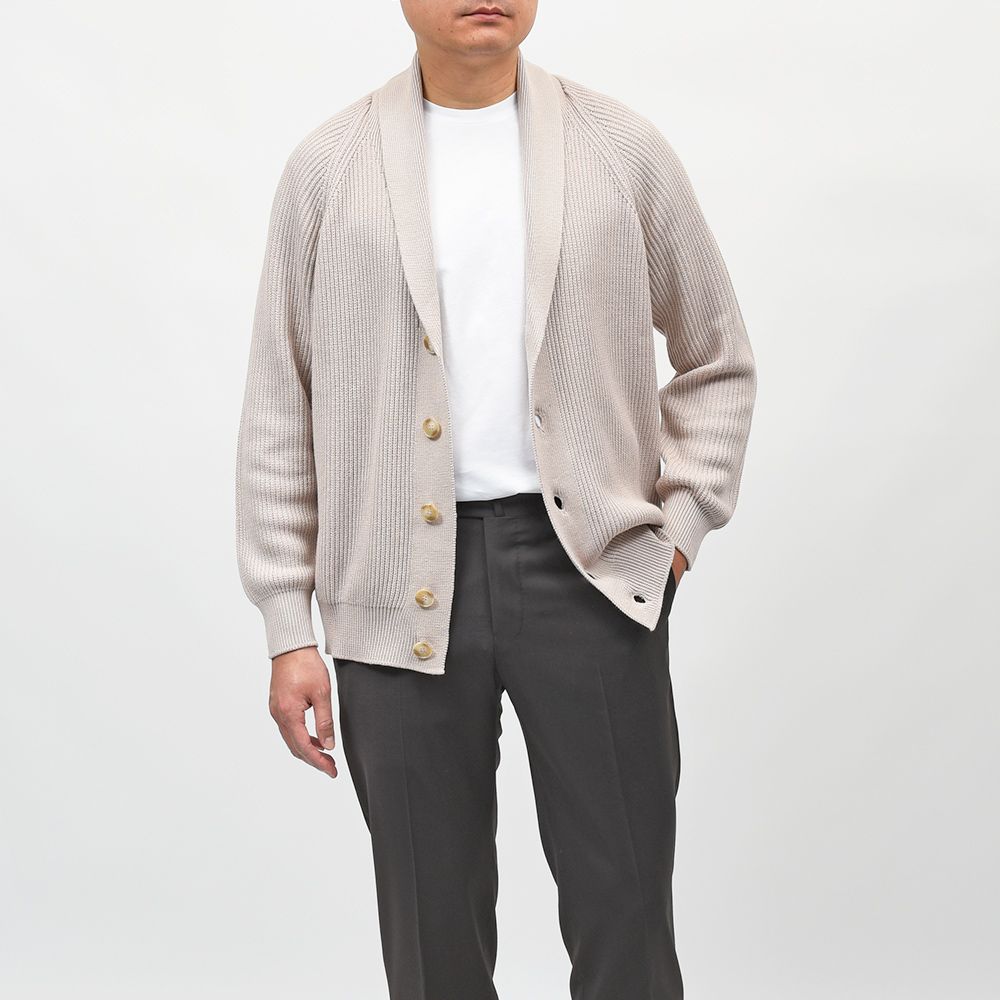 上質なコットン素材を使用した、非常に滑らかで柔らかなタッチのショールカラーカーディガン。タイトではないナチュラルなサイズ感のシルエットは、ショールカラーの上品な雰囲気と合わさり優雅な印象です。ボディはリブ編みを採用しているため表情が生まれており、シンプルなスタイリングでも華のある佇まいを作ることができます。