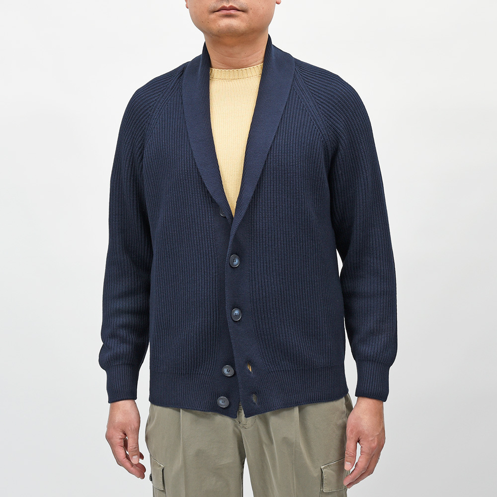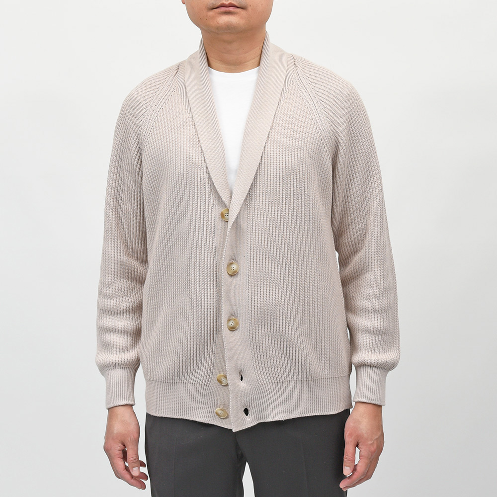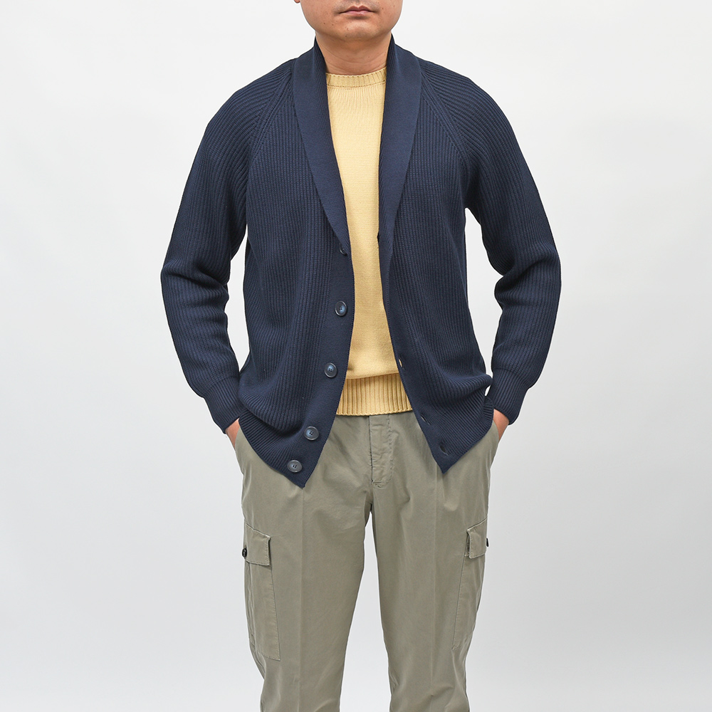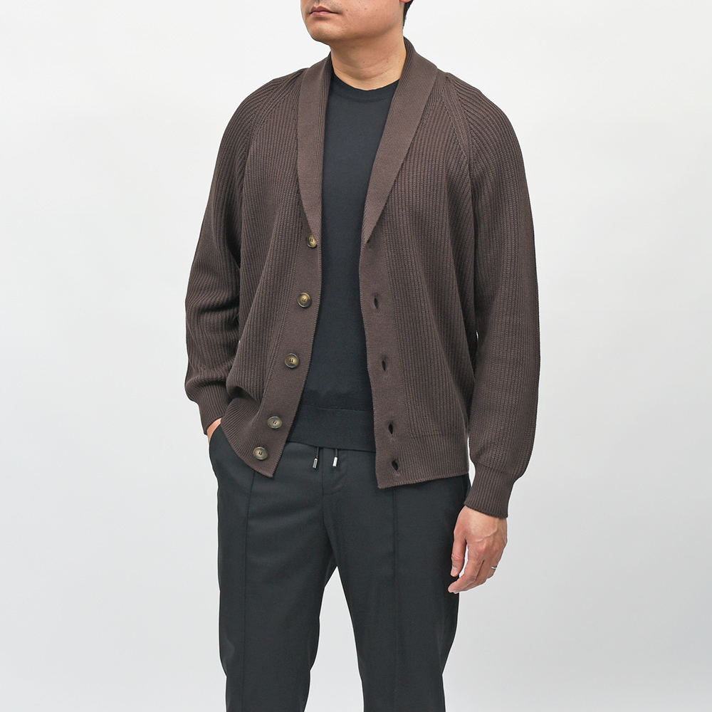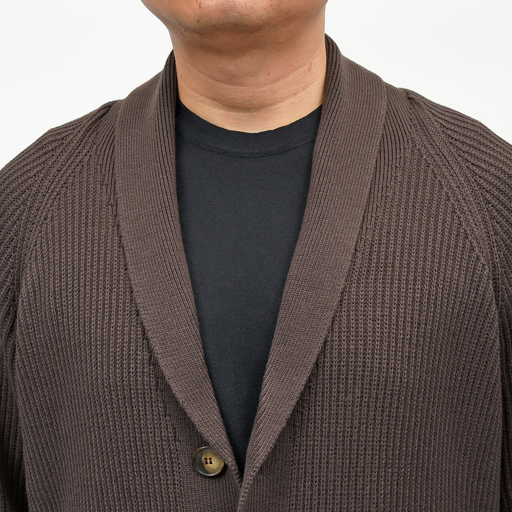 上質なコットン素材を使用した、非常に滑らかで柔らかなタッチのショールカラーカーディガン。タイトではないナチュラルなサイズ感のシルエットは、ショールカラーの上品な雰囲気と合わさり優雅な印象です。ボディはリブ編みを採用しているため表情が生まれており、シンプルなスタイリングでも華のある佇まいを作ることができます。
