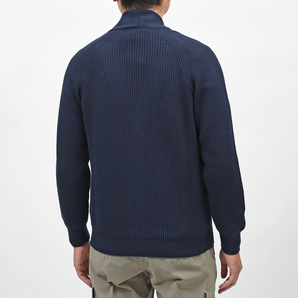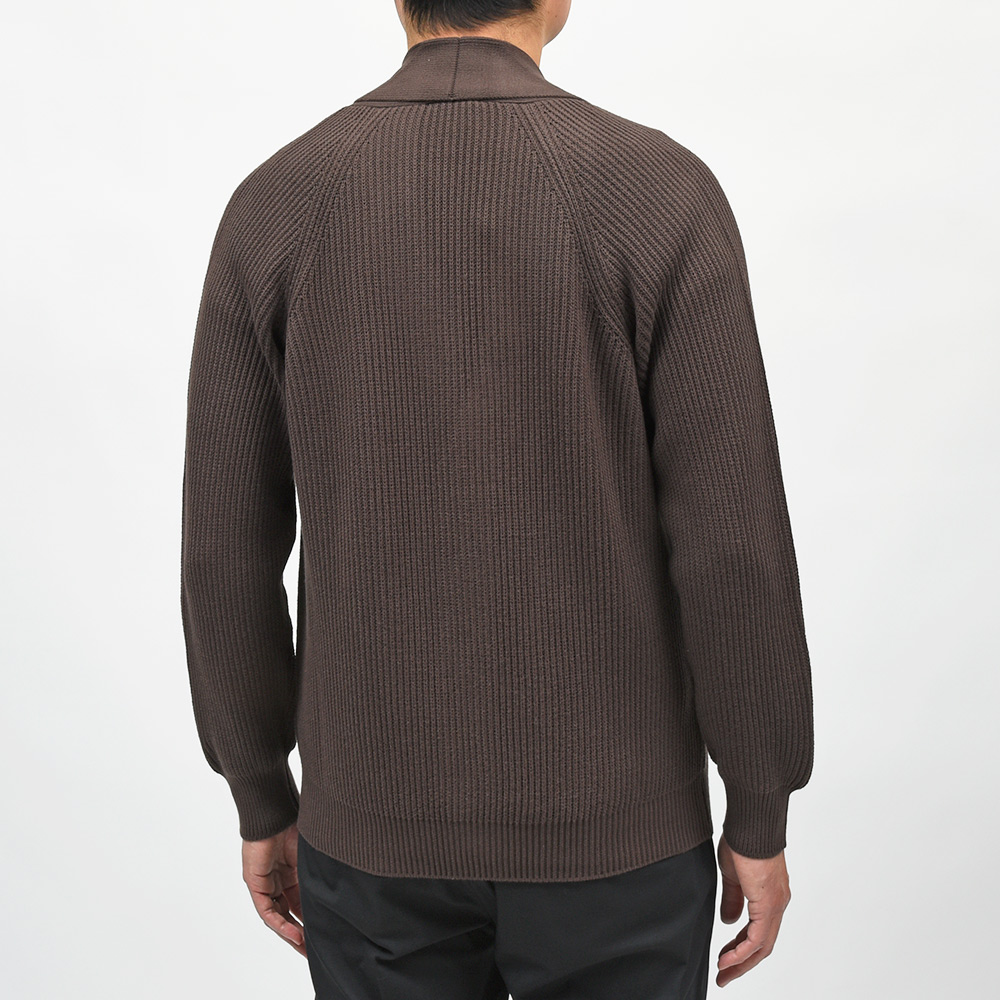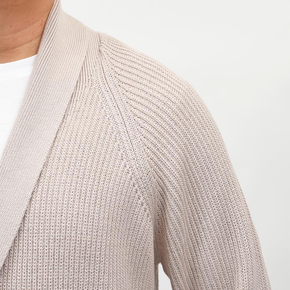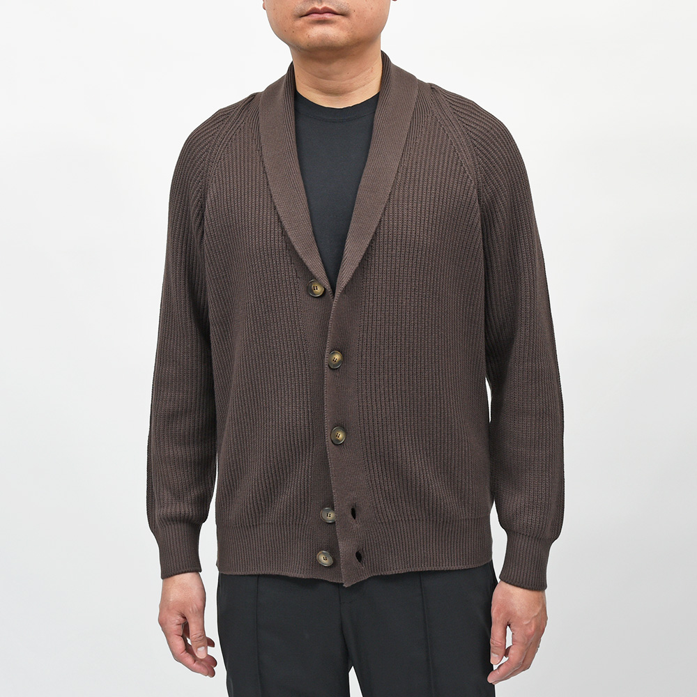 上質なコットン素材を使用した、非常に滑らかで柔らかなタッチのショールカラーカーディガン。タイトではないナチュラルなサイズ感のシルエットは、ショールカラーの上品な雰囲気と合わさり優雅な印象です。ボディはリブ編みを採用しているため表情が生まれており、シンプルなスタイリングでも華のある佇まいを作ることができます。
