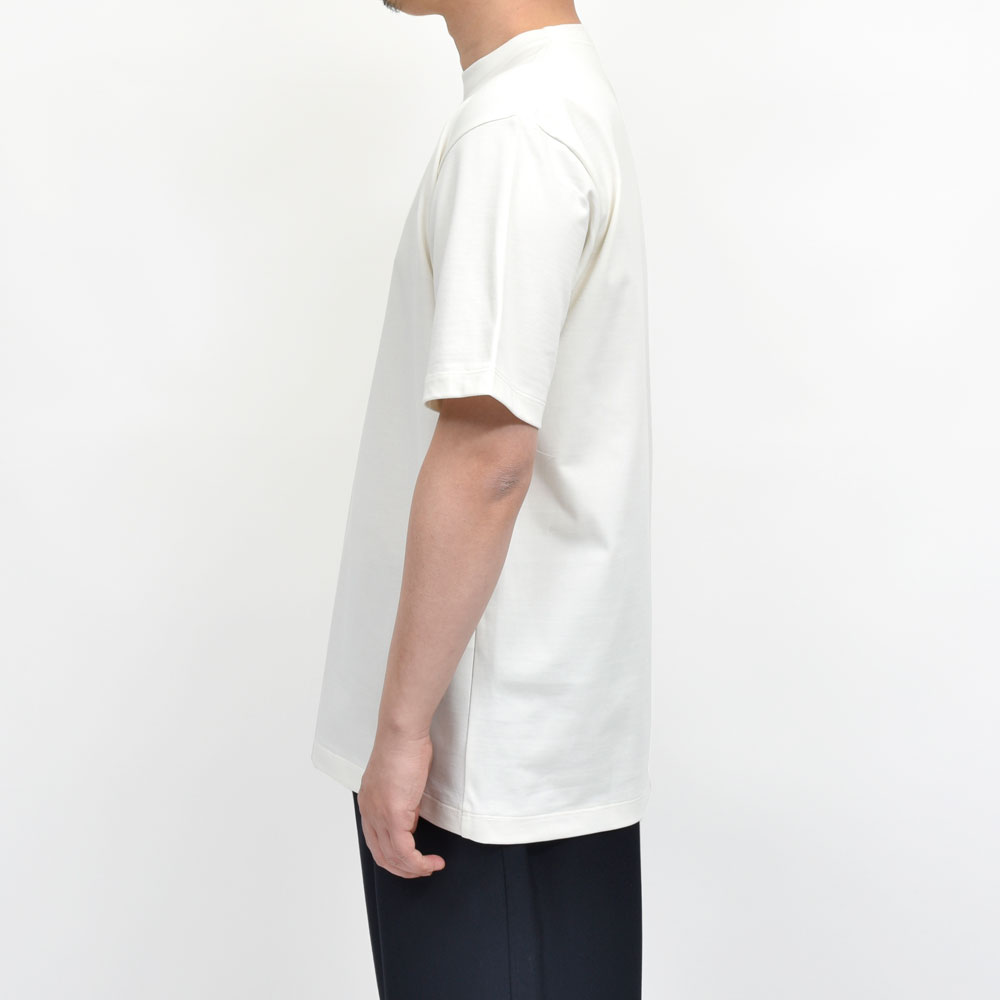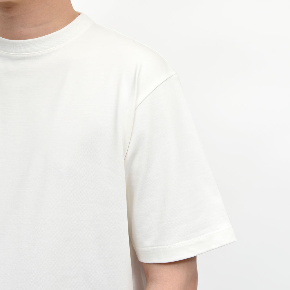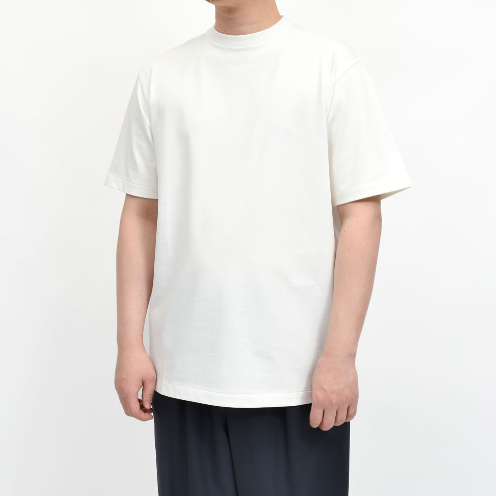 ジャケットやアウターのインにゴワつくことなく着られますし、一枚着としても様になる仕上がりで、ドレスとカジュアルを垣根なく愛する小山氏らしいカットソーと言えるのではないでしょうか。