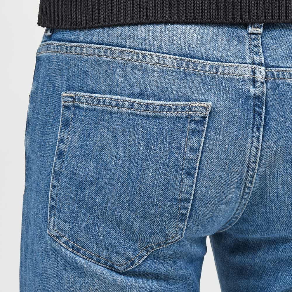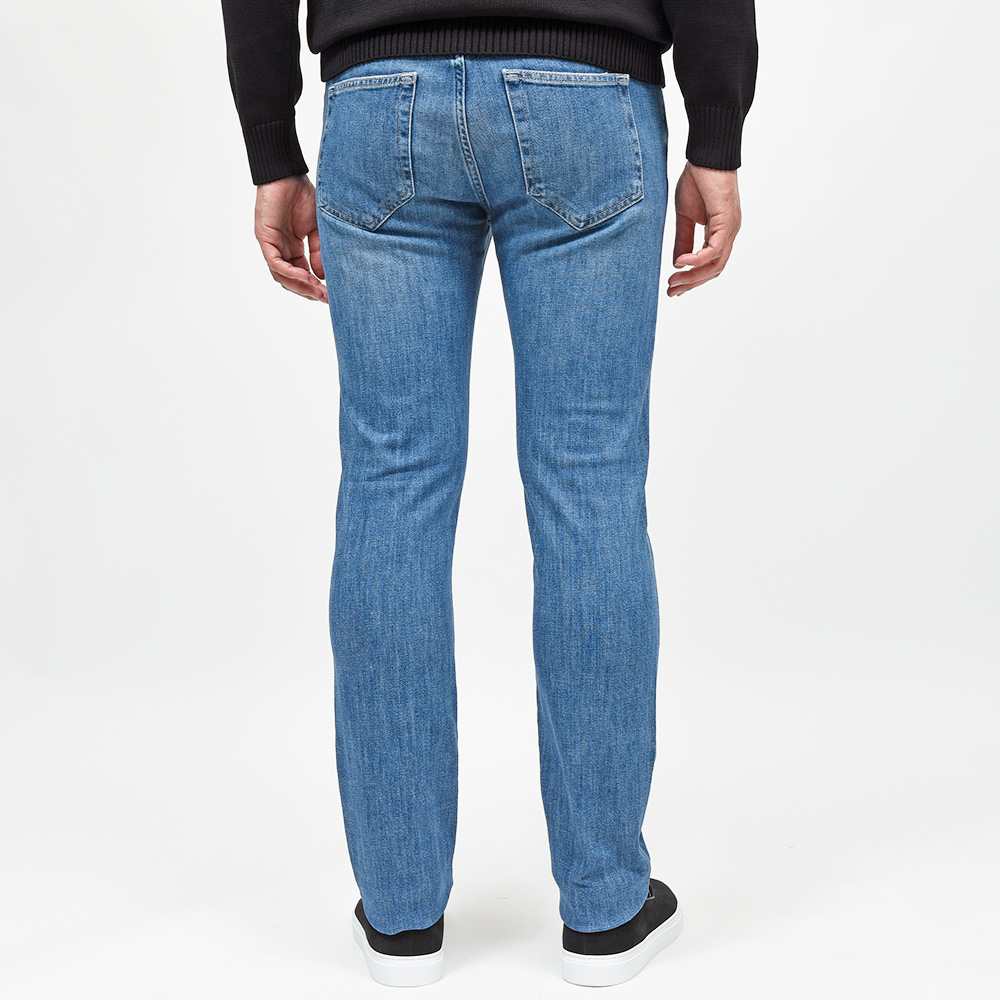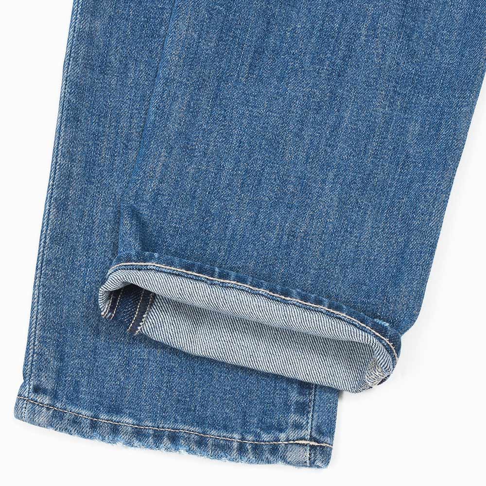 ややライトなトーンまでウォッシュ加工を施したこちらは、アタリ感を抑えたクリーンな表情を作り上げています。また、程よくストレッチの効いたコットン主体のファブリックを使用していますので、その穿き心地は言わずもがな。ガンメタリックのボタンに、ベージュのステッチ、高級感のあるスエードの革パッチが大人の色気を演出してくれます。