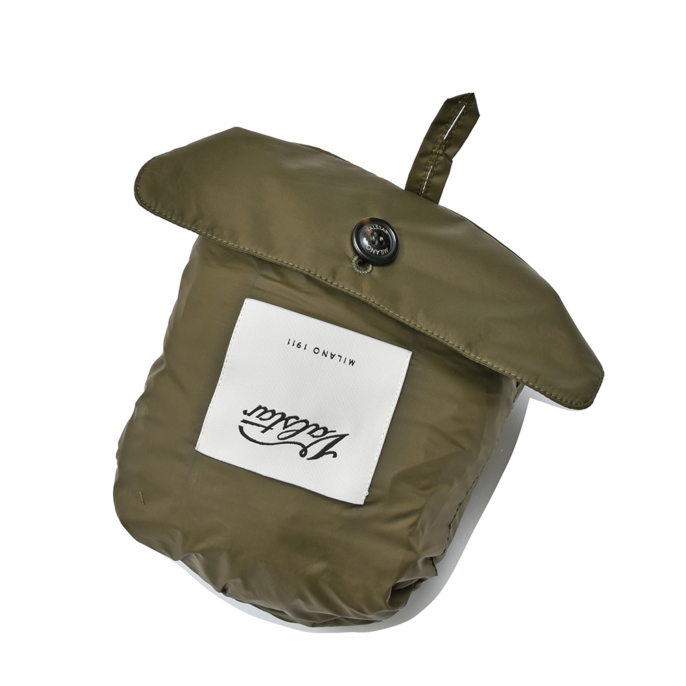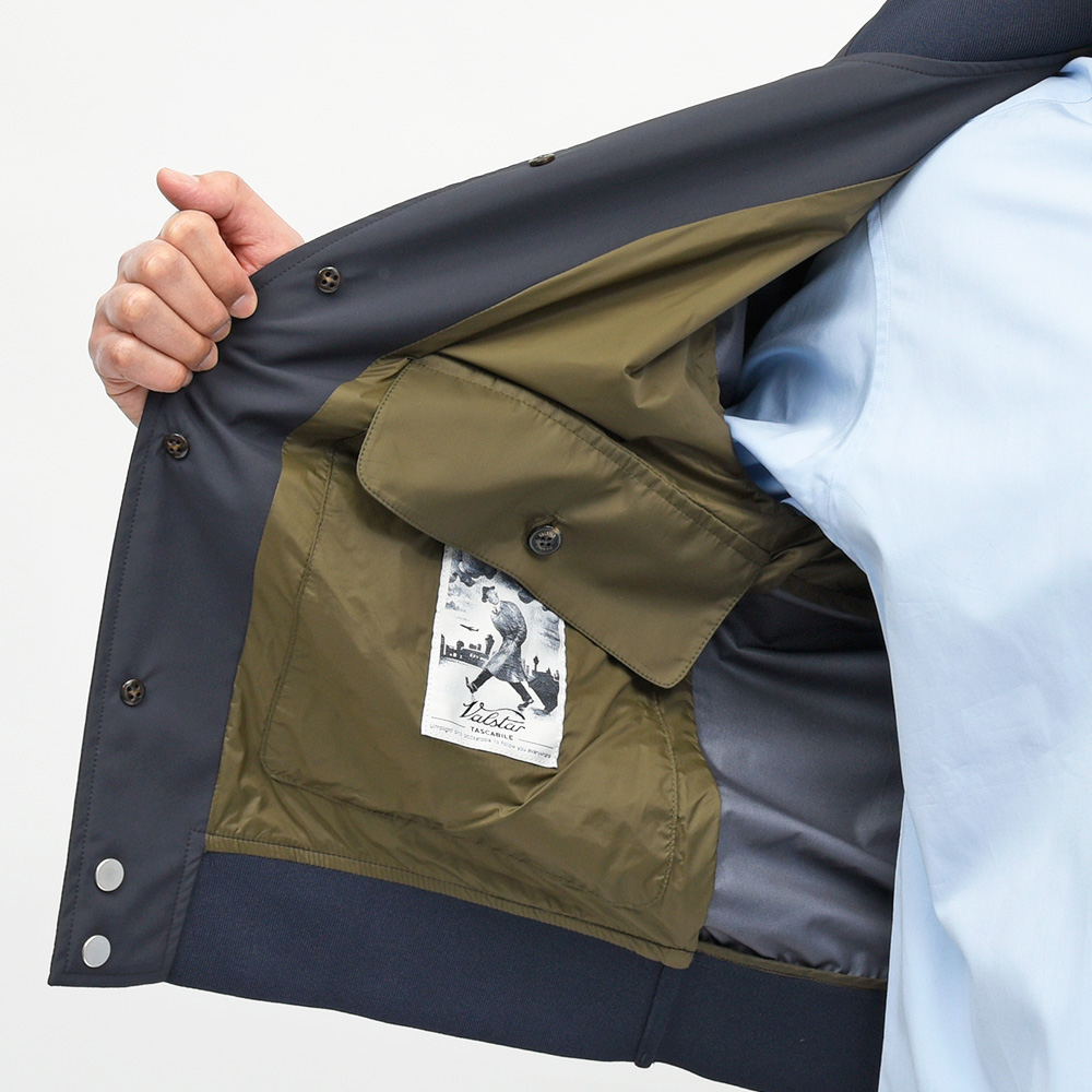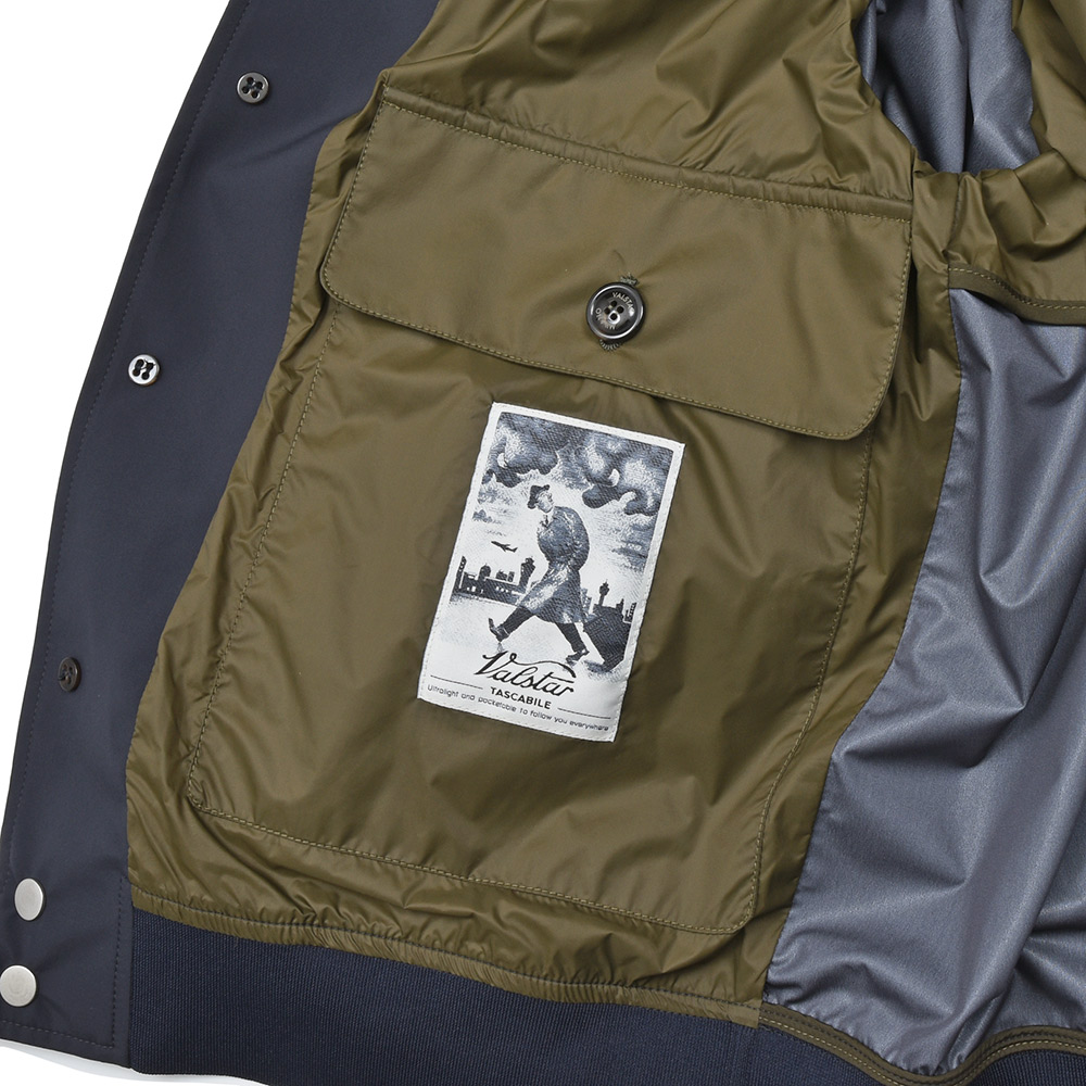 こちらは、撥水性と通気性を備えた超軽量ポリエステル素材を使用。シワにもなりにくく、リブも通常よりも薄手のものを使用していますので、右前身頃の裏地に取り付けられているポケットに折り畳んで収納することができ、パッカブルとしても非常に重宝する一品です。