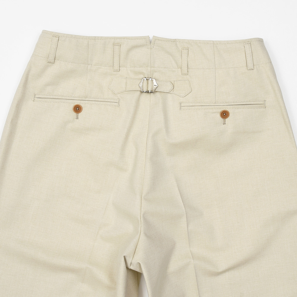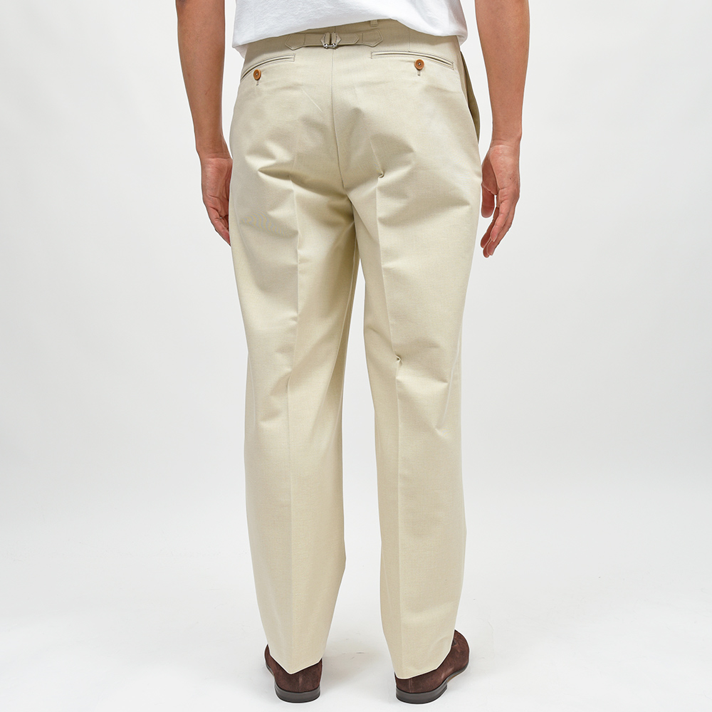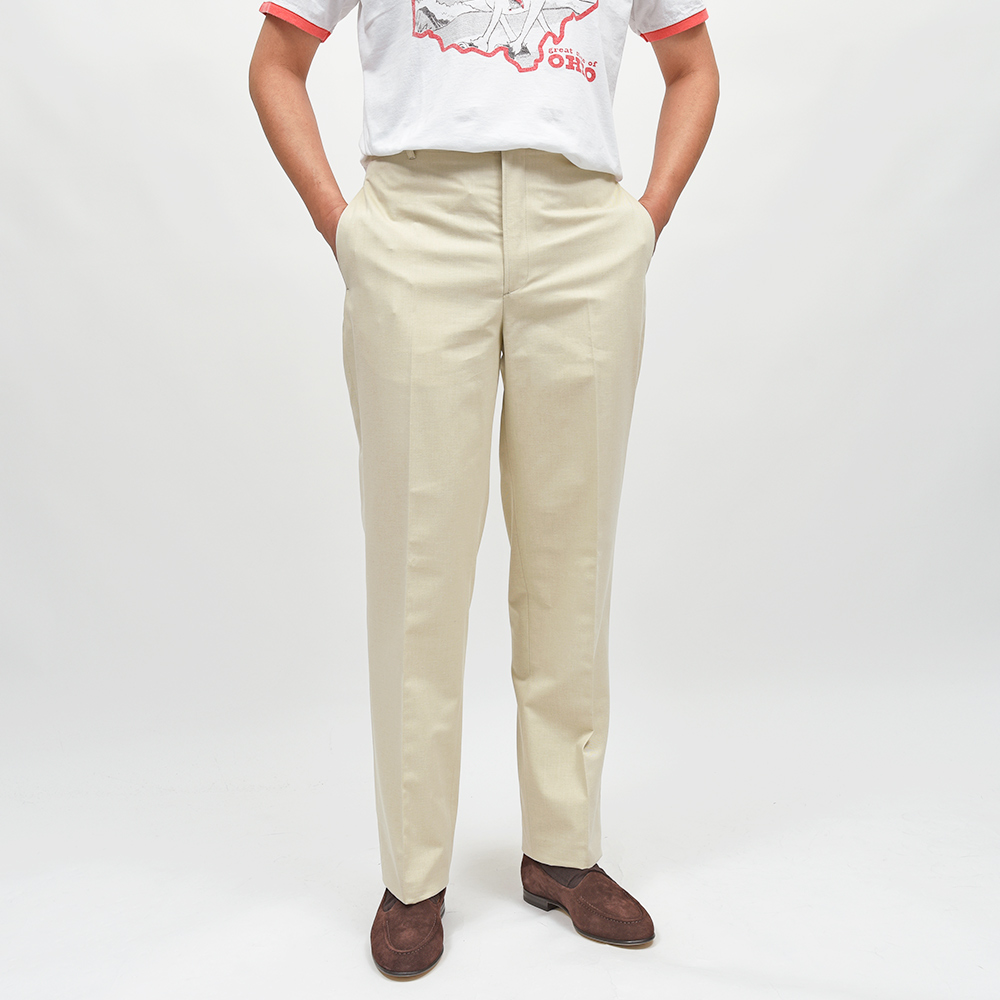 モデル“SPENDER(スペンダー)”は1970〜80年代パリを代表するのセレクトショップの一つHEMISPHERES(エミスフェール)が、BERNARD ZINSに別注していたモデルの復刻になります。切り替えのないワンピースカットにややハイバックなウエストに、ノープリーツのスッキリとした腰回りと、特徴的なシンチバック。ストレートに見える緩やかなテーパードシルエットが、今の気分にはピッタリな表情を作り上げてくれます。