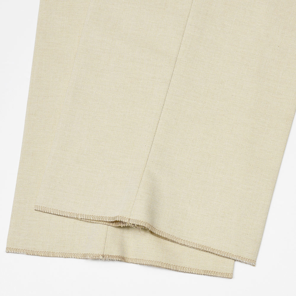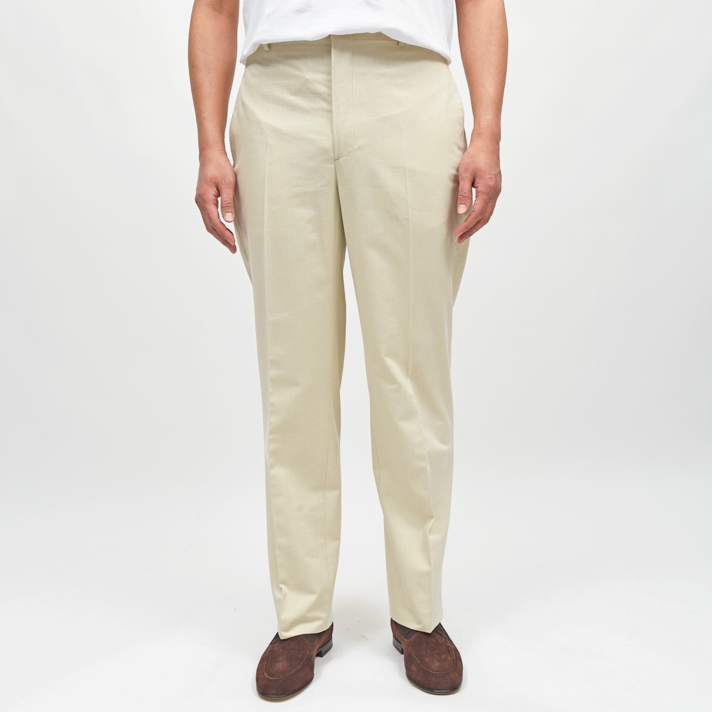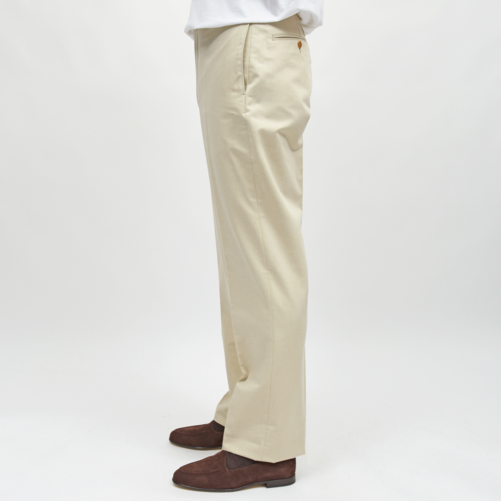 目付け310gのコットンポリエステル生地は、薄手の生地感で少しドライなタッチになっています。清涼感はありながらも、ツイル織りなので秋まで着用しても問題ありません。メランジを効かせた深みのある生地感が特徴のチノパンです。