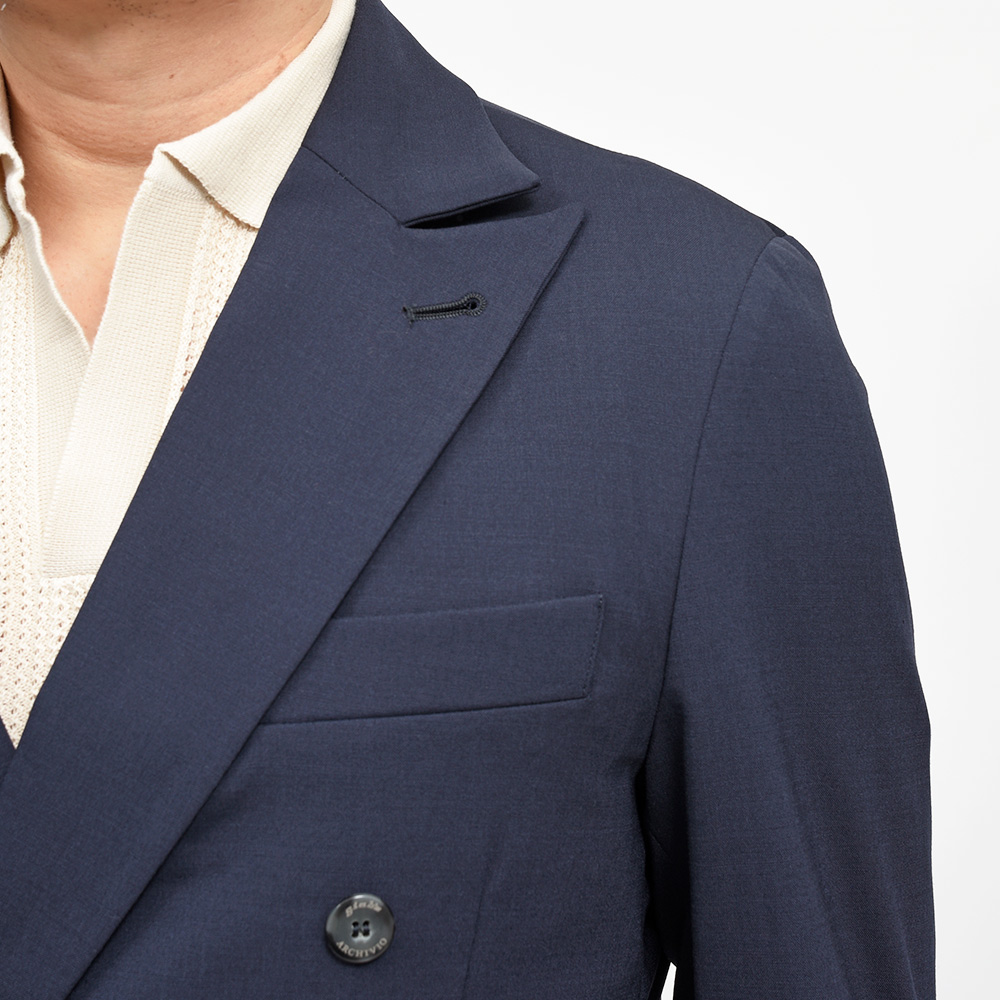 シンプルなコーディネイトでもダブルブレストのジャケットであれば、サマになるスタイルを作り上げてくれます。