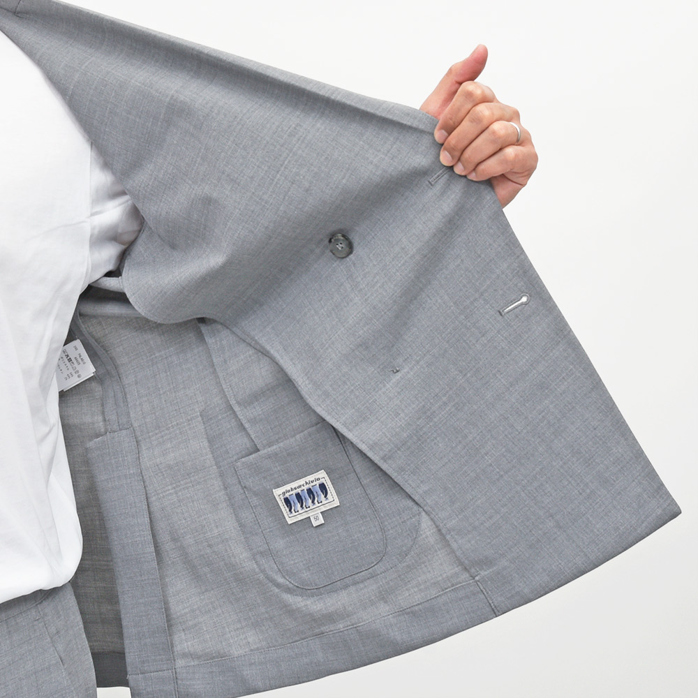 ダブルブレストのモデル“PALAGIO(パラジオ)”。今シーズンはコレクションに入っていなかったモデルですが、ringだけで限定復活しました。人気のシングルジャケット同様に、アンコン仕立てで裏地も無く、袖は筒袖仕上げ。あくまでも気軽に羽織れるシャツジャケットの仕上がりとなっています。また、通常のスペックよりも着丈を少し短くすることでバランスを整えた別注仕様です。