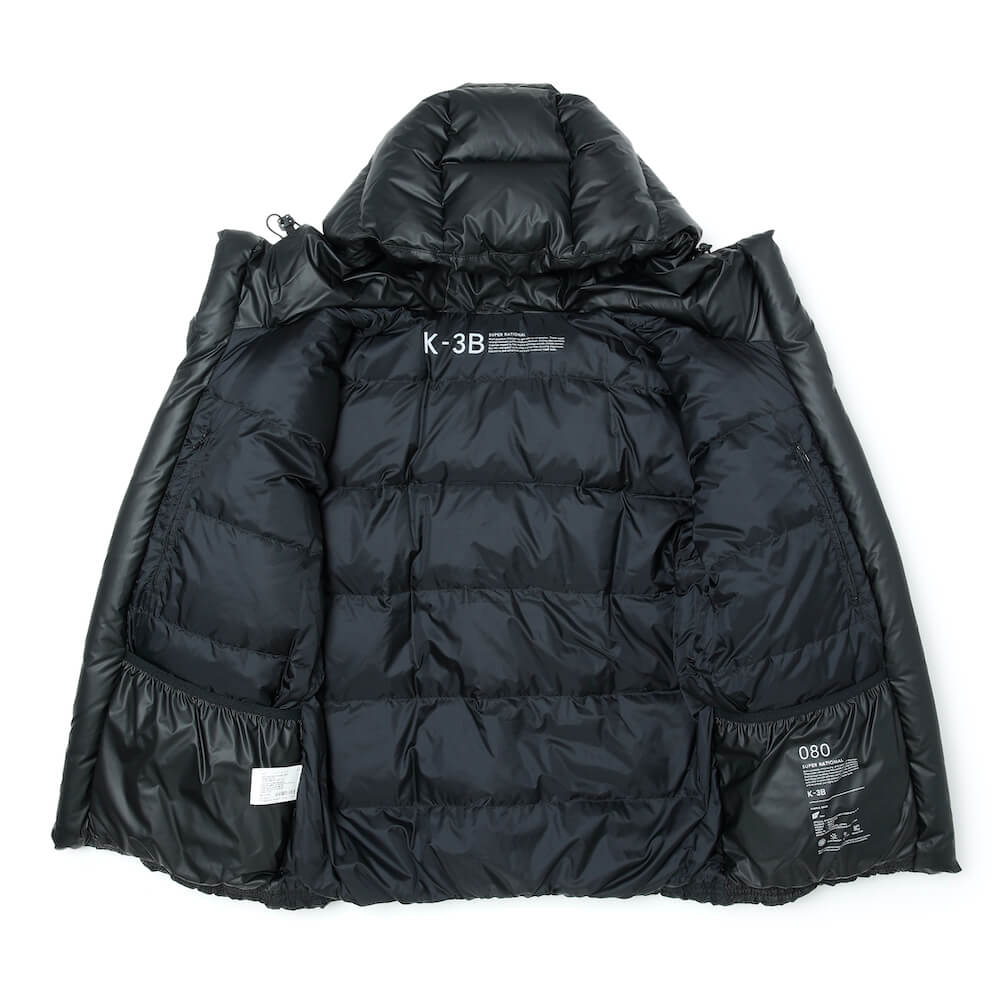 K-3Bのダウンは、縫い目から冷たい外気が入り込み、暖かい空気が逃げる「コールドスポット」を徹底的に抑えた設計です。通常のダウンジャケットはキルティングの縫い目が冷気の侵入口となりますが、本製品では縫い目の裏側にもダウンチューブを重ね、針穴部分を裏側のダウンで塞ぐことで外気を通しにくく、内側の熱を逃しにくくしています。この2層のダウンチューブは身頃全体に配置され、通常の約2倍の羽毛量を使用することで高い保温性を実現しています。