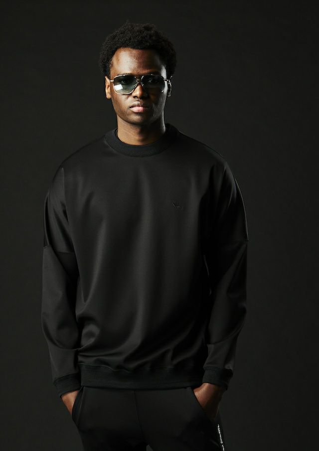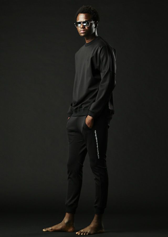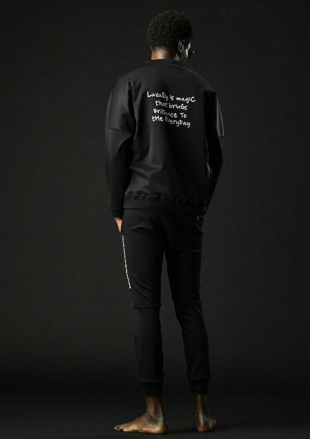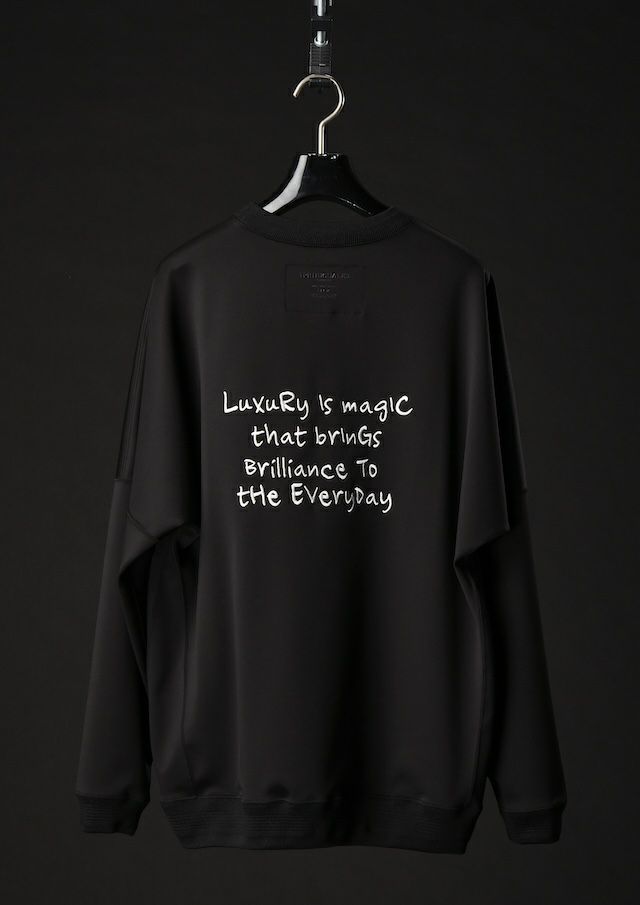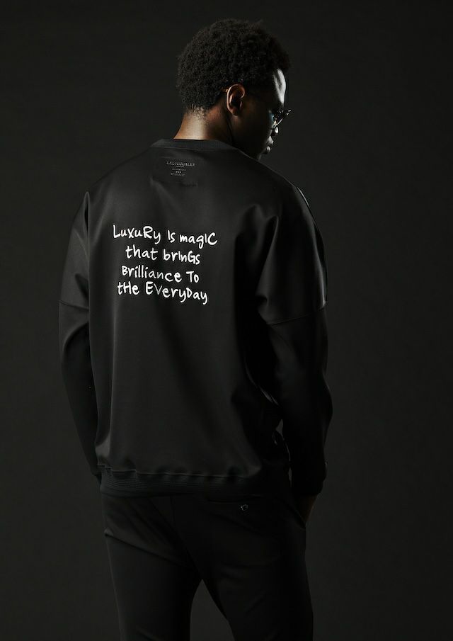 「至高の肌触りと超絶スムースな機能素材」PREMIUM BOOST JERSEY。極細の合繊繊維にハイパーストレッチ糸をプレーティングし、圧縮加工を施すことで高密度かつ力強いキックバックを実現しました。本プロジェクトの始動当初より繰り返しアップデートされてきたハイパーストレッチシリーズの新素材となるコレクション。究極の肌触りと鋭い伸縮性を兼ね備えた最新素材を使用しています。給水速乾、UV軽減、冷感接触、上質さと機能性を高い次元で両立させ完全ノンストレスな着心地を提供します。前作から素材と資材を大幅にグレードアップ。厳選された素材が生み出す風合いは、触れるだけでその品質の高さを実感させます。パターン数を増やし、立体的な設計を追求。フィット感が向上と抜群の伸縮性。縫製技術の精度、仕上がりの美しさ含め極上のディティールワークを実現しました。ルーズフィットクルーは、時代の進化を体現した一着へと生まれ変わった。大人のためのワイドシルエットは、立体裁断と精密な縫製技術によって、単なる「ゆったり感」を超えたセクシーさを備えている。ドロップショルダーの設計が肩からのラインを美しく演出し、肘から袖先にかけてのフィット感が、新たなリラックスフィットとして洗練の極みに達した。これまでの定番モデルにマイナーチェンジを施し、より現代的な装いを提供するこのモデルは、ファッションの最前線に立つ大人のワードローブに不可欠だ。動きやすさとデザイン性を両立させ単なる「ルーズ」の枠を超えた進化系アイテム。その存在感は他の追随を許さない。(付け襟/両袖/裾には113SPORT専用に作成された特殊編みのジャガードリブは、編み方を上下で組み替え、立体的に表現されたハイスペックリブ=3段BKリブ)RICH BLACKをテーマに表現されるメッセージを刻印。
