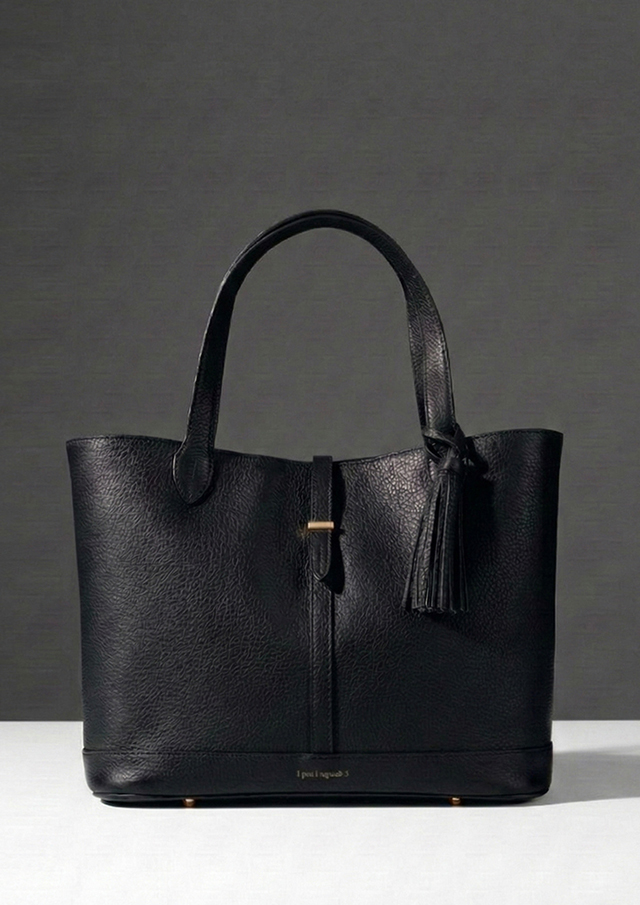 きめ細やかなシボ感が光を美しく反射し、バッグ全体に深い奥行きを与えます。ブランドアイコンである取り外し可能なタッセルが歩くたびに揺れ、シンプルなトートバッグに優雅なアクセントと遊び心を添えています。