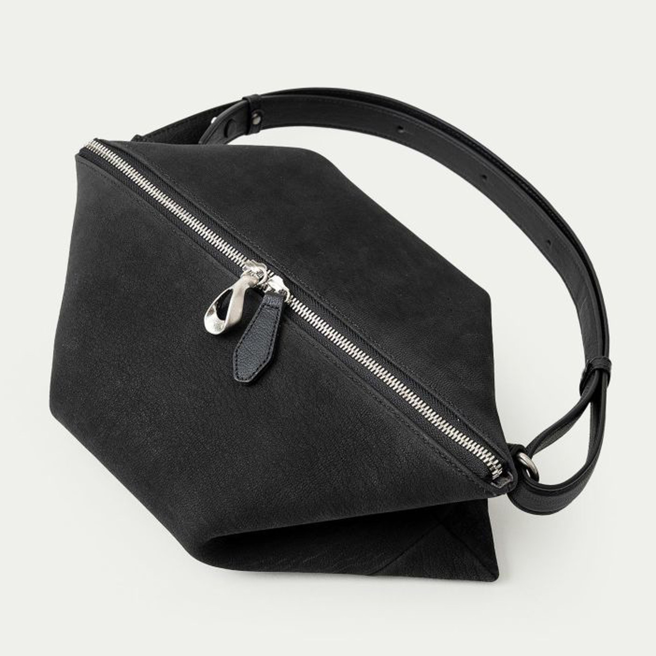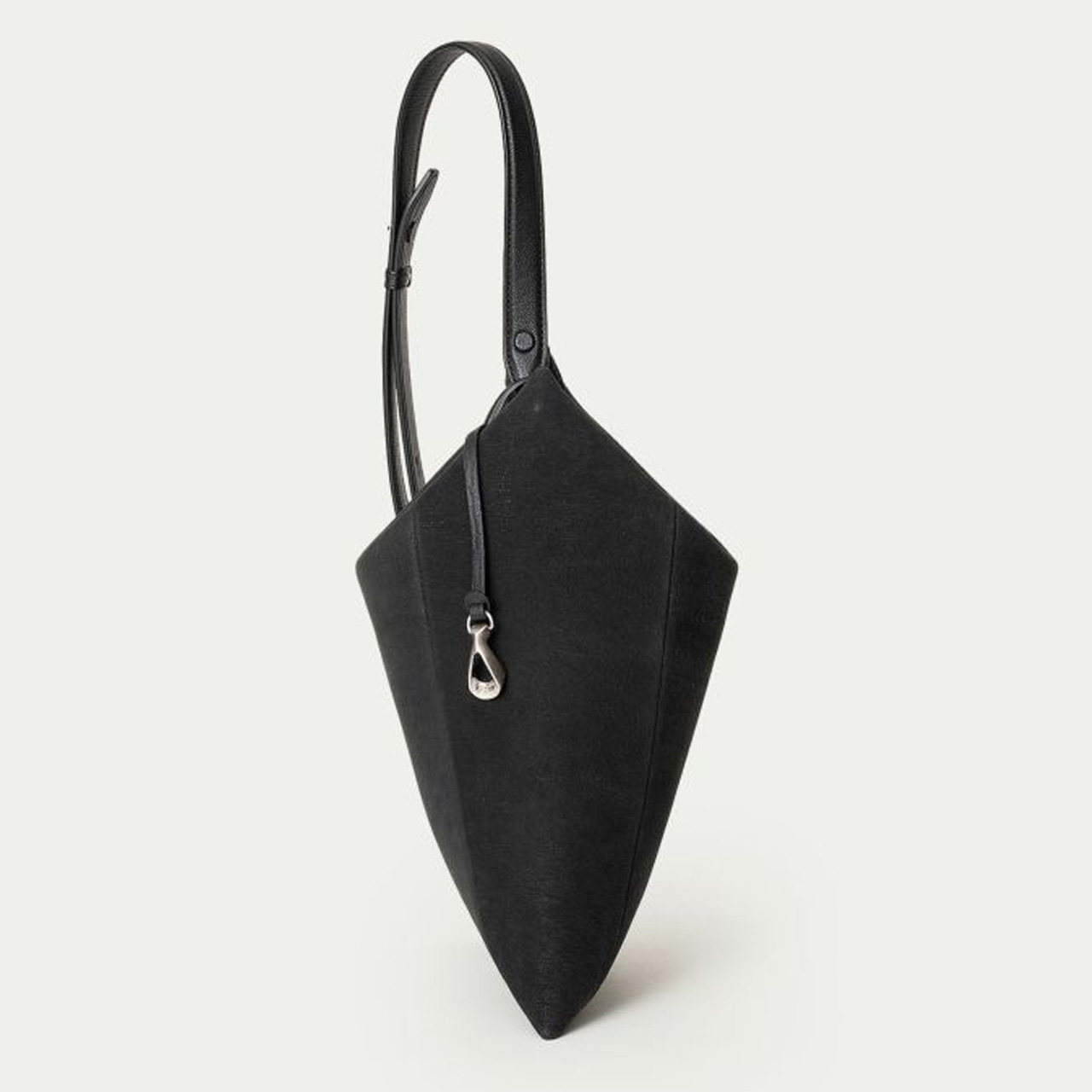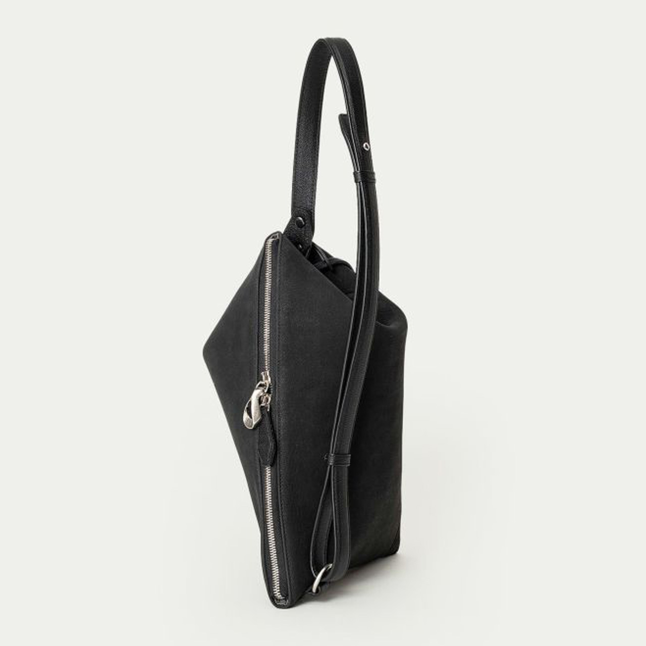 ボディとショルダーベルトの接続用に開発したオリジナル金具が、たわみが美しい巾着のような独特のシルエットを生み、トライアングルを想わせる端正なラインを描き出しています。
