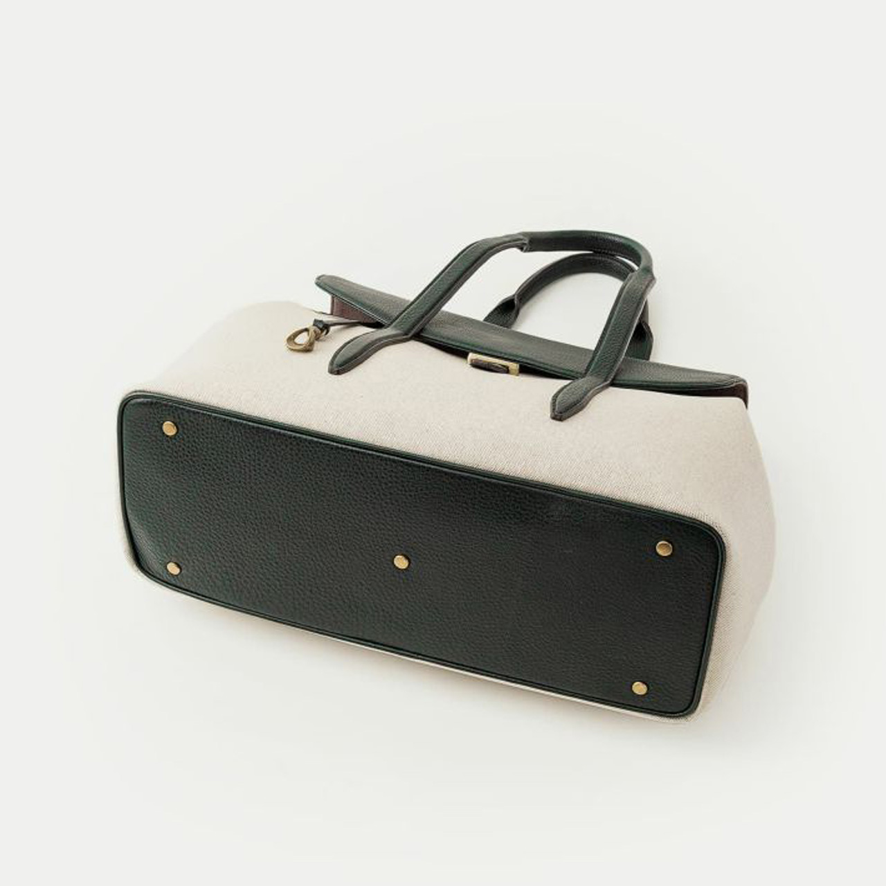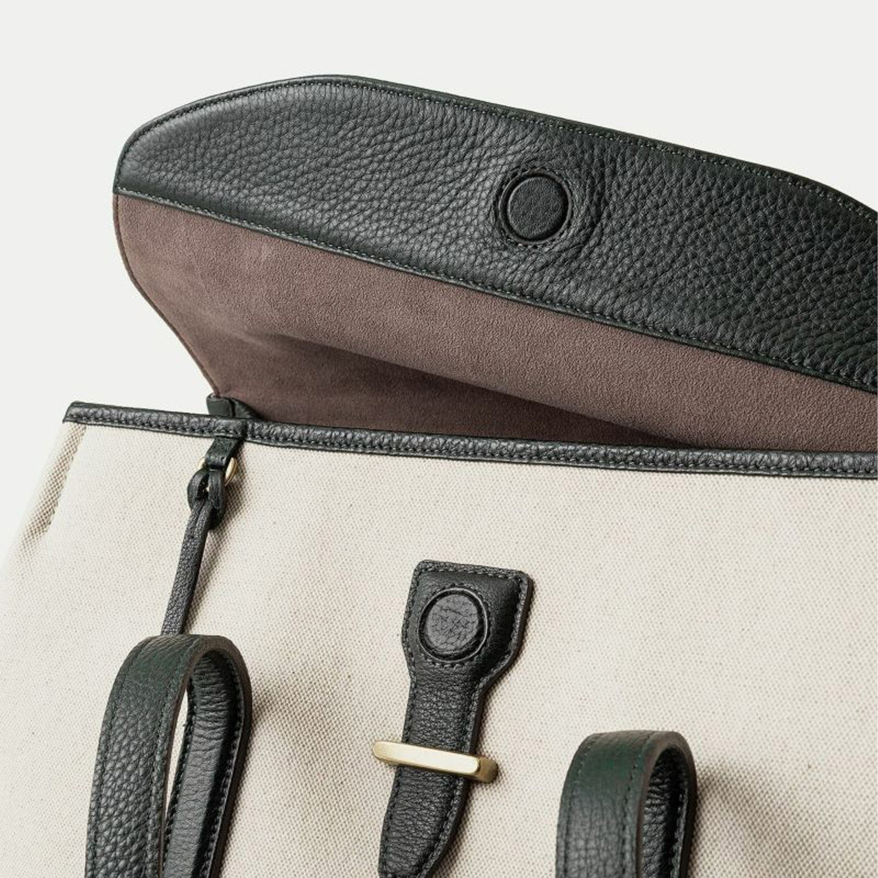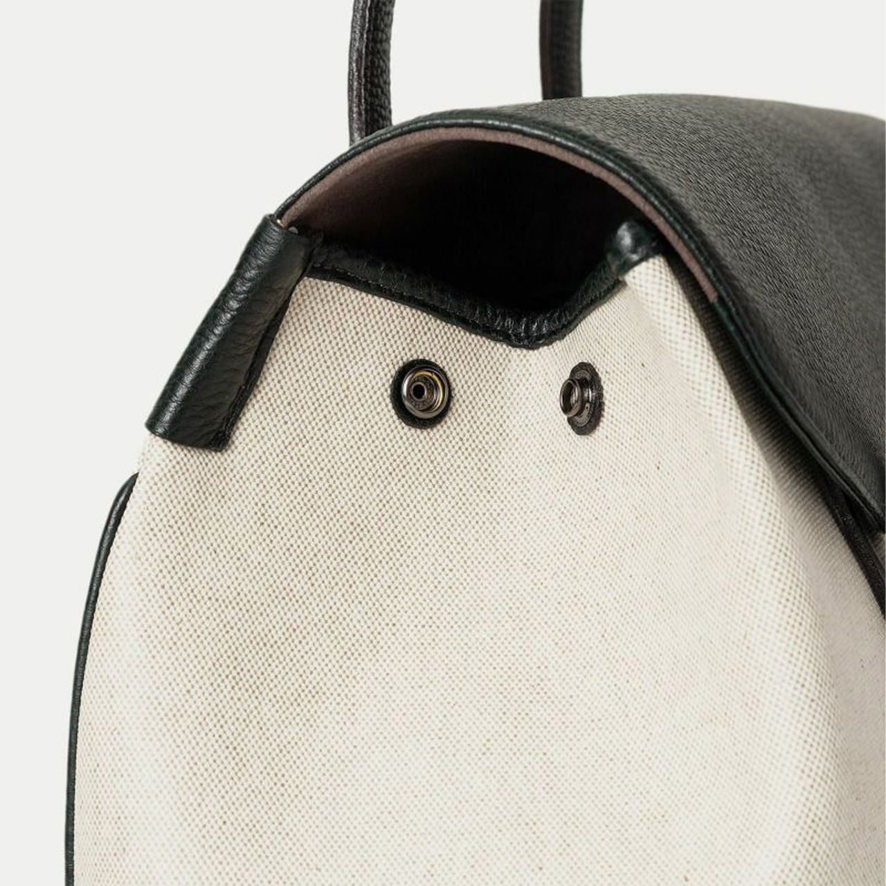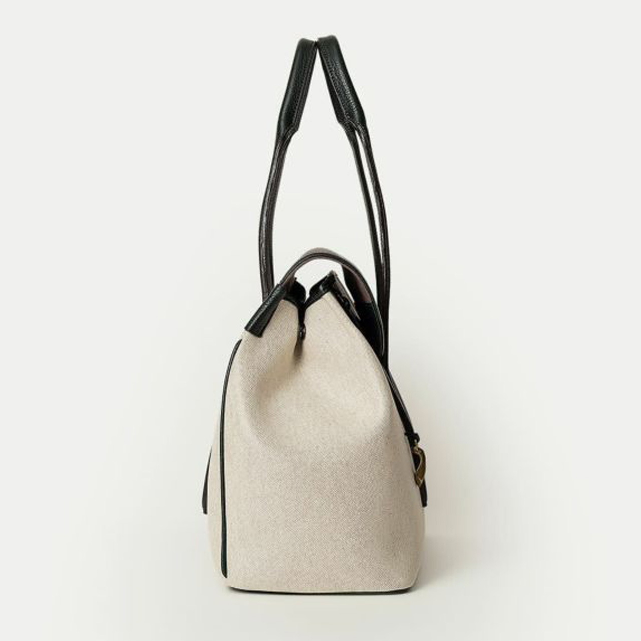 フロントとマチが一体になった、「キャンバス生地」一枚仕立てにすることで、ふっくらとした美しいシルエットを叶えるとともに、サイドに設けられたスナップボタンでマチ幅を調整できたり、フラップをイミテーションの差し込み金具にしてマグネットで簡単に開け閉めできたりするなど、エレガントなデザイン性とカジュアルな機能性を併せ持っています。