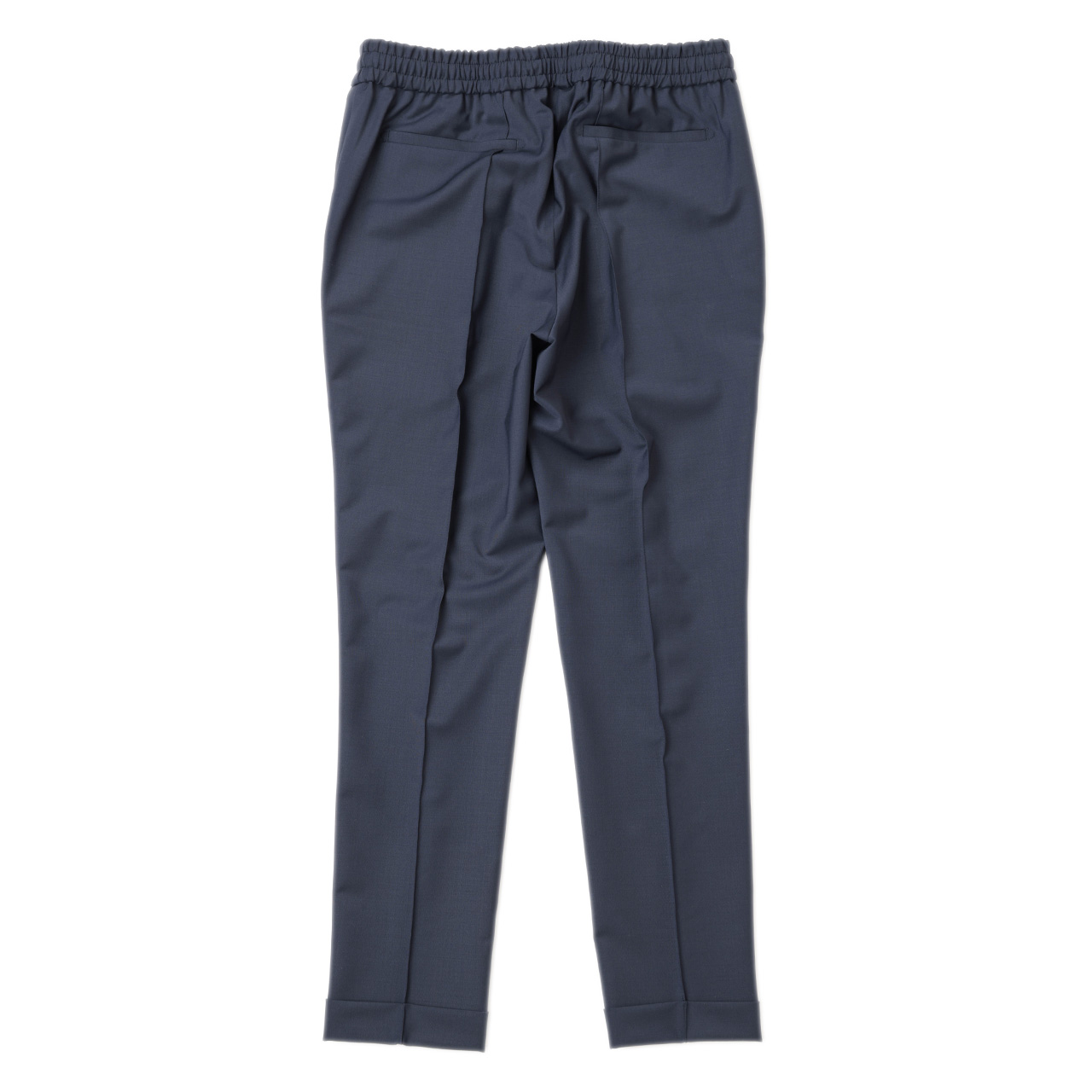 ウエストゴム+ドローコードのコンフォートな仕様にスラックスの様な裾のダブルの仕上げ、そして最大の特徴である「前後の永久クリース」。