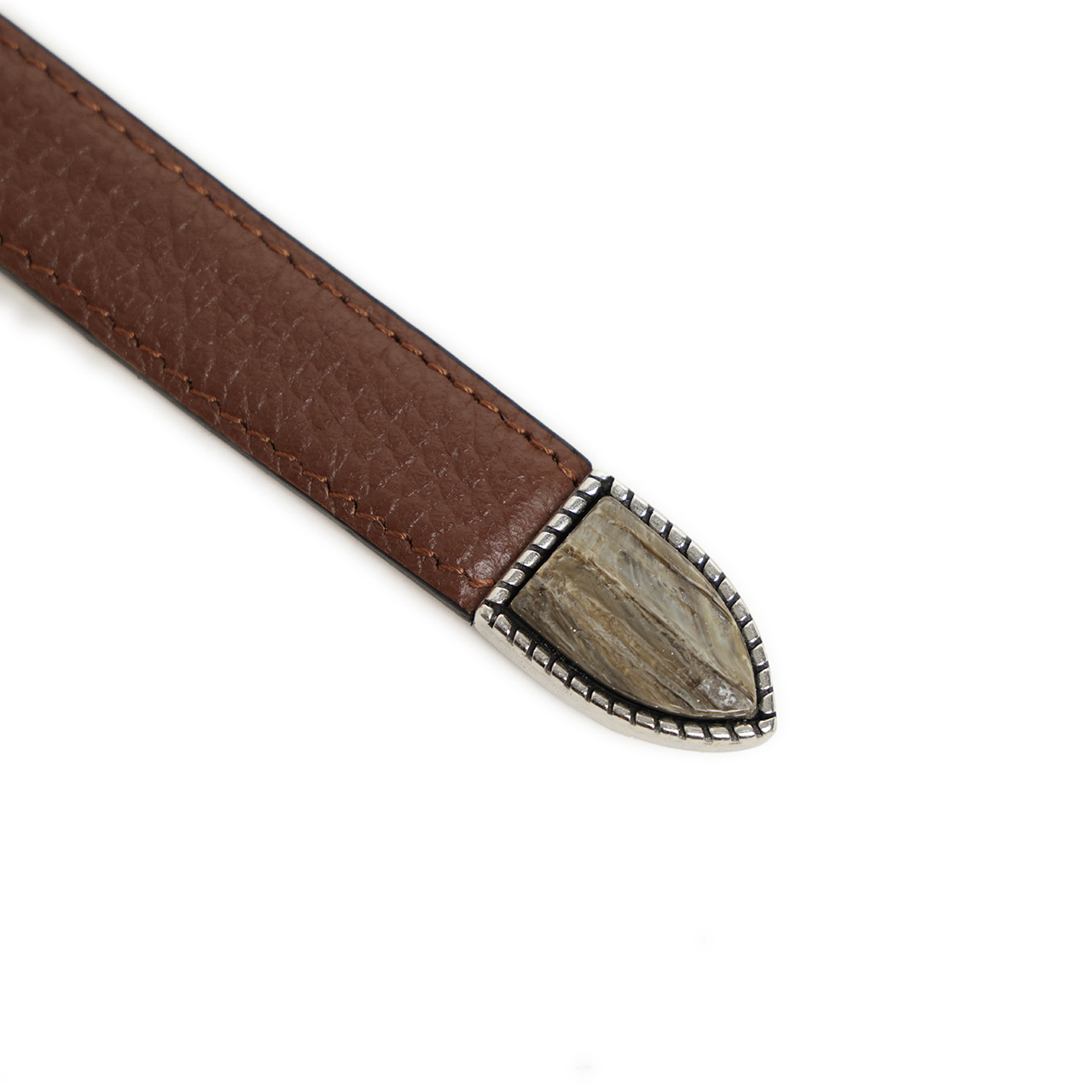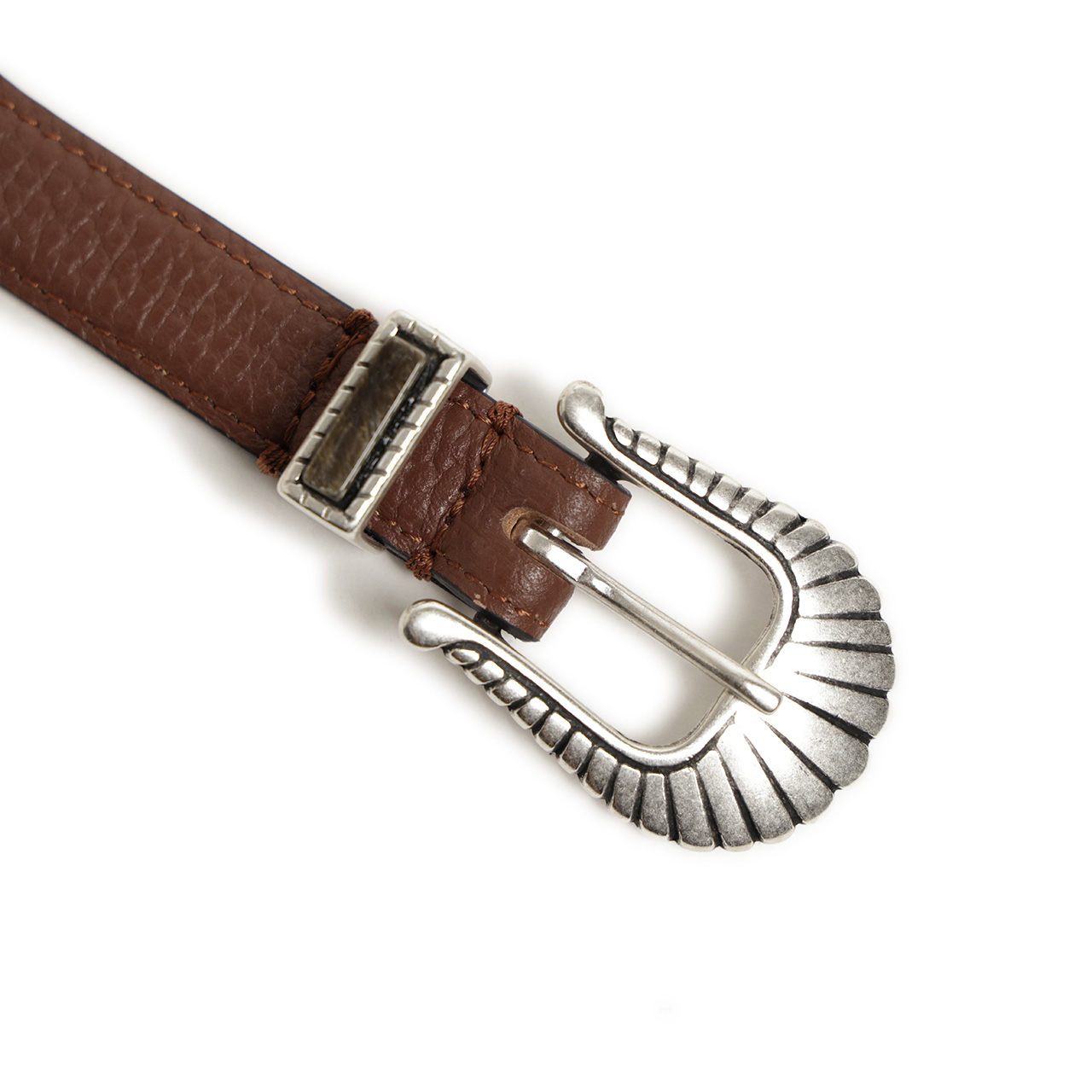 素材には上質なレザーを使用。細かなシボの入ったレザーはもちっとしてソフト、上質なレザーならではの自然な艶が感じられます。遊革、剣先部分にはウエスタン調のバックル、プンターレ、更にストーンも合わせ、エレガントさと男臭さを併せ持った一本となっております。
