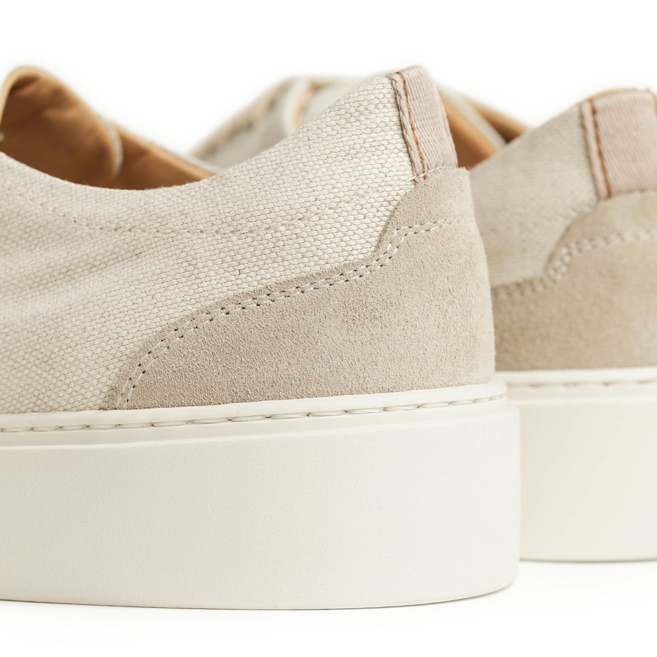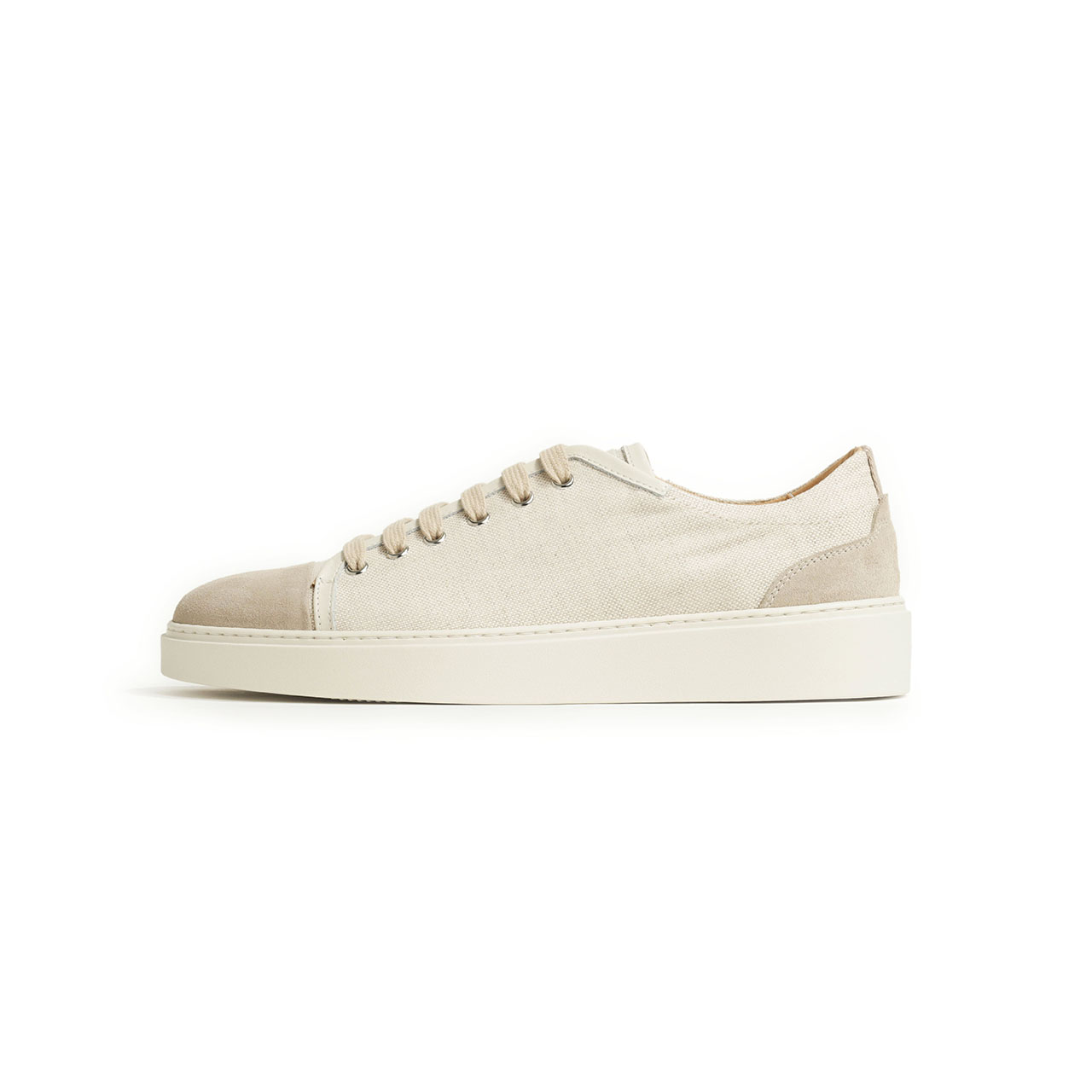 アッパーは春夏シーズンにピッタリのキャンバス素材をベースに、ヒールとトゥをスエードで切り替え。レザーでパイピングも施し、キャンバススニーカーに品をプラスしました。